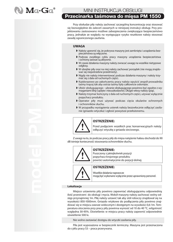 MINI INSTRUKCJA OBSŁUGI Przecinarka taśmowa do mięsa PM 1550 Przy obsłudze piły należy zachować szczególną koncentrację oraz stosować się bezwzględnie do zaleceń zawartych w niniejszej instrukcji obsługi. Przy projektowaniu zastosowano możliwe zabezpieczenia zwiększające bezpieczeństwo pracy, jednakże ze względu na występujące ryzyko resztkowe należy stosować zasadę ograniczonego zaufania. model PM 1550 UWAGA Z Należy upewnić się, że pokrywa maszyny jest zamknięta i urządzenia bezpieczeństwa są włączone. Z Podczas zwykłego cyklu pracy maszyny urządzenia bezpieczeństwa i ochrony zawsze są aktywne. Z W czasie działania maszyny należy zwracać uwagę na wszelkie nietypowe odgłosy. Z W obrębie piły oraz na niej należy zachować porządek (nie mogą znajdować się niepotrzebne przedmioty). Z Nigdy nie należy interweniować podczas działania maszyny i należy trzymać się z dala od ruchomych części. Z Każdorazowo po zakończeniu pracy należy opuścić zespół prowadnika taśmy tnącej tak aby ostrza taśmy były całkowicie osłonięte. Z Ubiór obsługującego - ubranie obsługującego powinno być zgodne z wymaganiami bhp (upięte i nieuszkodzone). Długie włosy należy spiąć. Z Należy trzymać kończyny z dala od ruchomych części, używać wyłącznie popychacz produktu. Z Operator piły musi używać podczas cięcia okularów ochronnych i ochronników słuchu. Z W przypadku wystąpienia usterek należy bezzwłocznie odłączyć zasilanie (gniazdo-wtyczka) i zgłosić powyższe przełożonemu. OSTRZEŻENIE: Przed podjęciem wszelkich prac konserwacyjnych należy odłączyć wtyczkę z gniazda sieciowego. Z uwagi na to, że podczas pracy piły do mięsa natężenie hałasu dochodzi do 90 dB istnieje konieczność stosowania ochronników słuchu. OSTRZEŻENIE: Puszczony z jakiejkolwiek pozycji popychacz krojonego produktu powróci automatycznie do pozycji dolnej. OSTRZEŻENIE: Wszelkie działania naprawcze mogą być wykonane wyłącznie przez uprawniony personel. Lokalizacja Miejsce ustawienia piły powinno zapewniać obsługującemu odpowiednią ilość przestrzeni do obsługi i mycia. Wokół maszyny należy zachować wolny odstęp przynajmniej 1m. Piłę należy ustawić tak aby stół roboczy znajdował się na wysokości 850-1000mm. Gniazdo wtykowe do podłączenia piły powinno znajdować się w miejscu zawsze widocznym i dostępnym na wysokości 0,6-1m. Temperatura otoczenia przy pracy piły powinna wynosić od 10 do 40 OC, wilgotność względna 30-95%. Oświetlenie: w miejscu pracy należy zapewnić odpowiednie oświetlenie 500 lx. Nie wolno zastawiać dostępu do wtyczki zasilania piły. Piła jest wyposażona w bezpiecznik termiczny. Maszyna jest przeznaczona do cyklu pracy S3 – praca przerywana.