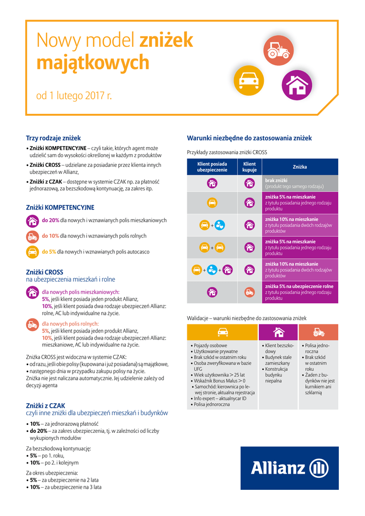 Nowy model zniżek majątkowych od 1 lutego 2017 r. Trzy rodzaje zniżek Warunki niezbędne do zastosowania zniżek •Zniżki KOMPETENCYJNE – czyli takie, których agent może udzielić sam do wysokości określonej w każdym z produktów Przykłady zastosowania zniżki CROSS •Zniżki CROSS – udzielane za posiadanie przez klienta innych ubezpieczeń w Allianz, Klient posiada ubezpieczenie Klient kupuje brak zniżki (produkt tego samego rodzaju) •Zniżki z CZAK – dostępne w systemie CZAK np. za płatność jednorazową, za bezszkodową kontynuację, za zakres itp. zniżka 5% na mieszkanie z tytułu posiadania jednego rodzaju produktu Zniżki KOMPETENCYJNE do 20% dla nowych i wznawianych polis mieszkaniowych + zniżka 10% na mieszkanie z tytułu posiadania dwóch rodzajów produktów + zniżka 5% na mieszkanie z tytułu posiadania jednego rodzaju produktu do 10% dla nowych i wznawianych polis rolnych do 5% dla nowych i wznawianych polis autocasco Zniżki CROSS na ubezpieczenia mieszkań i rolne d la nowych polis mieszkaniowych: 5%, jeśli klient posiada jeden produkt Allianz, 10%, jeśli klient posiada dwa rodzaje ubezpieczeń Allianz: rolne, AC lub indywidualne na życie. d la nowych polis rolnych: 5%, jeśli klient posiada jeden produkt Allianz, 10%, jeśli klient posiada dwa rodzaje ubezpieczeń Allianz: mieszkaniowe, AC lub indywidualne na życie. Zniżka CROSS jest widoczna w systemie CZAK: •od razu, jeśli obie polisy (kupowana i już posiadana) są majątkowe, •następnego dnia w przypadku zakupu polisy na życie. Zniżka nie jest naliczana automatycznie. Jej udzielenie zależy od decyzji agenta Zniżki z CZAK czyli inne zniżki dla ubezpieczeń mieszkań i budynków • 10% – za jednorazową płatność • do 20% – za zakres ubezpieczenia, tj. w zależności od liczby wykupionych modułów Za bezszkodową kontynuację: • 5% – po 1. roku, • 10% – po 2. i kolejnym Za okres ubezpieczenia: • 5% – za ubezpieczenie na 2 lata • 10% – za ubezpieczenie na 3 lata Zniżka + + zniżka 10% na mieszkanie z tytułu posiadania dwóch rodzajów produktów zniżka 5% na ubezpieczenie rolne z tytułu posiadania jednego rodzaju produktu Walidacje – warunki niezbędne do zastosowania zniżek • Pojazdy osobowe • Użytkowanie prywatne • Brak szkód w ostatnim roku • Osoba zweryfikowana w bazie UFG • Wiek użytkownika > 25 lat • Wskaźnik Bonus Malus > 0 • Samochód: kierownica po lewej stronie, aktualna rejestracja • Info expert – aktualnycar ID • Polisa jednoroczna • Klient bezszkodowy • Budynek stale zamieszkany • Konstrukcja budynku niepalna • Polisa jednoroczna • Brak szkód w ostatnim roku • Żaden z budynków nie jest kurnikiem ani szklarnią