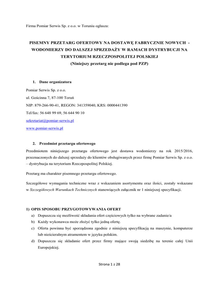 Firma Pomiar Serwis Sp. z o.o. w Toruniu ogłasza: PISEMNY PRZETARG OFERTOWY NA DOSTAWĘ FABRYCZNIE NOWYCH WODOMIERZY DO DALSZEJ SPRZEDAŻY W RAMACH DYSTRYBUCJI NA TERYTORIUM RZECZPOSPOLITEJ POLSKIEJ (Niniejszy przetarg nie podlega pod PZP) 1. Dane organizatora Pomiar Serwis Sp. z o.o. ul. Gościnna 7, 87-100 Toruń NIP: 879-266-90-41, REGON: 341359040, KRS: 0000441390 Tel/fax: 56 648 99 69, 56 644 90 10 [email protected] www.pomiar-serwis.pl 2. Przedmiot przetargu ofertowego Przedmiotem niniejszego przetargu ofertowego jest dostawa wodomierzy na rok 2015/2016, przeznaczonych do dalszej sprzedaży do klientów obsługiwanych przez firmę Pomiar Serwis Sp. z o.o. – dystrybucja na terytorium Rzeczpospolitej Polskiej. Przetarg ma charakter pisemnego przetargu ofertowego. Szczegółowe wymagania techniczne wraz z wskazaniem asortymentu oraz ilości, zostały wskazane w Szczegółowych Warunkach Technicznych stanowiących załącznik nr 1 niniejszej specyfikacji. 1) OPIS SPOSOBU PRZYGOTOWYWANIA OFERT a) Dopuszcza się możliwość składania ofert częściowych tylko na wybrane zadanie/a b) Każdy wykonawca może złożyć tylko jedną ofertę. c) Oferta powinna być sporządzona zgodnie z niniejszą specyfikacją na maszynie, komputerze lub nieścieralnym atramentem w języku polskim. d) Dopuszcza się składanie ofert przez firmy mające swoją siedzibę na terenie całej Unii Europejskiej. Strona 1 z 28 e) W przypadku składania ofert przez firmy mające swoją siedzibę w kraju innym niż Polska, Wykonawca zobowiązany jest do wskazania cen ofertowych w walucie PLN (Wykonawca bierze na siebie ciężar wynikający ze zmian kursu walutowego). f) Oferta musi być podpisana przez osoby upoważnione do występowania w obrocie prawnym lub posiadające pełnomocnictwo. g) Zamawiający dopuszcza składanie ofert wariantowych h) Za osoby uprawnione do podpisywania oferty i składania oświadczeń w imieniu wykonawców uznaje się: Osoby wskazane w prowadzonych przez sądy rejestrach handlowych, rejestrach spółdzielni lub rejestrach przedsiębiorstw państwowych, Osoby wskazane w zaświadczeniach o wpisie do ewidencji działalności gospodarczej, Osoby legitymujące się odpowiednim pełnomocnictwem udzielonym przez w/w osoby. W przypadku podpisania oferty i jej załączników przez pełnomocnika wykonawcy, pełnomocnictwo posiadające zakres (podpisane przez osoby reprezentujące osobę prawną lub fizyczną) musi być dołączone do oferty. Wspólników, jeżeli wykonawca prowadzi działalność w formie spółki cywilnej. Jeżeli oferta nie została podpisana przez wszystkich wspólników, oferent zobowiązany jest dołączyć do oferty odpowiednie pełnomocnictwa udzielone przez wszystkich pozostałych wspólników lub jeżeli wynika z niej uprawnienie do występowania w imieniu spółki umowę spółki cywilnej i) Zaleca się, aby oferta była zszyta lub spięta, strony oferty ponumerowane, a wszystkie załączniki podpisane przez osoby upoważnione i opieczętowane pieczęciami. j) Informacje stanowiące tajemnicę przedsiębiorstwa, w rozumieniu przepisów ustawy o zwalczaniu nieuczciwej konkurencji Wykonawca powinien wyodrębnić w formie osobnego pakietu. Pakiet ten ma być oznaczony „TAJEMNICA PRZEDSIĘBIORSTWA – NIE UDOSTĘPNIAĆ INNYM UCZESTNIKOM POSTĘPOWANIA”; k) Wykonawca ponosi wszelkie koszty związane z przygotowaniem i przedłożeniem swojej oferty niezależnie od wyniku postępowania. Do oferty (form. zał. nr 2) powinny być załączone następujące dokumenty i oświadczenia: 1) Oznaczenie firmy, adres, 2) Aktualny odpis z właściwego rejestru albo zaświadczenie o wpisie do ewidencji działalności gospodarczej (wypis z tego dokumentu zawierający co najmniej: siedzibę, datę rozpoczęcia działalności, nazwiska osób uprawnionych do reprezentowania firmy stwierdzający, że zakres jej działania odpowiada profilowi zamówienia) 3) Oświadczenie o posiadaniu pełnej zdolności finansowej oraz potencjału technicznego (zaplecza logistycznego) pozwalającego na realizację przedmiotu przetargu (załącznik nr 3) Strona 2 z 28 4) Oświadczenie, iż Oferent jest płatnikiem podatku VAT lub VAT UE (załącznik nr 4) 5) Oświadczenie Wykonawcy o zobowiązaniu się do dostarczenia zamówionego przez Zamawiającego towaru w terminie nieprzekraczającym 30 dni lub o wyrażeniu zgody na utworzenie magazynu zamiejscowego w siedzibie Zamawiającego (załącznik nr 5) 6) Oświadczenie o udzieleniu min. 24 miesięcznej gwarancji na dostarczany towar (załącznik nr 5), jednakże nie dłuższej niż 60 miesięcy. 7) Pełnomocnictwo dla osoby podpisującej ofertę w imieniu Wykonawcy, jeżeli upoważnienie osoby podpisującej nie wynika z dokumentu wymienionego w pkt.2 8) Dokumenty potwierdzające spełnianie wymagań technicznych, o których mowa w Szczegółowych Warunkach Technicznych stanowiących załącznik nr 1 niniejszej specyfikacji 9) Parafowany wzór umowy, stanowiący załącznik nr 6 Wadium Odrębnie, na każde z 20 zadań, Zamawiający przewidział konieczność wniesienia wadium w wysokości 500,00 zł (słownie: pięćset złotych 00/100). Wadium należy wnieść przelewem na poniższy rachunek bankowy: Millennium - 10 1160 2202 0000 0002 4125 1943 W tytule przelewu należy umieścić następującą treść: „Wadium przetargowe – dotyczy zadania nr ….” lub gotówką do kasy firmy – codziennie w godz. 7:00 – 15:00 (także w dniu składania ofert) w biurze przy ulicy Leśnej 21, 87-124 Złotoria k. Torunia Wadium zostanie zwrócone w ciągu 7 dni od ogłoszenia wyboru oferenta/tów. Sposób i miejsce składania ofert: 1) Ofertę wraz z załącznikami należy przesłać na adres biura zamawiającego, w zamkniętej kopercie oznaczonej opisem: Pomiar Serwis Sp. z o.o., ul. Leśna 21, 87-124 Złotoria k. Torunia „Oferta na dostawę urządzeń pomiarowych - wodomierzy do dalszej sprzedaży w ramach dystrybucji na terytorium Rzeczpospolitej Polskiej”. opa