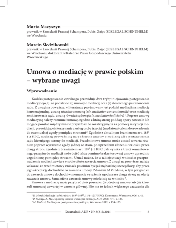 Marta Macyszyn prawnik w Kancelarii Prawnej Schampera, Dubis, Zając (SDZLEGAL SCHINDHELM) we Wrocławiu Marcin Śledzikowski prawnik w Kancelarii Prawnej Schampera, Dubis, Zając (SDZLEGAL SCHINDHELM) we Wrocławiu; doktorant w Katedrze Prawa Gospodarczego Uniwersytetu Wrocławskiego Umowa o mediację w prawie polskim – wybrane uwagi Wprowadzenie Kodeks postępowania cywilnego przewiduje dwa tryby inicjowania postępowania mediacyjnego, tj. na podstawie: (i) umowy o mediację oraz (ii) stosownego postanowienia sądu. Z uwagi na powyższe, w literaturze przyjmowany jest podział mediacji na mediację konwencjonalną, zwaną również umowną (z fr. mediation conventionnelle) oraz mediację ze skierowania sądu, zwaną również sądową (z fr. mediation judiciaire) 1. Poprzez umowę mediacyjną należy rozumieć umowę, zgodnie z którą strony poddają spory powstałe lub mogące powstać między nimi w przyszłości do rozstrzygnięcia za pomocą instytucji mediacji, przewidującej skorzystanie z usług osoby trzeciej (mediatora) celem doprowadzenia do ewentualnej ugody pomiędzy stronami 2. Zgodnie z aktualnym brzmieniem art. 1831 § 2 KPC, mediację prowadzi się na podstawie umowy o mediację albo postanowienia sądu kierującego strony do mediacji. Przedmiotowa umowa może zostać zawarta również poprzez wyrażenie zgody jednej ze stron, po uprzednim złożeniu wniosku przez drugą stronę, zgodnie z brzmieniem art. 1836 § 1 KPC. Jak wynika z treści komentowanego przepisu do mediacji może dojść także pomimo braku stosownej umowy uprzednio uzgodnionej pomiędzy stronami. Uznać można, że w takiej sytuacji wniosek o przeprowadzenie mediacji zawiera w sobie ofertę zawarcia umowy. Z uwagi na powyższe, należy wskazać, że przedmiotowy wniosek powinien być jak najbardziej szczegółowy, aby przez jego akceptację dochodziło do zawarcia umowy. Zdaniem M. Pazdana, w tym przypadku do zawarcia umowy dochodzi w momencie wyrażenia zgody przez drugą stronę na ofertę zawarcia umowy. Sama oferta zawarcia umowy mieści się we wniosku 3. Umowa o mediację może przybrać dwie postacie: (i) odrębnej umowy lub (ii) klauzuli umownej zawartej w umowie głównej. Nie ma to jednak większego znaczenia dla 1 R. Morek, Mediacja i arbitraż (art. 1831–18315, 1154–1217 KPC). Komentarz, Warszawa 2006, s. 41. Malaga, A. Mól, Sposoby i skutki wszczęcia mediacji, ADR 2008, Nr 4, s. 125. 3 M. Białecki, Mediacja w postępowaniu cywilnym, Warszawa 2012, s. 154–155. 2 P. Kwartalnik ADR • Nr 3(31)/2015 5 Macyszyn, Śledzikowski jej skuteczności i oceny prawnej. Według R. Kulskiego, umowa procesowa sporządzona jako oddzielna umowa, jak i odrębna klauzula, ma charakter autonomiczny, a zatem gdyby umowa cywilnoprawna okazała się nieważna, nie implikuje to nieważności samej umowy procesowej. Zdaniem R. Morka umowa mediacyjna może przybrać postać klauzuli mediacyjnej, stając się częścią umowy materialnoprawnej, ale również umowa taka może być elementem kilkuetapowego mechanizmu rozwiązywania sporów określanego mianem multistep dispute resolution clause. Nie ma także przeszkód skorelowania klauzuli mediacyjnej z zapisem na sąd polubowny 4. Jak zostało pośrednio wskazane powyżej, polski ustawodawca nie wprowadził żadnych szczególnych wymogów co do formy umowy o mediację. Umowa o mediację może być zawarta w dowolnej formie: na piśmie, ustnie, w formie aktu notarialnego, a także poprzez czynności dorozumiane (per facta concludentia) 5. W szczególności może zostać zawarta przy zawieraniu przez strony w umowie głównej albo może zostać zawarta jako umowa samodzielna. Sama doniosłoś mediacji przejawia się w tym, że prowadzi do powstania stosunków umownych między mediatorem a stronami, a także stronami a instytucją, przy której usytuowane jest centrum, z którego usług strony postanowiły skorzystać. Treść umowy o mediację Ustawodawca uregulował elementy umowy o mediację w art. 1831 § 3 KPC. Zdaniem K. Falkiewicza i R.L. Kwaśnickiego stanowią one essentialia negotii umowy o mediację 6. Przepis ten stanowi, że w umowie o mediację strony określają w szczególności przedmiot mediacji, osobę mediatora albo sposób jego wyboru. Z art. 1831 § 1 i 2 KPC możemy natomiast odczytać kolejny konstytutywny element umowy o mediację, jakim jest zgoda na mediację, co wyraża się w instytucji dobrowolności mediacji. Ponadto w doktrynie podkreśla się, że treść umowy o mediację musi być wyraźna, nie może pozostawiać wątpliwości interpretacyjnych, dodatkowo niedopuszczalne jest stosowania wykładni rozszerzającej 7. Wobec braku wskazówek ustawodawcy w kwestii przedmiotu umowy o mediację, należy zastosować per analogiam kryteria zawarte w art. 1161 § 1 KPC, dotyczące zapisu na sąd polubowny 8. Określenie w umowie o mediację przedmiotu polega na wskazaniu przedmiotu sporu lub stosunku prawnego, z którego spór wyniknął lub może wyniknąć. Nadto umowa o mediację może dotyczyć sporów istniejących między stronami, a także tych, które dopiero mogą wyniknąć ze stosunków kontraktowych, a także tych stosunków, które nie mają swojego źródła w umowie. Jest to rozwiązanie bardzo korzystne dla stron, gdyż może wpłynąć znacznie na przyśpieszenie dochodzenia roszczeń między nimi 9. 4 Ibidem, s. 159–160. Zieliński, Kodeks postępowania cywilnego. Komentarz, Warszawa 2012, s. 316. 6 K. Falkiewicz, R.L. Kwaśnicki, Arbitraż i mediacja w świetle najnowszej nowelizacji kodeksu postępowania cywilnego, PPH 2005, Nr 11, s. 1. 7 M. Białecki, op. cit., s. 157. 8 Umowa o mediację i jej charakter prawny, [w:] M. Pazdan, W. Popiołek, E. Rott-Pietrzyk, M. Szpunar, Europeizacja prawa prywatnego, t. 1, red. M. Pazdan, Warszawa 2008, s. 754. 9 M. Białecki, op. cit., s. 160. 5 T. 6 Kwartalnik ADR • Nr 3(31)/2015 Umowa o mediację w prawie polskim – wybrane uwagi Pamiętać należy, że umowa o mediac