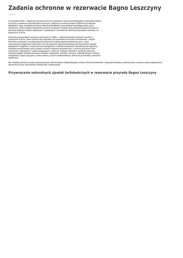 Zadania ochronne w rezerwacie Bagno Leszczyny 2016-12-14 W listopadzie 2016 r. Regionalna Dyrekcja Ochrony Środowiska w Gorzowie Wielkopolskim realizowała zadanie ochronne w rezerwacie przyrody Bagno Leszczyny, położonym w obszarze Natura 2000 Puszcza Notecka PLB300015 i Bory Chrobotkowe Puszczy Noteckiej PLH080032 (teren Nadleśnictwa Międzychód, gmina Skwierzyna). Zakres zadania obejmował usunięcie istniejących nalotów sosny pospolitej, poprzez wycięcie w pierwszej kolejności okazów najstarszych i największych z wyniesieniem biomasy poza obszar rezerwatu, na powierzchni 2,50 ha. Rezerwat przyrody Bagno Leszczyny ustanowiony w 2009 r., obejmuje kompleks torfowisk wysokich o powierzchni 4,04 ha. Celem ochrony tego rezerwatu jest zachowanie roślinności torfowiskowej - zespołu torfowiska wysokiego z charakterystyczną fizjonomią i budową kępkowo-dolinkową wraz z całym zróżnicowanym bogactwem roślinności runa. Na znacznym obszarze porośnięty jest fitocenozami zespołu Sphagnetum magellanici z klasy Oxycocco-Sphagnetea, w którego obniżeniach wykształcają się fragmenty torfowiska przejściowego. Jest to zespół o wysokich walorach przyrodniczych z cennymi gatunkami roślin chronionych, zagrożonych i rzadko występujących, takich jak: torfowiec ostrolistny, torfowiec kończysty, torfowiec pogięty, torfowiec brunatny, torfowiec magellański, torfowiec czerwony, widłoząb Bergera, rosiczka okrągłolistna, bagno zwyczajne, żurawina błotna, żurawina drobnolistkowa, wełnianka pochwowata, wełnianka wąskolistna. Ww. działanie ochronne zostało zrealizowane przy dofinansowaniu Wojewódzkiego Funduszu Ochrony Środowiska i Gospodarki Wodnej w Zielonej Górze w ramach zadania Zapewnienie skutecznej ochrony różnorodności biologicznej i krajobrazowej. Przywracanie naturalnych zjawisk torfotwórczych w rezerwacie przyrody Bagno Leszczyny