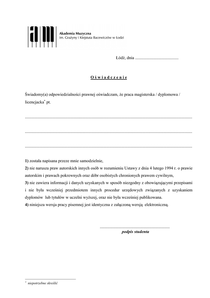 Łódź, dnia ......................................... Oświadczenie Świadomy(a) odpowiedzialności prawnej oświadczam, że praca magisterska / dyplomowa / licencjacka∗ pt. .............................................................................................................................................................. .............................................................................................................................................................. .............................................................................................................................................................. 1) została napisana przeze mnie samodzielnie, 2) nie narusza praw autorskich innych osób w rozumieniu Ustawy z dnia 4 lutego 1994 r. o prawie autorskim i prawach pokrewnych oraz dóbr osobistych chronionych prawem cywilnym, 3) nie zawiera informacji i danych uzyskanych w sposób niezgodny z obowiązującymi przepisami i nie była wcześniej przedmiotem innych procedur urzędowych związanych z uzyskaniem dyplomów lub tytułów w uczelni wyższej, oraz nie była wcześniej publikowana. 4) niniejsza wersja pracy pisemnej jest identyczna z załączoną wersją elektroniczną. .................................................................. podpis studenta ∗ niepotrzebne skreślić