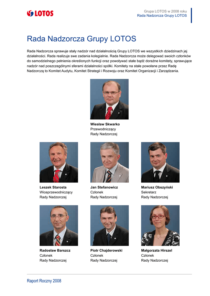 Grupa LOTOS w 2008 roku Rada Nadzorcza Grupy LOTOS Rada Nadzorcza Grupy LOTOS Rada Nadzorcza sprawuje stały nadzór nad działalnością Grupy LOTOS we wszystkich dziedzinach jej działalności. Rada realizuje swe zadania kolegialnie. Rada Nadzorcza może delegować swoich członków do samodzielnego pełnienia określonych funkcji oraz powoływać stałe bądź doraźne komitety, sprawujące nadzór nad poszczególnymi sferami działalności spółki. Komitety na stałe powołane przez Radę Nadzorczą to Komitet Audytu, Komitet Strategii i Rozwoju oraz Komitet Organizacji i Zarządzania. Wiesław Skwarko Przewodniczący Rady Nadzorczej Leszek Starosta Wiceprzewodniczący Rady Nadzorczej Jan Stefanowicz Członek Rady Nadzorczej Radosław Barszcz Członek Rady Nadzorczej Piotr Chajderowski Członek Rady Nadzorczej Raport Roczny 2008 Mariusz Obszyński Sekretarz Rady Nadzorczej Małgorzata Hirszel Członek Rady Nadzorczej Grupa LOTOS w 2008 roku Rada Nadzorcza Grupy LOTOS Wiesław Skwarko Przewodniczący Rady Nadzorczej Absolwent Szkoły Głównej Handlowej w Warszawie (Wydział Handlu Zagranicznego). W latach 1987-1994 asystent w Szkole Głównej Handlowej. W latach 1990-1999 był partnerem w Access Sp. z o.o. Następnie wszedł w skład zarządu firmy Rothschild Polska Sp. z o.o. W latach 2005-2006 pracował na stanowisku dyrektora Biura Prywatyzacji w Nafcie Polskiej S.A. W 2006 roku objął stanowisko dyrektora ds. strategii finansowej i rozwoju kapitałowego w spółce CTL Maczki Bór w Sosnowcu, a następnie w CTL Logistics S.A. w Warszawie. Od 10 stycznia 2008 roku pełni funkcję członka zarządu Nafty Polskiej S.A. Jest również przewodniczącym Rady Nadzorczej Zakładów Azotowych w Kędzierzynie-Koźlu. Powołany do Rady Nadzorczej Grupy LOTOS 30 czerwca 2008 roku, objął funkcję Przewodniczącego Rady. Ponadto pełni funkcję Przewodniczącego Komitetu Strategii i Rozwoju Rady Nadzorczej Spółki. Zadaniem tego komitetu jest opiniowanie i przedstawianie Radzie Nadzorczej rekomendacji dotyczących planowanych inwestycji, które mają istotny wpływ na aktywa spółki. Od 19 marca 2009 roku wchodzi również w skład Komitetu Audytu. Decyzją Rady Nadzorczej z 12 sierpnia 2008 roku został wyznaczony do szczegółowego i bieżącego nadzorowania realizacji Programu 10+. W szczególności do jego kompetencji należy: ●● monitorowanie postępu prac w ramach projektu i ich zgodności z harmonogramem, ●● nadzór nad realizacją strategii w zakresie pozyskiwania surowców do realizacji projektu, ●● nadzór nad realizacją strategii sprzedaży produktów wytworzonych w ramach projektu, ●● nadzór nad spójnością logistyki przy realizacji projektu. Leszek Starosta Wiceprzewodniczący Rady Nadzorczej Absolwent Wydziału Prawa i Administracji Uniwersytetu im. Adama Mickiewicza w Poznaniu. Profesor nadzwyczajny dr hab. nauk prawnych, prorektor ds. rozwoju Wyższej Szkoły Międzynarodowych Stosunków Gospodarczych i Politycznych w Gdyni, dziekan Wydziału Prawa tej uczelni, dyrektor Instytutu Studiów Europejskich w Gdyni. W latach 1991-2000 doradca zarządu Rafinerii Gdańskiej S.A. W latach 1995-1998 doradca i konsultant prezesa zarządu Petrochemii Płock S.A. Autor ponad dwudziestu studiów i analiz dotyczących sektora naftowego i paliwowego, przygotowywanych m.in. na zlecenie centralnych organów administracji publicznej. W latach 1998-2007 członek i wiceprzewodniczący rady nadzorczej Prokom Software S.A. Adwokat – członek Izby Adwokackiej w Gdańsku, członek Prezydium Konfederacji Pracodawców Polskich, arbiter w Trybunale Arbitrażowym ds. Sportu przy Polskim Komitecie Olimpijskim. Powołany do Rady Nadzorczej Grupy LOTOS 30 czerwca 2008 roku. Od 12 sierpnia 2008 roku pełni funkcję Wiceprzewodniczącego Rady. Jest również Przewodniczącym Komitetu Organizacji i Zarządzania Rady Nadzorczej, którego zadaniem jest przedstawianie Radzie Nadzorczej opinii i rekomendacji dotyczących struktury zarządzania umożliwiających osiąganie strategicznych celów Spółki. Uczestniczy także w pracach Komitetu Strategii i Rozwoju. Raport Roczny 2008 Grupa LOTOS w 2008 roku Rada Nadzorcza Grupy LOTOS Zgodnie z decyzją Rady Nadzorczej z 12 sierpnia 2008 roku wyznaczony do szczegółowego i bieżącego nadzorowania realizacji Programu 10+, w szczególności do jego kompetencji należy: ●● nadzór nad aspektami prawnymi związanymi z realizowanymi i zawieranymi kontraktami w ramach projektu, ●● nadzór nad procedurami zawierania kontraktów, ●● nadzór nad postępowaniami administracyjnymi związanymi z realizacją projektu. Jan Stefanowicz Członek Rady Nadzorczej Absolwent prawa na Uniwersytecie Mikołaja Kopernika w Toruniu, adwokat, członek Towarzystwa Ekonomistów Polskich, Przewodniczący Rady Centrum Monitoringu Wolności Prasy SDP. Prowadzi indywidualną kancelarię adwokacką. Partner Kancelarii „Juris”. W Radzie Nadzorczej Grupy LOTOS zasiada od 30 stycznia 2006 roku, kiedy objął funkcję Wiceprzewodniczącego Rady. Od 28 maja 2007 roku do 30 czerwca 2008 roku pełnił funkcję Przewodniczącego Rady. Obecnie jest Przewodniczącym Komitetu Audytu. Zadaniem tego komitetu jest doradzanie Radzie Nadzorczej w sprawach dotyczących wdrażania zasad sprawozdawczości budżetowej i finansowej, kontroli wewnętrznej oraz współpracy z biegłymi rewidentami. Uczestniczy również w pracach Komitetu Strategii i Rozwoju. Mariusz Obszyński Sekretarz Rady Nadzorczej Absolwent Uniwersytetu Marii Curie-Skłodowskiej w Lublinie, Wydział Ekonomiczny. W roku 1999 zatrudniony na stanowisku specjalisty w Agencji Prywatyzacji w Departamencie Rokowań Prywatyzacyjnych. W latach 1999-2007 pracował na stanowisku głównego specjalisty w Biurze Nadzoru Właścicielskiego Nafty Polskiej S.A. Od stycznia 2007 do stycznia 2008 pracował jako specjalista/ analityk ds. Inwestycji Kapitałowych w Bankowym Towarzystwie Kapitałowym S.A. Od stycznia 2008 roku do