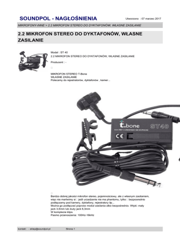 SOUNDPOL - NAGŁOŚNIENIA Utworzono : 07 marzec 2017 MIKROFONY-INNE > 2.2 MIKROFON STEREO DO DYKTAFONÓW, WŁASNE ZASILANIE 2.2 MIKROFON STEREO DO DYKTAFONÓW, WŁASNE ZASILANIE Model : ST 40 2.2 MIKROFON STEREO DO DYKTAFONÓW, WŁASNE ZASILANIE Producent : � MIKROFON STEREO T-Bone WŁASNE ZASILANIE Polecamy do rejestratorów, dyktafonów , kamer... � Bardzo dobrej jakości mikrofon stereo, pojemnościowy, ale z własnym zasilaniem, więc nie martwimy si�jeśli urzadzenie nie ma phantomu, tylko�bezposrednio podłączamy pod kamery, dyktafony, rejestratory itp... Można go podłączać poprzez moduł zasilania albo bezpośrednio. Wtyki: mały jack 3,5mm lub duży jack 6,3mm W komplecie klips. Pasmo przenoszenia: 100Hz-16kHz kontakt : - [email protected] Strona 1 SOUNDPOL - NAGŁOŚNIENIA Utworzono : 07 marzec 2017 MIKROFONY-INNE > 2.2 MIKROFON STEREO DO DYKTAFONÓW, WŁASNE ZASILANIE 2.2 MIKROFON STEREO DO DYKTAFONÓW, WŁASNE ZASILANIE � � � � kontakt : - [email protected] Strona 2 SOUNDPOL - NAGŁOŚNIENIA Utworzono : 07 marzec 2017 MIKROFONY-INNE > 2.2 MIKROFON STEREO DO DYKTAFONÓW, WŁASNE ZASILANIE 2.2 MIKROFON STEREO DO DYKTAFONÓW, WŁASNE ZASILANIE kontakt : - [email protected] Strona 3 SOUNDPOL - NAGŁOŚNIENIA Utworzono : 07 marzec 2017 MIKROFONY-INNE > 2.2 MIKROFON STEREO DO DYKTAFONÓW, WŁASNE ZASILANIE 2.2 MIKROFON STEREO DO DYKTAFONÓW, WŁASNE ZASILANIE � � kontakt : - [email protected] Strona 4 SOUNDPOL - NAGŁOŚNIENIA Utworzono : 07 marzec 2017 MIKROFONY-INNE > 2.2 MIKROFON STEREO DO DYKTAFONÓW, WŁASNE ZASILANIE 2.2 MIKROFON STEREO DO DYKTAFONÓW, WŁASNE ZASILANIE kontakt : - [email protected] Strona 5 SOUNDPOL - NAGŁOŚNIENIA Utworzono : 07 marzec 2017 MIKROFONY-INNE > 2.2 MIKROFON STEREO DO DYKTAFONÓW, WŁASNE ZASILANIE 2.2 MIKROFON STEREO DO DYKTAFONÓW, WŁASNE ZASILANIE � � � �NOWY, GWARANCJA , FAKTURA � � Cena : 112,00 zł Brutto ( 91,80 zł Netto) Dostępność: Produkt dostępny w naszym sklepie od 05 maj 2010 kontakt : - [email protected] Strona 6
