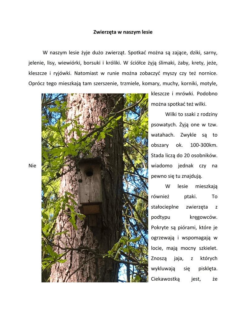 Zwierzęta w naszym lesie W naszym lesie żyje dużo zwierząt. Spotkać można są zające, dziki, sarny, jelenie, lisy, wiewiórki, borsuki i króliki. W ściółce żyją ślimaki, żaby, krety, jeże, kleszcze i ryjówki. Natomiast w runie można zobaczyć myszy czy też nornice. Oprócz tego mieszkają tam szerszenie, trzmiele, komary, muchy, korniki, motyle, kleszcze i mrówki. Podobno można spotkać też wilki. Wilki to ssaki z rodziny psowatych. Żyją one w tzw. watahach. obszary Zwykle są ok. to 100-300km. Stada liczą do 20 osobników. Nie wiadomo jednak czy na pewno się tu znajdują. W lesie również mieszkają ptaki. stałocieplne podtypu To zwierzęta z kręgowców. Pokryte są piórami, które je ogrzewają i wspomagają w locie, mają mocny szkielet. Znoszą jaja, wykluwają Ciekawostką z się których pisklęta. jest, że pochodzą od gadów. Las zamieszkują kosy, rudziki, drozdy, dzięcioły i zięby. Dzięcioły to pożyteczne zwierzęta. Chronią drzewa wydziobując pokarm (korniki i inne szkodniki) spod kory. Z tego względu mają mocną czaszkę. Na tylnych kończynach mają 4 palce. Dwa z nich ustawione są do przodu, a drugie dwa przeciwstawnie do nich. Mogą wtedy łatwiej się przyczepić do kory drzewa. Zjadają głównie małe owady ,a najbardziej lubią mrówki. Mają charakterystyczny głos i ''czerwony grzebyk''. Zagrażają im ptaki drapieżne. Ludzie na drzewach liściastych robią budki dla ptaków. Pomagają ptakom odnaleźć bezpieczne mieszkanie. Są one powieszone ok.2,5m nad ziemią i skryte w cieniu ze względu na wysoką temperaturę. Każda budka ma wejście na innej wielkości, aby każdy gatunek ptaków mógł się tam wprowadzić. Zdarza się jednak, że ptaszek używając dziobu powiększa wejście, gdyż chciałby tam zamieszkać. Warto wybrać się do lasu i podziwiać piękno przyrody. Należy jednak odpowiednio się ubrać ze względu na kleszcze, które są najbardziej aktywne z rana. wyk.Julia Zaręba (klasa VI)