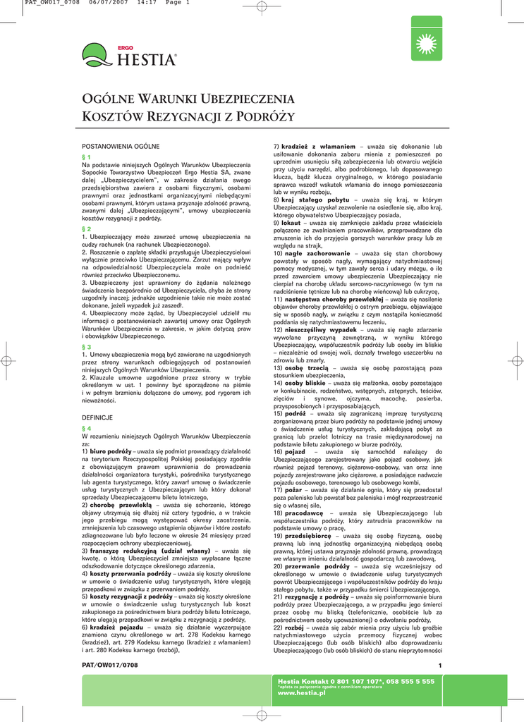 PAT_OW017_0708 06/07/2007 14:17 Page 1 OGÓLNE WARUNKI UBEZPIECZENIA KOSZTÓW REZYGNACJI Z PODRÓ˚Y POSTANOWIENIA OGÓLNE §1 Na podstawie niniejszych Ogólnych Warunków Ubezpieczenia Sopockie Towarzystwo Ubezpieczeƒ Ergo Hestia SA, zwane dalej „Ubezpieczycielem”, w zakresie dzia∏ania swego przedsi´biorstwa zawiera z osobami fizycznymi, osobami prawnymi oraz jednostkami organizacyjnymi nieb´dàcymi osobami prawnymi, którym ustawa przyznaje zdolnoÊç prawnà, zwanymi dalej „Ubezpieczajàcymi”, umowy ubezpieczenia kosztów rezygnacji z podró˝y. §2 1. Ubezpieczajàcy mo˝e zawrzeç umow´ ubezpieczenia na cudzy rachunek (na rachunek Ubezpieczonego). 2. Roszczenie o zap∏at´ sk∏adki przys∏uguje Ubezpieczycielowi wy∏àcznie przeciwko Ubezpieczajàcemu. Zarzut majàcy wp∏yw na odpowiedzialnoÊç Ubezpieczyciela mo˝e on podnieÊç równie˝ przeciwko Ubezpieczonemu. 3. Ubezpieczony jest uprawniony do ˝àdania nale˝nego Êwiadczenia bezpoÊrednio od Ubezpieczyciela, chyba ˝e strony uzgodni∏y inaczej; jednak˝e uzgodnienie takie nie mo˝e zostaç dokonane, je˝eli wypadek ju˝ zaszed∏. 4. Ubezpieczony mo˝e ˝àdaç, by Ubezpieczyciel udzieli∏ mu informacji o postanowieniach zawartej umowy oraz Ogólnych Warunków Ubezpieczenia w zakresie, w jakim dotyczà praw i obowiàzków Ubezpieczonego. §3 1. Umowy ubezpieczenia mogà byç zawierane na uzgodnionych przez strony warunkach odbiegajàcych od postanowieƒ niniejszych Ogólnych Warunków Ubezpieczenia. 2. Klauzule umowne uzgodnione przez strony w trybie okreÊlonym w ust. 1 powinny byç sporzàdzone na piÊmie i w pe∏nym brzmieniu do∏àczone do umowy, pod rygorem ich niewa˝noÊci. DEFINICJE §4 W rozumieniu niniejszych Ogólnych Warunków Ubezpieczenia za: 1) biuro podró˝y – uwa˝a si´ podmiot prowadzàcy dzia∏alnoÊç na terytorium Rzeczypospolitej Polskiej posiadajàcy zgodnie z obowiàzujàcym prawem uprawnienia do prowadzenia dzia∏alnoÊci organizatora turystyki, poÊrednika turystycznego lub agenta turystycznego, który zawar∏ umow´ o Êwiadczenie us∏ug turystycznych z Ubezpieczajàcym lub który dokona∏ sprzeda˝y Ubezpieczajàcemu biletu lotniczego, 2) chorob´ przewlek∏à – uwa˝a si´ schorzenie, którego objawy utrzymujà si´ d∏u˝ej ni˝ cztery tygodnie, a w trakcie jego przebiegu mogà wyst´powaç okresy zaostrzenia, zmniejszenia lub czasowego ustàpienia objawów i które zosta∏o zdiagnozowane lub by∏o leczone w okresie 24 miesi´cy przed rozpocz´ciem ochrony ubezpieczeniowej, 3) franszyz´ redukcyjnà (udzia∏ w∏asny) – uwa˝a si´ kwot´, o którà Ubezpieczyciel zmniejsza wyp∏acane ∏àczne odszkodowanie dotyczàce okreÊlonego zdarzenia, 4) koszty przerwania podró˝y – uwa˝a si´ koszty okreÊlone w umowie o Êwiadczenie us∏ug turystycznych, które ulegajà przepadkowi w zwiàzku z przerwaniem podró˝y, 5) koszty rezygnacji z podró˝y – uwa˝a si´ koszty okreÊlone w umowie o Êwiadczenie us∏ug turystycznych lub koszt zakupionego za poÊrednictwem biura podró˝y biletu lotniczego, które ulegajà przepadkowi w zwiàzku z rezygnacjà z podró˝y, 6) kradzie˝ pojazdu – uwa˝a si´ dzia∏anie wyczerpujàce znamiona czynu okreÊlonego w art. 278 Kodeksu karnego (kradzie˝), art. 279 Kodeksu karnego (kradzie˝ z w∏amaniem) i art. 280 Kodeksu karnego (rozbój), PAT/OW017/0708 7) kradzie˝ z w∏amaniem – uwa˝a si´ dokonanie lub usi∏owanie dokonania zaboru mienia z pomieszczeƒ po uprzednim usuni´ciu si∏à zabezpieczenia lub otwarciu wejÊcia przy u˝yciu narz´dzi, albo podrobionego, lub dopasowanego klucza, bàdê klucza oryginalnego, w którego posiadanie sprawca wszed∏ wskutek w∏amania do innego pomieszczenia lub w wyniku rozboju, 8) kraj sta∏ego pobytu – uwa˝a si´ kraj, w którym Ubezpieczajàcy uzyska∏ zezwolenie na osiedlenie si´, albo kraj, którego obywatelstwo Ubezpieczajàcy posiada, 9) lokaut – uwa˝a si´ zamkni´cie zak∏adu przez w∏aÊciciela po∏àczone ze zwalnianiem pracowników, przeprowadzane dla zmuszenia ich do przyj´cia gorszych warunków pracy lub ze wzgl´du na strajk, 10) nag∏e zachorowanie – uwa˝a si´ stan chorobowy powsta∏y w sposób nag∏y, wymagajàcy natychmiastowej pomocy medycznej, w tym zawa∏y serca i udary mózgu, o ile przed zawarciem umowy ubezpieczenia Ubezpieczajàcy nie cierpia∏ na chorob´ uk∏adu sercowo-naczyniowego (w tym na nadciÊnienie t´tnicze lub na chorob´ wieƒcowà) lub cukrzyc´, 11) nast´pstwa choroby przewlek∏ej – uwa˝a si´ nasilenie objawów choroby przewlek∏ej o ostrym przebiegu, objawiajàce si´ w sposób nag∏y, w zwiàzku z czym nastàpi∏a koniecznoÊç poddania si´ natychmiastowemu leczeniu, 12) nieszcz´Êliwy wypadek – uwa˝a si´ nag∏e zdarzenie wywo∏ane przyczynà zewn´trznà, w wyniku którego Ubezpieczajàcy, wspó∏uczestnik podró˝y lub osoby im bliskie – niezale˝nie od swojej woli, dozna∏y trwa∏ego uszczerbku na zdrowiu lub zmar∏y, 13) osob´ trzecià – uwa˝a si´ osob´ pozostajàcà poza stosunkiem ubezpieczenia, 14) osoby bliskie – uwa˝a si´ ma∏˝onka, osoby pozostajàce w konkubinacie, rodzeƒstwo, wst´pnych, zst´pnych, teÊciów, zi´ciów i synowe, ojczyma, macoch´, pasierba, przysposobionych i przysposabiajàcych, 15) podró˝ – uwa˝a si´ zagranicznà imprez´ turystycznà zorganizowanà przez biuro podró˝y na podstawie jednej umowy o Êwiadczenie us∏ug turystycznych, zak∏adajàcà pobyt za granicà lub przelot lotniczy na trasie mi´dzynarodowej na podstawie biletu zakupionego w biurze podró˝y, 16) pojazd – uwa˝a si´ samochód nale˝àcy do Ubezpieczajàcego zarejestrowany jako pojazd osobowy, jak równie˝ pojazd terenowy, ci´˝arowo-osobowy, van oraz inne pojazdy zarejestrowane jako ci´˝arowe, a posiadajàce nadwozie pojazdu osobowego, terenowego lub osobowego kombi, 17) po˝ar – uwa˝a si´ dzia∏anie ognia, który si´ przedosta∏ poza palenisko