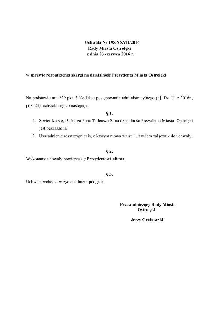 Uchwała Nr 195/XXVII/2016 Rady Miasta Ostrołęki z dnia 23 czerwca 2016 r. w sprawie rozpatrzenia skargi na działalność Prezydenta Miasta Ostrołęki Na podstawie art. 229 pkt. 3 Kodeksu postępowania administracyjnego (t.j. Dz. U. z 2016r., poz. 23) uchwala się, co następuje: § 1. 1. Stwierdza się, iż skarga Pana Tadeusza S. na działalność Prezydenta Miasta Ostrołęki jest bezzasadna. 2. Uzasadnienie rozstrzygnięcia, o którym mowa w ust. 1. zawiera załącznik do uchwały. § 2. Wykonanie uchwały powierza się Prezydentowi Miasta. § 3. Uchwała wchodzi w życie z dniem podjęcia. Przewodniczący Rady Miasta Ostrołęki Jerzy Grabowski Załącznik do uchwały Nr 195/XXVII/2016 z dnia 23 czerwca 2016 r. w sprawie rozpatrzenia skargi na działalność Prezydenta Miasta Ostrołęki W dniu 26 kwietnia 2016 roku do Rady Miasta Ostrołęki wpłynęła skarga Pana Tadeusza S. na działalność Prezydenta Miasta Ostrołęki. Skarżący zarzuca: - brak wsparcia i pomocy ze strony władz Miasta Ostrołęki w prowadzeniu działalności gospodarczej, - popełnienie przez Prezydenta Miasta przestępstwa przy budowie ul. Józefa Niewiarowskiego w Ostrołęce. Zgodnie z art. 229 pkt.3 Kodeksu postępowania administracyjnego „organem właściwym do rozpatrzenia skargi na działalność prezydenta miasta jest rada gminy”. Po przeprowadzeniu postępowania wyjaśniającego Rada Miasta ustaliła, że ul. Niewiarowskiego wybudowana została w roku 2006, zgodnie z opracowaną dokumentacją projektową jako ciąg pieszo-jezdny, co nie jest tożsame z „placem” na co wskazuje Skarżący. Budowa ulicy Józefa Niewiarowskiego w Ostrołęce została zainicjowana zawiązaniem się Społecznego Komitetu Budowy ulicy Niewiarowskiego w lutym 2004 roku. Zgodnie z obowiązującym wówczas Zarządzeniem Prezydenta Miasta Ostrołęki Nr 86/05 z dnia 7 kwietnia 2005 r. w sprawie ustalenia zasad realizacji inwestycji wspólnych podpisana została umowa nr IWD.341-1-12/05 w dnia 8 czerwca 2005 r., która określała zasady współfinansowania opracowania dokumentacji projektowej budowy ulicy Niewiarowskiego. Projekt budowlano-wykonawczy opracowany został przez Przedsiębiorstwo Projektowe „KOM-PROJEKT” Tadeusz Prusaczyk i protokolarnie przekazany do Urzędu Miasta Ostrołęki w dniu 6 lipca 2006 r. Prezydent Miasta Ostrołęki wydał w dniu 22 sierpnia 2006 r. Decyzję Nr 144/06, znak: WB.7353-131/06 zatwierdzającą projekt budowlany i udzielającą pozwolenia na budowę ulicy Józefa Niewiarowskiego wraz z kanalizacją deszczową i oświetleniem ulicznym, na działkach numer 52096 i 20894 w Ostrołęce. Ww. pozwoleniem został zatwierdzony projekt zagospodarowania działki, który stanowi integralną część decyzji o pozwoleniu na budowę i obejmuje swoim opracowaniem: „określenie granic działki lub terenu, usytuowanie, obrys i układy istniejących i projektowanych obiektów budowlanych, sieci uzbrojenia terenu, sposób odprowadzania lub oczyszczania ścieków, układ komunikacyjny i układ zieleni, ze wskazaniem charakterystycznych elementów, wymiarów, rzędnych i wzajemnych odległości obiektów, w nawiązaniu do istniejącej i projektowanej zabudowy terenów sąsiednich”. Decyzja stała się ostateczna z dniem 17 września 2006r.. Państwo Janina i Tadeusz S. brali udział w przedmiotowym postępowaniu – (zwrotne potwierdzenia odbioru korespondencji w aktach sprawy) w charakterze stron. Droga – ulica Józefa Niewiarowskiego została wybudowana przez firmę Przedsiębiorstwo Wielobranżowe „LASTMAR” „Drogi i Budowy” Hurtownia Materiałów Budowlanych Wiesław Glinowiecki na podstawie ww. pozwolenia na budowę. Umowa na budowę ulicy Niewiarowskiego nr IWD-342-65/06 podpisana została w dniu 18 października 2006 r. Odbioru robót dokonano 29 grudnia 2006 roku. Wybudowany ciąg pieszo-jezdny został oznakowany znakami drogowymi na podstawie projektu stałej organizacji ruchu zatwierdzonego 1 sierpnia 2006 r. Projekt stałej organizacji ruchu autorstwa Firmy „KOM-PROJEKT” Tadeusz Prusaczyk nie przewidywał wyznaczenia i oznakowania miejsc postojowych na ulicy J. Niewiarowskiego. W dniu 25 października 2007 r. Rada Miasta Ostrołęki Uchwałą nr 118/XIX/2007 w sprawie miejscowego planu zagospodarowania przestrzennego rejonu „Śródmieście Płd. – Goworowska” w Ostrołęce określiła docelowe przeznaczenie działki nr 52096 - ulicy Józefa Niewiarowskiego jako drogi dojazdowej (symbol w planie KUD). Na podstawie wyżej wymienionej uchwały w dniu 30 września 2008 r. uchwałą nr 256/XXXVI/2008 ulica Józefa Niewiarowskiego została zaliczona do kategorii dróg gminnych publicznych. W myśl podjętej uchwały ulica Józefa Niewiarowskiego z drogi wewnętrznej ogólnodostępnej stała się droga gminną publiczną. Pan Tadeusz S. w imieniu swoim i mieszkańców ulicy J. Niewiarowskiego, w drugiej połowie 2007 r., zwrócił się z prośbą o zaprowadzenie porządku na ulicy Niewiarowskiego zarzucając, że przy ówczesnej organizacji ruchu panuje bałagan i mieszkańcy nie mają możliwości dojechania do swoich posesji ze względu na parkujące samochody w poprzek i na środku ulicy. W dniu 16 października 2007 r. odbyła się wizja lokalna przy uczestnictwie mieszkańców ulicy J. Niewiarowskiego, podczas której strony przedstawiły swoje stanowiska. W trakcie następnego spotkania służby drogowe tut. Urzędu przedstawiły propozycję rozwiązania zaistniałych trudności. Uczestniczący w spotkaniu mieszkańcy przedstawili swoją opinię co do propozycji miasta. Odbyło się głosowanie, większość mieszkańców głosowała za pozostawieniem istniejącej organizacji ruchu tzn. bez wprowadzania strefy zamieszkania i wyznaczania miejsc do parkowania. Jeden z mieszkańców stwierdził, iż obecnie obowiązująca organizacja ruchu na ulicy J. Niewiarowskiego jest niezgodna z przepisami Prawa o Ruchu Drogowym i oczekuje doprowadzenia do stanu zgodnego z t