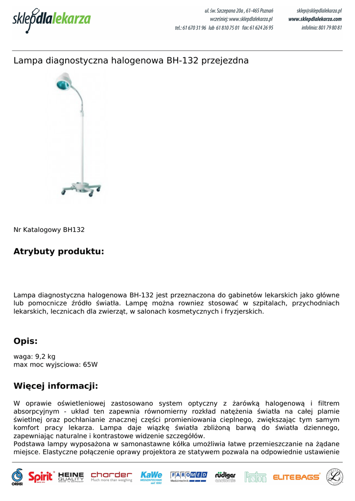 Lampa diagnostyczna halogenowa BH-132 przejezdna Nr Katalogowy BH132 Atrybuty produktu: Lampa diagnostyczna halogenowa BH-132 jest przeznaczona do gabinetów lekarskich jako główne lub pomocnicze źródło światła. Lampę można rowniez stosować w szpitalach, przychodniach lekarskich, lecznicach dla zwierząt, w salonach kosmetycznych i fryzjerskich. Opis: waga: 9,2 kg max moc wyjsciowa: 65W Więcej informacji: W oprawie oświetleniowej zastosowano system optyczny z żarówką halogenową i filtrem absorpcyjnym - układ ten zapewnia równomierny rozkład natężenia światła na całej plamie świetlnej oraz pochłanianie znacznej części promieniowania cieplnego, zwiększając tym samym komfort pracy lekarza. Lampa daje wiązkę światła zbliżoną barwą do światła dziennego, zapewniając naturalne i kontrastowe widzenie szczegółów. Podstawa lampy wyposażona w samonastawne kółka umożliwia łatwe przemieszczanie na żądane miejsce. Elastyczne połączenie oprawy projektora ze statywem pozwala na odpowiednie ustawienie kierunku wiązki światła. Rury statywu połączone teleskopowo umożliwiają duży zakres regulacji wysokości oprawy od 1670 do 2170 mm, co pozwala dostosować jej położenie do żądanych potrzeb. Obrót pokrętła na oprawie pozwala na zmianę bryły fotometrycznej padającego światła w taki sposób, że wiązka światła może być zbieżna, równoległa lub rozbieżna. PARAMETRY TECHNICZNE: napięcie zasilania 230V; 50, Hz, napięcie żarówki 24V/22V, moc żarówki 65W, trwałość żarówki 1000 h, natężenie światła z odległości 1m - 30000lx, temperatura barwowa 4000oK, zakres zmiany natężenia oświetlenia - 20%, wskaźnik oddawania barw Ra 90, wielkość plamy świetlnej w odległości 1m - 120mm, rodzaj ochrony przed porażeniem elektrycznym II, waga 9,2 kg. Powered by TCPDF (www.tcpdf.org)