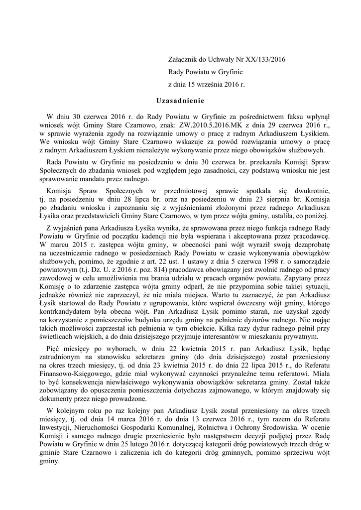 Załącznik do Uchwały Nr XX/133/2016 Rady Powiatu w Gryfinie z dnia 15 września 2016 r. Uzasadnienie W dniu 30 czerwca 2016 r. do Rady Powiatu w Gryfinie za pośrednictwem faksu wpłynął wniosek wójt Gminy Stare Czarnowo, znak: ZW.2010.5.2016.MK z dnia 29 czerwca 2016 r., w sprawie wyrażenia zgody na rozwiązanie umowy o pracę z radnym Arkadiuszem Łysikiem. We wniosku wójt Gminy Stare Czarnowo wskazuje za powód rozwiązania umowy o pracę z radnym Arkadiuszem Łyskiem nienależyte wykonywanie przez niego obowiązków służbowych. Rada Powiatu w Gryfinie na posiedzeniu w dniu 30 czerwca br. przekazała Komisji Spraw Społecznych do zbadania wniosek pod względem jego zasadności, czy podstawą wniosku nie jest sprawowanie mandatu przez radnego. Komisja Spraw Społecznych w przedmiotowej sprawie spotkała się dwukrotnie, tj. na posiedzeniu w dniu 28 lipca br. oraz na posiedzeniu w dniu 23 sierpnia br. Komisja po zbadaniu wniosku i zapoznaniu się z wyjaśnieniami złożonymi przez radnego Arkadiusza Łysika oraz przedstawicieli Gminy Stare Czarnowo, w tym przez wójta gminy, ustaliła, co poniżej. Z wyjaśnień pana Arkadiusza Łysika wynika, że sprawowana przez niego funkcja radnego Rady Powiatu w Gryfinie od początku kadencji nie była wspierana i akceptowana przez pracodawcę. W marcu 2015 r. zastępca wójta gminy, w obecności pani wójt wyraził swoją dezaprobatę na uczestniczenie radnego w posiedzeniach Rady Powiatu w czasie wykonywania obowiązków służbowych, pomimo, że zgodnie z art. 22 ust. 1 ustawy z dnia 5 czerwca 1998 r. o samorządzie powiatowym (t.j. Dz. U. z 2016 r. poz. 814) pracodawca obowiązany jest zwolnić radnego od pracy zawodowej w celu umożliwienia mu brania udziału w pracach organów powiatu. Zapytany przez Komisję o to zdarzenie zastępca wójta gminy odparł, że nie przypomina sobie takiej sytuacji, jednakże również nie zaprzeczył, że nie miała miejsca. Warto tu zaznaczyć, że pan Arkadiusz Łysik startował do Rady Powiatu z ugrupowania, które wspierał ówczesny wójt gminy, którego kontrkandydatem była obecna wójt. Pan Arkadiusz Łysik pomimo starań, nie uzyskał zgody na korzystanie z pomieszczeńw budynku urzędu gminy na pełnienie dyżurów radnego. Nie mając takich możliwości zaprzestał ich pełnienia w tym obiekcie. Kilka razy dyżur radnego pełnił przy świetlicach wiejskich, a do dnia dzisiejszego przyjmuje interesantów w mieszkaniu prywatnym. Pięć miesięcy po wyborach, w dniu 22 kwietnia 2015 r. pan Arkadiusz Łysik, będąc zatrudnionym na stanowisku sekretarza gminy (do dnia dzisiejszego) został przeniesiony na okres trzech miesięcy, tj. od dnia 23 kwietnia 2015 r. do dnia 22 lipca 2015 r., do Referatu Finansowo-Księgowego, gdzie miał wykonywać czynności przynależne temu referatowi. Miała to być konsekwencja niewłaściwego wykonywania obowiązków sekretarza gminy. Został także zobowiązany do opuszczenia pomieszczenia dotychczas zajmowanego, w którym znajdowały się dokumenty przez niego prowadzone. W kolejnym roku po raz kolejny pan Arkadiusz Łysik został przeniesiony na okres trzech miesięcy, tj. od dnia 14 marca 2016 r. do dnia 13 czerwca 2016 r., tym razem do Referatu Inwestycji, Nieruchomości Gospodarki Komunalnej, Rolnictwa i Ochrony Środowiska. W ocenie Komisji i samego radnego drugie przeniesienie było następstwem decyzji podjętej przez Radę Powiatu w Gryfinie w dniu 25 lutego 2016 r. dotyczącej kategorii dróg powiatowych trzech dróg w gminie Stare Czarnowo i zaliczenia ich do kategorii dróg gminnych, pomimo sprzeciwu wójt gminy. Z wyjaśnień radnego wynikało, że wójt gminy była niezadowolona z decyzji Zarządu Powiatu o skierowanie przedmiotowej sprawy pod obrady Rady Powiatu, jak również oczekiwała od radnego pozytywnego dla gminy załatwienia sprawy, chociaż wiadomo było, że jednoosobowo nie mógł on w żaden sposób zmienić decyzji organu kolegialnego. Potwierdzeniem stanu niezadowolenia może być również artykuł, jaki ukazał się w sierpniowym wydaniu gazety gminnej Starego Czarnowa pt. „Kontrowersyjny prezent”. W odczuciu Komisji przenoszenie pana Arkadiusza Łysika na inne stanowiska i powierzanie zadań niezgodnych z zajmowanym przez niego stanowiskiem i wykształceniem jest wyrażeniem dezaprobaty wobec jego osoby, co również u samego radnego wywołały zaniżoną ocenę przydatności zawodowej oraz godziło w jego godność, dobra osobiste i negatywnie wpłynęły na stan zdrowia. Pan Arkadiusz Łysik, chcąc realizować obietnice wyborcze, w lutym 2015 r. włączył się w starania polegające na budowie chodnika w ciągu ulicy Szczecińskiej w m. Stare Czarnowo, prowadzącym do boiska sportowego „Orlik”, które początkowo spotkały sięz zadowoleniem wójt gminy. W trakcie uszczegóławiania inwestycji, Gmina zobowiązała się dofinansować inwestycję Powiatu i przedłużyć budowany chodnik do lokalnego przedsiębiorstwa. W końcowym efekcie, w czerwcu 2016 r. radny Arkadiusz Łysik w wydanej przez siebie ulotce poinformował o tym mieszkańców, zaznaczając, że inwestycję w ramach współpracy dofinansowuje Gmina Stare Czarnowo, co spotkało się z niezadowoleniem wójt gminy. W sierpniowym wydaniu gazety gminnej Starego Czarnowa pojawił się artykuł mówiący o zakończeniu ww. inwestycji „(…) Obiecany mieszkańcom przez Wójta Marzenę Grzywińską chodnik w ciągu ulicy Szczecińskiej w miejscowości Stare Czarnowo, stał się faktem. Za 150 tysięcy złotych wybudowany został chodnik prowadzący m.in. do boiska Orlik (…)”. W artykule nie wspomniano, że to Powiat budował ten chodnik, ani też nie podano, kto się o jego budowę starał. Istotnym dla Komisji był fakt, że wizerunek radnego Rady Powiatu pana Arkadiusza Łysika pomijany jest w lokalnych środkach masowego przekazu. Jednym z przykładów mogła być sytuacja, kiedy radny brał udział przy odbiorze chodnika przy ul. Szczecińskiej w Star