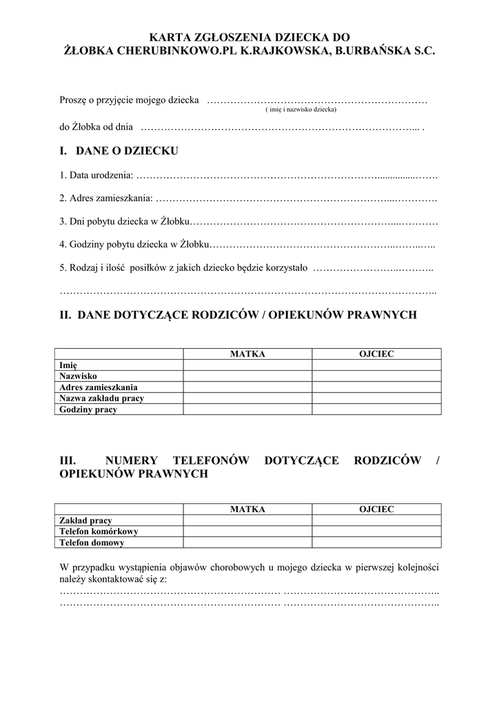 KARTA ZGŁOSZENIA DZIECKA DO ŻŁOBKA CHERUBINKOWO.PL