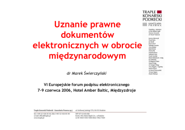Uznanie prawne dokumentów elektronicznych w obrocie międzynarodowym dr Marek Świerczyński VI Europejskie forum podpisu elektronicznego 7-9 czerwca 2006, Hotel Amber Baltic, Międzyzdroje Agenda • Regulacje międzynarodowe dotyczące dokumentów elektronicznych • Liberalizacja formy w obrocie międzynarodowym • Uznawanie zagranicznych certyfikatów kwalifikowanych • Forma elektroniczna w prawie prywatnym międzynarodowym • Postulaty de lege ferenda Działalność UNCITRAL w zakresie handlu międzynarodowego i dokumentów elektronicznych • Dokumentacja grupy roboczej ds. handlu elektronicznego w sprawie barier prawnych związanych z dokumentami elektronicznymi w obrocie międzynarodowym jest dostępna na stronie http://www.uncitral.org/uncitral/en/commission/working_g roups/4Electronic_Commerce.html – Legal aspects of electronic commerce - Legal barriers to the development of electronic commerce in international instruments relating to international trade: ways of overcoming them – Interpretacja pojęć: „pisemność”, „podpis”, „dokument” – Rozwiązanie: Konwencja UNCITRAL z 2005 r.? Przykładowe regulacje dotyczące obrotu międzynarodowego • Regulacje ogólne – – – Art. 9 konwencji ONZ z 23 listopada 2005 r. o korzystaniu z komunikacji elektronicznej w międzynarodowych umowach (Konwencja UNCITRAL z 2005 r.) Ustawy modelowe UNCITRAL: ustawa modelowa o handlu elektronicznym z 1996 r.( zm. 1998 r.) i ustawa modelowa o podpisach elektronicznych z 2001. Dyrektywy UE: dyrektywa o podpisach elektronicznych z 1999 r., dyrektywa o handlu elektronicznym z 2000 r. • Regulacje szczególne – Art. 23 ust. 2 rozporządzenia WE nr 44/2001 w sprawie jurysdykcji krajowej • Wszelka korespondencja za pomocą środków elektronicznych, która pozostawia trwały zapis będzie równoznaczna z "pismem". – Art. 1162. § 2 k.p.c. • Wymaganie dotyczące formy zapisu na sąd polubowny jest spełnione takŜe wtedy, gdy zapis zamieszczony został w wymienionych między stronami pismach lub oświadczeniach złoŜonych za pomocą środków porozumienia się na odległość, które pozwalają utrwalić ich treść.(…) Kazus: Problem formy umowy o arbitraŜ • Art. 1162. § 2 k.p.c. – Wymaganie dotyczące formy zapisu na sąd polubowny jest spełnione takŜe wtedy, gdy zapis zamieszczony został w wymienionych między stronami pismach lub oświadczeniach złoŜonych za pomocą środków porozumienia się na odległość, które pozwalają utrwalić ich treść.(…) • Art. II (2) Konwencji Nowojorskiej z 10 czerwca 1958 r. o uznawaniu i wykonywaniu zagranicznych orzeczeń arbitraŜowych • Określenie "umowa pisemna" oznacza zarówno klauzulę (…) podpisaną przez strony, jak i zawarte w wymianie listów lub telegramów • Art. 7. Ustawy modelowej UNCITRAL – (…) za formę pisemną uwaŜa się nie tylko dokument podpisany przez strony, ale równieŜ wymianę listów, teleksów, telegramów lub wykorzystanie innych środków komunikowania się na odległość, które potwierdzają fakt dokonania czynności (…) Konwencja UNCITRAL z 2005 r. (1) • Zakres zastosowania: wykorzystanie komunikacji elektronicznej w związku z zawieraniem i wykonywaniem umów pomiędzy stronami z siedzibą handlową (place of business) w róŜnych państwach (art.1 ust. 1) • Kryterium podmiotowe: siedziby handlowe stron w róŜnych państwach – stronach konwencji; fakt ten musi wynikać z umowy bądź ustaleń stron (art.1 ust. 2); brak znaczenia elementów technicznych bądź adresów internetowych dla wyznaczenia siedziby (art. 6 ust. 4 i 5) • Autonomia woli stron: strony mogą wyłączyć bądź zmienić skutek postanowień konwencji (art. 3) Konwencja UNCITRAL z 2005 r. (2) • Wymagania co do formy (art. 9) – Wymóg pisemności – informacja jest dostępna w razie potrzeby konsultacji – Wymóg podpisu - wykorzystanie metody zapewniającej jednoznaczną identyfikację strony – Wymóg oryginału – zapewnienie integralności informacji od chwili jej utworzenia; zapewnienie jej dostępności w razie potrzeby konsultacji Liberalizacja wymogów formalnych (przykłady) • Art. 11 konwencji Narodów Zjednoczonych o umowach międzynarodowej sprzedaŜy towarów – Umowa sprzedaŜy nie wymaga do jej zawarcia lub potwierdzenia formy pisemnej i nie podlega Ŝadnym innym wymogom co do formy. Umowa sprzedaŜy moŜe być udowodniona w jakikolwiek sposób, w tym równieŜ na podstawie zeznań świadków. • Zmiany w kodeksie cywilnym: – Art. 74 § 3 k.c. – przepisów o formie pisemnej przewidzianej dla celów dowodowych nie stosuje się do czynności prawnych w stosunkach między przedsiębiorcami – Uchylenie art. 75 (wymóg formy pisemnej dla czynności o wartości powyŜej 2 tyś zł) Uznawanie certyfikatów zagranicznych Art. 4 ustawy o podpisie elektronicznym • Certyfikat wydany przez podmiot świadczący usługi certyfikacyjne, niemający siedziby na terytorium Rzeczypospolitej Polskiej i nieświadczący usług na jej terytorium, zrównuje się pod względem prawnym z kwalifikowanymi certyfikatami wydanymi przez kwalifikowany podmiot świadczący usługi certyfikacyjne, mający siedzibę lub świadczący usługi na terytorium Rzeczypospolitej Polskiej, jeŜeli zostanie spełniona jedna z poniŜszych przesłanek: – podmiot świadczący usługi certyfikacyjne, który wydał ten certyfikat, został wpisany do rejestru kwalifikowanych podmiotów świadczących usługi certyfikacyjne, – przewiduje to umowa międzynarodowa, której stroną jest Rzeczpospolita Polska, o wzajemnym uznaniu certyfikatów, – podmiot świadczący usługi certyfikacyjne, który wydał ten certyfikat, spełnia wymagania ustawy i została mu udzielona akredytacja w państwie członkowskim Unii Europejskiej, – podmiot świadczący usługi certyfikacyjne, mający siedzibę na terytorium Wspólnoty Europejskiej, spełniający wymogi ustawy, udzielił gwarancji za ten certyfikat, certy