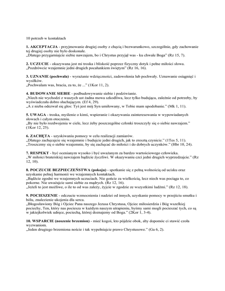 10 potrzeb w kontaktach 1. AKCEPTACJA - przyjmowanie drugiej osoby z chęcią i bezwarunkowo, szczególnie, gdy zachowanie tej drugiej osoby nie było doskonałe. „Dlatego przygarniajcie siebie nawzajem, bo i Chrystus przyjął was - ku chwale Boga” (Rz 15, 7). 2. UCZUCIE - okazywana jest mi troska i bliskość poprzez fizyczny dotyk i pełne miłości słowa. „Pozdrówcie wzajemnie jedni drugich pocałunkiem świętym” (Rz 16, 16). 3. UZNANIE (pochwała) - wyrażanie wdzięczności, zadowolenia lub pochwały. Uznawanie osiągnięć i wysiłków. „Pochwalam was, bracia, za to, że ...” (1Kor 11, 2). 4. BUDOWANIE SIEBIE - podbudowywanie siebie i podziwianie. „Niech nie wychodzi z waszych ust żadna mowa szkodliwa, lecz tylko budująca, zależnie od potrzeby, by wyświadczała dobro słuchającym. (Ef 4, 29). „A z nieba odezwał się głos: Tyś jest mój Syn umiłowany, w Tobie mam upodobanie.” (Mk 1, 11). 5. UWAGA - troska, myślenie o kimś, wspieranie i okazywania zainteresowania w wypowiadanych słowach i całym otoczeniu. „By nie było rozdwojenia w ciele, lecz żeby poszczególne członki troszczyły się o siebie nawzajem.” (1Kor 12, 25). 6. ZACHĘTA - uzyskiwaniu pomocy w celu realizacji zamiarów. „Dlatego zachęcajcie się wzajemnie i budujcie jedni drugich, jak to zresztą czynicie.” (1Tes 5, 11). „Troszczmy się o siebie wzajemnie, by się zachęcać do miłości i do dobrych uczynków.” (Hbr 10, 24). 7. RESPEKT - być ocenianym wysoko i być uważanym za bardzo wartościowego człowieka. „W miłości braterskiej nawzajem bądźcie życzliwi. W okazywaniu czci jedni drugich wyprzedzajcie.” (Rz 12, 10). 8. POCZUCIE BEZPIECZEŃSTWA (pokoju) - spotkanie się z pełną wolnością od ucisku oraz uzyskanie pełnej harmonii we wzajemnych kontaktach. „Bądźcie zgodni we wzajemnych uczuciach. Nie gońcie za wielkością, lecz niech was pociąga to, co pokorne. Nie uważajcie sami siebie za mądrych. (Rz 12, 16). „Jeżeli to jest możliwe, o ile to od was zależy, żyjcie w zgodzie ze wszystkimi ludźmi.” (Rz 12, 18). 9. POCIESZENIE - odczucie wzmocnienia i nadziei od innych, uzyskanie pomocy w przejściu smutku i bólu, znalezienie ukojenia dla serca. „Błogosławiony Bóg i Ojciec Pana naszego Jezusa Chrystusa, Ojciec miłosierdzia i Bóg wszelkiej pociechy, Ten, który nas pociesza w każdym naszym utrapieniu, byśmy sami mogli pocieszać tych, co są w jakiejkolwiek udręce, pociechą, której doznajemy od Boga.” (2Kor 1, 3-4). 10. WSPARCIE (noszenie brzemion) - mieć kogoś, kto pójdzie obok, aby dopomóc ci stawić czoła wyzwaniom. „Jeden drugiego brzemiona noście i tak wypełniajcie prawo Chrystusowe.” (Ga 6, 2).