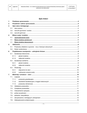 część II.S PP „Rozbudowa Szkoły – m.in. budowa sali gimnastycznej wraz z budową infrastruktury technicznej, zjazdu i 41-407 Imielin, przebudowa ulicy Dąbrowskiej” ul. Karola Miarki 7 Spis treści: 1. Podstawa opracowania ..........................................................................................................................4 2. Przedmiot i zakres opracowania ...........................................................................................................4 3. Opis stanu istniejącego .........................................................................................................................4 4. 5. 6. 3.1. stan prawny .........................................................................................................................................4 3.2. warunki gruntowe i wodne ...................................................................................................................4 3.3. warunki górnicze .................................................................................................................................5 Bilans wody i ścieków ...........................................................................................................................5 4.1. zapotrzebowanie wody ........................................................................................................................5 4.2. Bilans ścieków sanitarnych .................................................................................................................6 4.3. Bilans ścieków deszczowych ..............................................................................................................6 Obliczenia ................................................................................................................................................6 5.1. Przewody układane w gruncie – rury z tworzyw sztucznych ..............................................................6 5.2. Dobór wodomierza ..............................................................................................................................7 Projektowane rozwiązania – uzbrojenie liniowe .................................................................................8 6.1. 6.1.1. jakość ścieków ..........................................................................................................................8 6.1.2. odbiornik ścieków ......................................................................................................................8 6.2. kanalizacja sanitarna ...........................................................................................................................8 6.2.1. jakość ścieków ..........................................................................................................................9 6.2.2. odbiornik ścieków ......................................................................................................................9 6.3. 7. kanalizacja deszczowa ........................................................................................................................8 Wodociąg ..........................................................................................................................................10 6.3.1. włączenie do sieci ...................................................................................................................10 6.3.2. rozliczenie zużycia wody .........................................................................................................10 Materiały i armatura – sieci .................................................................................................................10 7.1. materiał ..............................................................................................................................................10 7.1.1. przewody grawitacyjne ............................................................................................................10 7.1.2. studzienki kanalizacyjne z kręgów betonowych ......................................................................10 7.1.3. przewody ciśnieniowe .............................................................................................................11 7.2. Układanie przewodów .......................................................................................................................11 7.3. Ocieplenie przewodów ......................................................................................................................11 7.4. Odwodnienie wykopów......................................................................................................................12 7.5. próba szczelności ..............................................................................................................................12 7.6. płukanie i dezynfekcja .......................................................................................................................12 7.7. skrzyżowanie z istniejącym uzbrojeniem ..........................................................................................13 7.8. Zabezpieczenia antykorozyjne ..........................................................................................................13 -1- część II.S PP „Rozbudowa Szkoły – m.in. budowa sali gimnastycznej wraz z budową infrastruktury technicznej, zjazdu i 41-407 Imielin, przebudowa ulicy Dąbrowskiej” ul. Karola Miarki 7 8. Sposób zabezpieczenia wykopów ......................................................................................................13 9. Założenia dla innych branż ..................................................................................................................14 9.1. założenia dla branży elektrycznej .....................................................................................................15 1