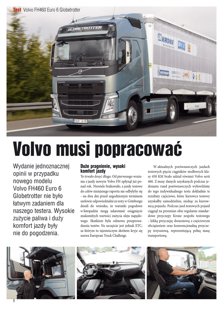 Test Volvo FH460 Euro 6 Globetrotter Volvo musi popracować Duże pragnienie, wysoki Wydanie jednoznacznej komfort jazdy opinii w przypadku To trwało dosyć długo. Od pierwszego wrażenia z jazdy nowym Volvo FH upłynął już ponowego modelu nad rok. Niewiele brakowało, a jazdy testowe Volvo FH460 Euro 6 do celów niniejszego raportu nie odbyłyby się – na dwa dni przed uzgodnionym terminem Globetrotter nie było szefowie odpowiedzialni za testy w Göteborgu łatwym zadaniem dla doszli do wniosku, że warunki pogodowe naszego testera. Wysokie w listopadzie mogą udaremnić osiągnięcie znakomitych wartości zużycia oleju napędozużycie paliwa i duży wego. Skutkiem była odmowa przeprowadzenia testów. Na szczęście jest jednak ETC, komfort jazdy były za którym to tajemniczym skrótem kryje się nie do pogodzenia. nazwa European Truck Challenge. W aktualnych porównawczych jazdach testowych pięciu ciągników siodłowych klasy 450 KM brało udział również Volvo serii 460. Z masy danych uzyskanych podczas jedenastu rund porównawczych wyłowiliśmy do tego indywidualnego testu dokładnie te rezultaty częściowe, które kierowca testowy uzyskałby samodzielnie, siedząc za kierownicą pojazdu. Podczas jazd testowych pojazd ciągnął na przemian obie regularne standardowe przyczepy Krone zespołu testowego – lekką przyczepę dwuosiową z częściowym obciążeniem oraz konwencjonalną przyczepę trzyosiową, reprezentującą pełną masę transportową. Wartości zużycia paliwa uzyskane w tych warunkach wyniosły odpowiednio 34,0 l/100 km przy pełnym obciążeniu i 26,8 l/100 km przy połowie obciążenia na siodle. Teoretycznie zużycie na poziomie 34,0 l/100 km w czasach starej, odchodzącej do lamusa normy Euro 5 dla 40-tonowego pojazdu klasy 2300 Nm jest całkiem przyzwoitym wynikiem. To samo dotyczy wyników uzyskanych przy częściowym obciążeniu. Z drugiej jednak strony, już od roku dostępne są pierwsze ciężarówki MercedesBenz spełniające wymagania normy Euro 6. Od kiedy pojazdy te pojawiły się w parkach maszyn i na trasach testowych specjalistycznych czasopism, oczywiste jest jedno: samochody klasy Euro 6 nie spalają więcej, a mniej oleju napędowego niż ich „brudniejsi” poprzednicy. Jeszcze nie całkiem dopracowany? Actros 1843 wykazał się w teście spalaniem 32,3 l/100 km. MAN z TGX 18.480 poszedł za jego przykładem (31,9 l/100 km), również Iveco ze swoim modelem 460 Stralis nie pozostaje w tyle (33,0 l/100 km). W obliczu tych danych wynik Volvo nie prezentuje się już tak okazale, jak chcieliby to przedstawić autorzy tekstów reklamowych. Jednakże szwedzkiej marce udało się osiągnąć pewien postęp. W historii normy Euro 5 żaden pojazd Volvo nie zwrócił na siebie uwagi faktycznie wyróżniającymi się wartościami zużycia. Średnia wartość dla wszystkich wyprodukowanych od roku 2009 szwedzkich samochodów ciężarowych z Göteborga wynosi 35,0 l/100 km. To, że w tym zestawieniu nie ujęto samochodów z potężnym silnikiem o pojemności 16 litrów Szwedzki pojazd przy stawce wynoszącej 81,56 centów na kilometr plasuje się znacznie powyżej klasy porównawczej Euro 6 Wkrótce na rynku: Volvo FH16 Euro 6. Ilustracja poniżej: Nowy silnik Nadejdzie wraz z wiosną Wiosną 2014 roku na rynek zostanie wprowadzony okręt flagowy Volvo Trucks, Volvo FH16 w konfiguracji Euro 6. – Jesteśmy dumni z tego, że spełniliśmy wymagania normy czystości spalin Euro 6, równocześnie uzyskując najlepsze parametry jazdy i mocy na rynku. Również zużycie paliwa jest konkurencyjne – powiedziała Kristin Signert, kierownik sektora ruchu dalekobieżnego firmy Volvo Truck. Nowa seria silników Euro 6 jest dostępna w trzech klasach mocy: 750 KM (3550 Nm), 650 KM (3150 Nm) i 550 KM jest kwestią uczciwości – przy uwzględnieniu tego modelu średnia byłaby jeszcze o cały litr wyższa. Z tego względu średnia 34,0 l/100 km uzyskana przez nowe Volvo FH 460, zgodnie z normą Euro 6 jest w sumie znakomitym rezultatem. To, co mniej nam się podoba, to zmierzona wartość zużycia AdBlue. Po zakończeniu jazd testowych stwierdzono zużycie (2900 Nm). Wszystkie trzy silniki są dostosowane do zautomatyzowanej przekładni IShift firmy Volvo. Wersja silnika o mocy 550 KM jest również dostępna w wariancie z momentem obrotowym 2800 Nm do zastosowań w połączeniu ze skrzynią manualną. FH16 jest według firmy Volvo jednym z najwydajniejszych i najsilniejszych pojazdów w branży, który jest wysoko ceniony przez firmy spedycyjne oraz przez kierowców o najwyższych oczekiwaniach, którzy cenią sobie większą moc, większą produktywność oraz komfort. Jest on stosowany na przykład jako ciągnik do transportów ciężkich, do transportu drewna oraz w krytycznej pod względem czasowym komunikacji dalekobieżnej, na przykład w transporcie artykułów spożywczych. Aktualna wersja pojazdu została zaprezentowana jesienią 2012 roku. Sprzedaż Volvo FH16 z silnikiem Euro 6 rozpocznie się w marcu 2014. Rozpoczęcie produkcji jest planowane na początek czerwca. 2,7 l/100 km lub 8,2 procent zużycia oleju napędowego. Dla pojazdu, w którego przypadku oprócz podzespołów SCR wpływ na zmniejszenie szkodliwych emisji ma jeszcze skomplikowany i w znacznej mierze ciężki system odprowadzania spalin (AGR), według obecnie znanego stanu techniki jest to zdecydowanie zbyt dużo. Dla porównania: Iveco Stralis, jako przykładowy samochód Test Volvo FH460 Euro 6 Globetrotter Zestawienie kosztów Volvo FH 460 Globetrotter Euro 6; eksploatacja przy pełnym obciążeniu Ciągnik siodłowy; dalekobieżny przewóz towarów Silnik: Pojemność/moc [l/KM] Dopuszczalny ciężar całkowity [kg] Ciężar brutto ładunku podczas testu [kg] Warunki ekonomiczne (ceny dla rynku niemieckiego) Full-Service-Leasing (1) [Euro/miesiąc] Dni pracy [dni/rok] Okres eksploatacji [miesiące] Przebieg pojazdu [km/rok] Przebieg pojazdu po płatnych autostradach