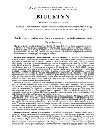 BIULETYN Nr 50 (915) 18 maja 2012 © PISM Redakcja: Marcin Zaborowski (redaktor naczelny), Katarzyna Staniewska (sekretarz redakcji), Jarosław Ćwiek-Karpowicz, Beata Górka-Winter, Artur Gradziuk, Beata Wojna Serbia przed drugą turą wyborów prezydenckich i powołaniem nowego rządu Tomasz Żornaczuk Wyniki wyborów parlamentarnych w Serbii (6 maja br.) nie zmienią zasadniczo sceny politycznej w tym kraju ani prozachodniego kursu jego rządu. Natomiast wpływ na rozmowy z Unią Europejską i dialog z Kosowem może mieć rozstrzygnięcie drugiej tury wyborów prezydenckich (20 maja br.). Niezależnie od jej wyniku UE powinna kontynuować działania w celu rozpoczęcia negocjacji akcesyjnych z Serbią. Wybory parlamentarne i prawdopodobna koalicja rządowa. W wyborach parlamentarnych w Serbii wygrała prawicowa Serbska Partia Postępu (SNS), największa partia opozycyjna, uzyskując 24% głosów. Główna partia z koalicji rządowej – centrowa Partia Demokratyczna (DS) – zdobyła 22% głosów. Natomiast na drugiego koalicjanta, lewicową Socjalistyczną Partię Serbii (SPS), głosowało 14,5% wyborców. Ponadto do składającego się z 250 parlamentarzystów Zgromadzenia Narodowego weszła z 7-procentowym poparciem Demokratyczna Partia Serbii (DSS), będąca jedyną eurosceptyczną siłą w parlamencie. 5-procentowy próg wyborczy przekroczyły także dwa mniejsze ugrupowania liberalne. Wszystkie te partie współtworzyły dotychczasowy parlament, natomiast poza nim znalazła się skrajnie nacjonalistyczna Serbska Partia Radykalna. Skład nowego Zgromadzenia Narodowego uzupełni 10 posłów z partii mniejszości narodowych, w tym połowa z ugrupowań węgierskich, a pozostali m.in. z partii bośniackich i albańskiej, dla których próg wyborczy wynosi 0,4%. Frekwencja w wyborach wyniosła prawie 58%. Zostały one uznane za demokratyczne przez obserwatorów międzynarodowych. Pomimo wyborczego zwycięstwa prawicowego SNS partia ta prawdopodobnie pozostanie w opozycji. Przy takim poparciu nie zdoła bowiem zbudować koalicji większościowej, gdyż jej jedynym partnerem mogłaby być eurosceptyczna DSS, co jednak gwarantowałoby jedynie trzecią część miejsc w parlamencie. Tym bardziej, że mająca dużą zdolność koalicyjną lewicowa SPS, której rola była kluczowa również przy formowaniu dotychczasowego rządu, zapowiedziała gotowość kontynuowania współpracy w rządzie z DS. Koalicję uzupełnią zapewne posłowie partii mniejszościowych, co było praktyką także w dotychczasowej koalicji rządowej. Dzięki podwojeniu liczby mandatów przez partię socjalistyczną (obecnie 44) pozycja SPS w przyszłej koalicji z DS (67 mandatów) będzie silniejsza niż w poprzednim rządzie. Dlatego prawdopodobnie w negocjacjach składu rządu ugrupowanie to zażąda stanowiska premiera. Może je otrzymać ze względu na swój potencjał koalicyjny, a także na zmarginalizowaną w ostatnich latach rolę premiera w polityce zagranicznej Serbii, do czego przyczyniła się niewielka aktywność międzynarodowa obecnego szefa rządu Mirka Cvetkovicia z DS. Nawet jeśli mniejsze ugrupowanie koalicyjne nie otrzyma teki premiera, do której objęcia gotów jest lider SPS i wicepremier Ivica Dačić, z pewnością zyska kilka istotnych stanowisk ministerialnych. Nierozstrzygnięte wybory prezydenckie. W pierwszej turze wyborów prezydenckich, zorganizowanych wraz z parlamentarnymi, największe poparcie zdobyli lider DS i dotychczasowy prezydent Boris Tadić (25,3%) oraz przewodniczący SNS Tomislav Nikolić (25,1%). Kandydaci z pozostałych partii uzyskali wyniki niemal identyczne z tymi, jakie te ugrupowania zanotowały w wyborach parlamentarnych. Trzeci w wyborach prezydenckich Dačić z koalicyjnej SPS poparł kandydaturę Tadicia. Uczyniła to również większość partii mniejszości narodowych. Przeprowadzenie wyborów prezydenckich wraz z parlamentarnymi i samorządowymi umożliwiła decyzja prezydenta Tadicia 2677 Polski Instytut Spraw Międzynarodowych o ustąpieniu z urzędu na początku kwietnia br., przez co skrócił kadencję o kilka miesięcy. Jako najpopularniejszy polityk w Serbii, liczył, że wzmocni to pozycję jego partii w wyborach parlamentarnych. Ponadto takie posunięcie zmobilizowało społeczeństwo do powszechniejszego udziału w wyborach. Przed drugą turą wyborów faworytem jest Tadić, który w sondażach utrzymuje przewagę nad Nikoliciem. Tadić był prezydentem Serbii od 2004 r. Początkowo pełnił tę funkcję w ramach unii Serbii i Czarnogóry. Po jej rozpadzie i zmianie serbskiej konstytucji został wybrany w 2008 r. na pierwszą kadencję prezydenta Serbii jako niezależnego państwa. W polityce zagranicznej jego prezydentura charakteryzowała się przede wszystkim dążeniem do poprawy stosunków z sąsiadami. Za sukces tej polityki można uznać znaczne polepszenie trudnych przedtem relacji z Chorwacją oraz Bośnią i Hercegowiną. Priorytetem pierwszej kadencji była integracja europejska z jednoczesnym zachowaniem integralności terytorialnej Serbii. Pozycja prezydenta i koalicji rządowej umocniła się po przyznaniu Serbii przez UE w marcu br. statusu kandydata do członkostwa. Nikolić rywalizował z Tadiciem w drugiej turze wyborów prezydenckich zarówno w 2004, jak i w 2008 r. Jednakże wtedy startował jako kandydat nacjonalistycznej Serbskiej Partii Radykalnej, odrzucającej integrację z UE i dialog z Kosowem. Po przegranych wyborach prezydenckich i parlamentarnych w 2008 r. Nikolić utworzył nowe ugrupowanie SNS, które wobec ponad 60-procentowego poparcia społeczeństwa Serbii dla członkostwa tego kraju w Unii stało się partią umiarkowanie wspierającą integrację europejską. Krytykuje jednak politykę rządu i prezydenta Tadicia wobec Kosowa, którą ocenia jako uległą. Wnioski i rekomendacje. Sformowanie rządu przez centrową DS i lewicową SPS oznacza kontynuację dotychczasowej polityki Serbii. W porównaniu z poprzed