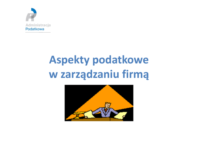 Aspekty podatkowe w zarządzaniu firmą Aspekty podatkowe w zarządzaniu firmą Przedsiębiorca przed urzędem skarbowym Zagadnienia wstępne Rejestracja firmy w urzędzie skarbowym Płacenie podatków przez przedsiębiorców Formy rozliczeo podatkowych Ewidencje księgowe Przedmiotowośd i podmiotowośd jednostki gospodarczej w ujęciu podatkowym Uwarunkowania przedmiotowe Uwarunkowania podmiotowe Przychody w działalności gospodarczej w świetle ustaw podatkowych Koszty uzyskania przychodów – podatkowe i poza podatkowe Podmiot gospodarczy jako płatnik podatków Kontrola podatkowa i skarbowa u przedsiębiorcy Wybrane zagadnienia z zakresu opodatkowania działalności gospodarczej Zmiany w przepisach podatkowych na rok 2012 2 Aspekty podatkowe w zarządzaniu firmą Zagadnienia wstępne Rejestracja firmy w urzędzie skarbowym • Obowiązek posiadania NIP • Zgłoszenie działalności gospodarczej • Aktualizacja danych objętych zgłoszeniem • Sukcesja NIP • Potwierdzenie NIP • Duplikat decyzji o nadaniu NIP 3 Aspekty podatkowe w zarządzaniu firmą Zagadnienia wstępne Formy rozliczeo podatkowych • • • • Formy płatności podatków Moment zapłaty podatku Podmiotowośd podatku Odsetki - konsekwencja wpłaty podatku po terminie 4 Aspekty podatkowe w zarządzaniu firmą Zagadnienia wstępne Ulgi w spłacie zobowiązao podatkowych • Uznaniowy charakter ulg • Umorzenie zaległości podatkowych z urzędu 5 Aspekty podatkowe w zarządzaniu firmą Zagadnienia wstępne Ewidencja księgowa • Formy uproszczone 1.Rozporządzenie MF z dnia 26 sierpnia 2003r. W sprawie prowadzenia podatkowej księgi przychodów i rozchodów ( Dz. U. Nr 152 z 2003r,poz 1475 z późn. zmianami 2. Rozporządzenie MF z dnia 17 grudnia 2002r. W sprawie prowadzenia ewidencji przychodów i wykazu środków trwałych oraz wartości niematerialnych i prawnych (Dz. U. Nr 219 z 2002r., poz. 1836 z późn.zm.) • Księgi rachunkowe 6 Aspekty podatkowe w zarządzaniu firmą Zagadnienia wstępne Ewidencja księgowa • Księgi rachunkowe Zgodnie z art. 24a ust. 4 ustawy o PDOF oraz z art. 2 ust. 1 pkt 2 ustawy o rachunkowości, obowiązek prowadzenia ksiąg rachunkowych dotyczy osób fizycznych, spółek cywilnych osób fizycznych, spółek jawnych osób fizycznych, spółek partnerskich (oraz spółdzielni socjalnych według ustawy o rachunkowości), jeżeli ich przychody, w rozumieniu art. 14 ustawy o PDOF (są to przychody z pozarolniczej działalności gospodarczej), a według ustawy o rachunkowości - przychody netto ze sprzedaży towarów, produktów i operacji finansowych, za poprzedni rok podatkowy (obrotowy według ustawy o rachunkowości) wyniosły w walucie polskiej co najmniej równowartośd 1.200.000 euro. 7 Aspekty podatkowe w zarządzaniu firmą • Jak z powyższego widad, inne przychody przyjmuje się dla ustalenia tego obowiązku według ustawy o PDOF, a inne według ustawy o rachunkowości. • Trzeba zatem porównywad, które z nich przekroczą ten limit. • Stosownie do art. 3 ust. 3 ustawy o rachunkowości kwotę tę należy przeliczyd na walutę polską po średnim kursie ogłoszonym przez Narodowy Bank Polski na dzieo 30 września 2011 r. • Średni kurs euro ogłoszony przez Narodowy Bank Polski na dzieo 30 września 2011 r. wyniósł 4,4112 zł/euro (zgodnie z tabelą kursów NBP z dnia 30 września 2011 r., nr 190/A/NBP/2011). • Zatem kwota zobowiązująca do prowadzenia ksiąg rachunkowych w roku 2012 wynosi: 1.200.000 euro x 4,4112 zł/euro = 5.293.440 zł. Ustawa z dnia 29 września 1994r. o rachunkowości (tekst jednolity: Dz. U. z 2002 r. nr 76, poz. 694 z późn. zm.) 8 Aspekty podatkowe w zarządzaniu firmą Zagadnienia wstępne Rozliczenia podatkowe o Składanie deklaracji w formie tradycyjnej o • • • • • Składanie deklaracji w formie elektronicznej Lista e-deklaracji Wyrobienie e-podpisu Formalności w urzędzie skarbowym Korekta e-deklaracji Potwierdzenie złożenia e-deklaracji 9 Aspekty podatkowe w zarządzaniu firmą Zagadnienia wstępne Rozliczenia podatkowe o Składanie deklaracji w formie elektronicznej • Lista e-deklaracji 10 Aspekty podatkowe w zarządzaniu firmą WYKAZ E-DEKLARACJI podatek od towarów i usług podatek dochodowy od osób prawnych podatek dochodowy od osób fizycznych podatek od czynności cywilnoprawnych VAT-7, VAT-7K, VAT-8, VAT9M, VAT-23, VAT-24, VAT-10, VAT-11, VAT-12, VAT-UE (wraz z załącznikami VATUE/A i VAT-UE/B, VAT-UE/C), VATUEK, VAT-R, VAT-Z, VAT-21, VAT-7D, VAT-REF CIT-8, CIT-8/O, CIT-D, CIT6R, CIT-6AR, CIT-9R, CIT10R, CIT-11R, CIT8A, CIT-8B, CIT-ST, CIT-ST/A PIT-4R, PIT-8AR, PIT-36, PIT36L, PIT-37, PIT-38, PIT/O, PIT/D, PIT-2K, PIT/M, PIT/B, PIT/Z, PIT/ZG, PIT-14, PIT-11, PIT-23, PIT-6/PIT-6L, PIT-8S, PIT-R, PIT-40, PIT-8C, PIT16, PIT-16A, PIT-19A, PIT-28, PIT-28/A, PIT-28/B, PIT-39 PCC-3, PCC-2 podatek od spadków i darowizn SD-2, SD-Z2, SD-3 inne WZP-1M, WZP-1K, WZP-1R, WZS-1M, WZS-1K, WZS-1R, ORD-TK, ORDW1, IFT-1/IFT-1R, IFT-2/IFT-2R, IFT-3/IFT-3R, IFT/A, ORD-U, SSE/A, SSE-R, SSE-R/A, ORD-ZU 11 Aspekty podatkowe w zarządzaniu firmą Przedmiotowośd i podmiotowośd jednostki gospodarczej w ujęciu podatkowym Uwarunkowania podmiotowe Uwarunkowania przedmiotowe 12 Aspekty podatkowe w zarządzaniu firmą Przedmiotowośd i podmiotowośd jednostki gospodarczej w ujęciu podatkowym Co to jest działalnośd gospodarcza? Dla potrzeb podatku PIT, działalnośd gospodarcza to działalnośd zarobkowa: • wytwórcza, budowlana, handlowa, usługowa, • polegająca na poszukiwaniu, rozpoznawaniu i wydobywaniu kopalin ze złóż, • polegająca na wykorzystywaniu rzeczy oraz wartości niematerialnych i prawnych — prowadzona we własnym imieniu bez względu na jej rezultat, w sposób zorganizowany i ciągły, z której uzyskane przychody nie są zaliczane do innych źródeł przychodów opodatkowanych podatkiem PIT. 13 Aspekty podatkowe w zarządzaniu firmą Przedmiotowośd i podmiotowośd jednostki gospodarczej w ujęc
