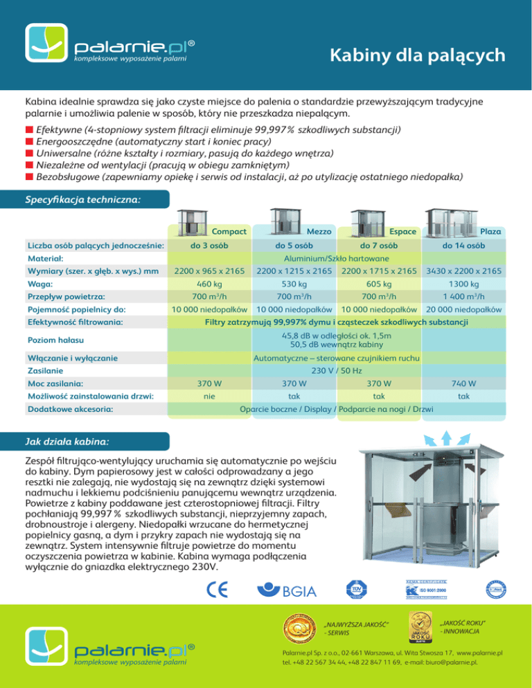 kompleksowe wyposażenie palarni pantone 389 C kompleksowe wyposażenie palarni ® Kabiny dla palących Kabina idealnie sprawdza się jako czyste miejsce do palenia o standardzie przewyższającym tradycyjne palarnie i umożliwia palenie w sposób, który nie przeszkadza niepalącym. ■ Efektywne (4-stopniowy system filtracji eliminuje 99,997% szkodliwych substancji) ■ Energooszczędne (automatyczny start i koniec pracy) ■ Uniwersalne (różne kształty i rozmiary, pasują do każdego wnętrza) ■ Niezależne od wentylacji (pracują w obiegu zamkniętym) ■ Bezobsługowe (zapewniamy opiekę i serwis od instalacji, aż po utylizację ostatniego niedopałka) Specyfikacja techniczna: Compact Liczba osób palących jednocześnie: do 3 osób Mezzo Espace do 5 osób Materiał: Plaza do 7 osób do 14 osób Aluminium/Szkło hartowane Wymiary (szer. x głęb. x wys.) mm 2200 x 965 x 2165 2200 x 1215 x 2165 2200 x 1715 x 2165 3430 x 2200 x 2165 460 kg 530 kg 605 kg 1300 kg 700 m /h 700 m /h 700 m /h 1 400 m3/h Waga: Przepływ powietrza: 3 3 3 Pojemność popielnicy do: 10 000 niedopałków 10 000 niedopałków 10 000 niedopałków 20 000 niedopałków Efektywność filtrowania: Filtry zatrzymują 99,997% dymu i cząsteczek szkodliwych substancji 45,8 dB w odległości ok. 1,5m 50,5 dB wewnątrz kabiny Poziom hałasu Włączanie i wyłączanie Automatyczne – sterowane czujnikiem ruchu Zasilanie 230 V / 50 Hz Moc zasilania: Możliwość zainstalowania drzwi: Dodatkowe akcesoria: 370 W 370 W 370 W 740 W nie tak tak tak Oparcie boczne / Display / Podparcie na nogi / Drzwi na białym tle Jak działa kabina: Zespół filtrująco-wentylujący uruchamia się automatycznie po wejściu do kabiny. Dym papierosowy jest w całości odprowadzany a jego resztki nie zalegają, nie wydostają się na zewnątrz dzięki systemowi nadmuchu i lekkiemu podciśnieniu panującemu wewnątrz urządzenia. Powietrze z kabiny poddawane jest czterostopniowej filtracji. Filtry pochłaniają 99,997% szkodliwych substancji, nieprzyjemny zapach, drobnoustroje i alergeny. Niedopałki wrzucane do hermetycznej popielnicy gasną, a dym i przykry zapach nie wydostają się na zewnątrz. System intensywnie filtruje powietrze do momentu kompleksowe wyposażenie palarni oczyszczenia powietrza w kabinie. Kabina wymaga podłączenia wyłącznie do gniazdka elektrycznego 230V. kompleksowe wyposażenie palarni ® ® kompleksowe wyposażenie palarni kompleksowe wyposażenie pa ® „NAJWYŻSZA JAKOŚĆ” - SERWIS kompleksowe wyposażenie palarni ® kolory „JAKOŚĆ ROKU” - INNOWACJA Palarnie.pl Sp. z o.o., 02-661 Warszawa, ul. Wita Stwosza 17, www.palarnie.pl pantone 3 pantone 3115 C tel. +48 22 567 34 44, +48 22 847 11 69, e-mail: [email protected].
