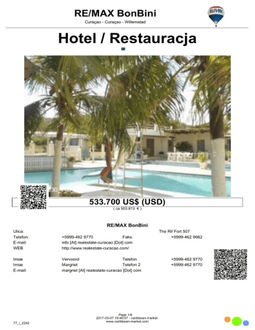 RE/MAX BonBini Curaçao - Curaçao - Willemstad Hotel / Restauracja 533.700 US$ (USD) ( ca 503.813 € ) RE/MAX BonBini Ulica: Telefon: E-mail: WEB +5999-462 9770 Faks: info [At] realestate-curacao [Dot] com http://www.realestate-curacao.com/ Imiæ Imiæ E-mail: Vervoord Telefon Margriet Telefon 2 margriet [At] realestate-curacao [Dot] com 77_i_2242 Page 1/6 2017-03-07 19:40:07 - caribbean-market www.caribbean-market.com The Rif Fort 507 +5999-462 9662 +5999-462 9770 +5999-462 9770 RE/MAX BonBini Curaçao - Curaçao - Willemstad Numer kodu Typ budynku Poùoýenie Materiaùy Property Address 77_i_2242 Numer kodu Hotel / Restauracja Nr referencyjny Seafront Status objektet Beton Rok KLEIN SANTHA MARTHA, J.B.L. Countryclub Powierzchnia dziaùki Firma Ýycie Kuchnia Sypialnie Zùy Opinie Toaleta 1500 m2 Powierzchnia Biznes Inne Usùugi Garaý Carport zadaszony taras Akcesoria Dzierýawa Taras Balkon Jetty Pokój Party Klimatyzacja Resort Ogród Pralnia Goràcy zadaszony taras ogrodzony / murem 77_i_2242 nwm1163593453 natychmiast potrzebne Page 2/6 2017-03-07 19:40:07 - caribbean-market www.caribbean-market.com 15 3 RE/MAX BonBini Curaçao - Curaçao - Willemstad 77_i_2242 Page 3/6 2017-03-07 19:40:07 - caribbean-market www.caribbean-market.com RE/MAX BonBini Curaçao - Curaçao - Willemstad 77_i_2242 Page 4/6 2017-03-07 19:40:07 - caribbean-market www.caribbean-market.com RE/MAX BonBini Curaçao - Curaçao - Willemstad 77_i_2242 Page 5/6 2017-03-07 19:40:07 - caribbean-market www.caribbean-market.com RE/MAX BonBini Curaçao - Curaçao - Willemstad 77_i_2242 Page 6/6 2017-03-07 19:40:07 - caribbean-market www.caribbean-market.com
