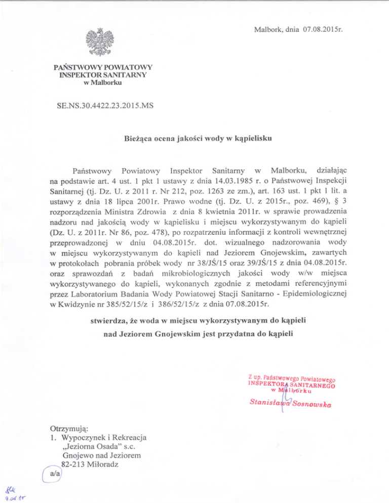 oraz sprawozdari z badan mikrobiologicznych jakoSci wody w/w miejsca