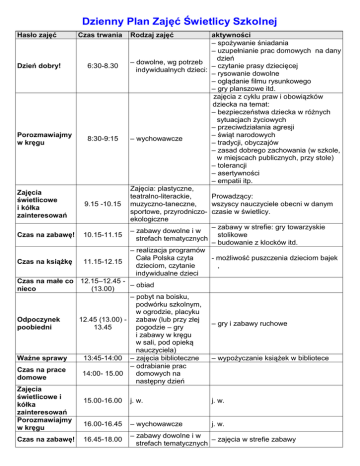 Dzienny Plan Zajęć Świetlicy Szkolnej