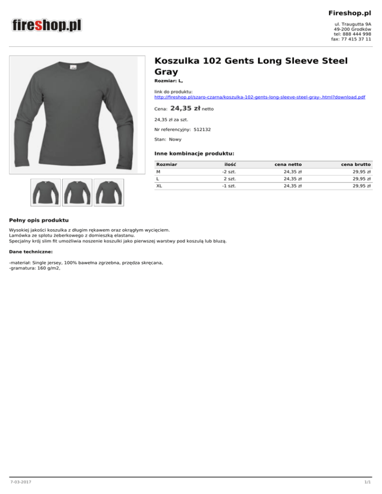 Fireshop.pl ul. Traugutta 9A 49-200 Grodków tel: 888 444 998 fax: 77 415 37 11 Koszulka 102 Gents Long Sleeve Steel Gray Rozmiar: L, link do produktu: http://fireshop.pl/szaro-czarna/koszulka-102-gents-long-sleeve-steel-gray-.html?download.pdf Cena: 24,35 zł netto 24,35 zł za szt. Nr referencyjny: 512132 Stan: Nowy Inne kombinacje produktu: Rozmiar ilość cena netto cena brutto M -2 szt. 24,35 zł 29,95 zł L 2 szt. 24,35 zł 29,95 zł -1 szt. 24,35 zł 29,95 zł XL Pełny opis produktu Wysokiej jakości koszulka z długim rękawem oraz okrągłym wycięciem. Lamówka ze splotu żeberkowego z domieszką elastanu. Specjalny krój slim fit umożliwia noszenie koszulki jako pierwszej warstwy pod koszulą lub bluzą. Dane techniczne: -materiał: Single jersey, 100% bawełna zgrzebna, przędza skręcana, -gramatura: 160 g/m2, 7-03-2017 1/1