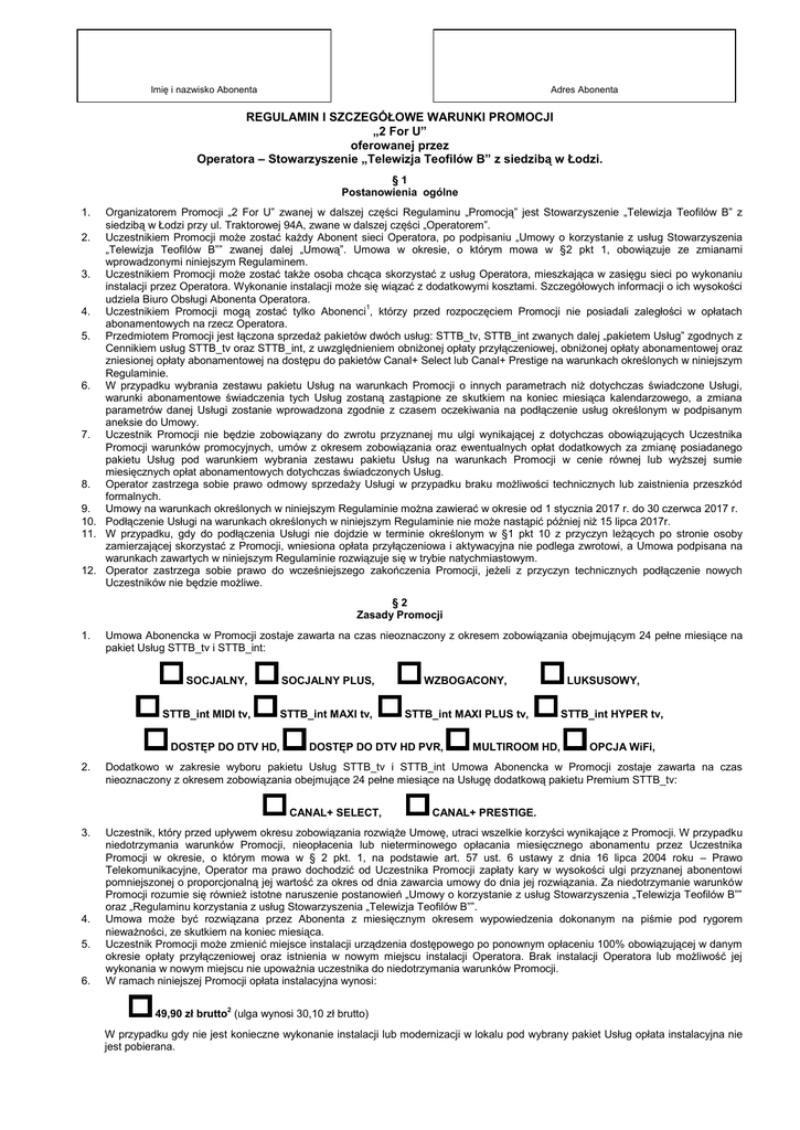Imię i nazwisko Abonenta Adres Abonenta REGULAMIN I SZCZEGÓŁOWE WARUNKI PROMOCJI „2 For U” oferowanej przez Operatora – Stowarzyszenie „Telewizja Teofilów B” z siedzibą w Łodzi. §1 Postanowienia ogólne Organizatorem Promocji „2 For U” zwanej w dalszej części Regulaminu „Promocją” jest Stowarzyszenie „Telewizja Teofilów B” z siedzibą w Łodzi przy ul. Traktorowej 94A, zwane w dalszej części „Operatorem”. 2. Uczestnikiem Promocji może zostać każdy Abonent sieci Operatora, po podpisaniu „Umowy o korzystanie z usług Stowarzyszenia „Telewizja Teofilów B”” zwanej dalej „Umową”. Umowa w okresie, o którym mowa w §2 pkt 1, obowiązuje ze zmianami wprowadzonymi niniejszym Regulaminem. 3. Uczestnikiem Promocji może zostać także osoba chcąca skorzystać z usług Operatora, mieszkająca w zasięgu sieci po wykonaniu instalacji przez Operatora. Wykonanie instalacji może się wiązać z dodatkowymi kosztami. Szczegółowych informacji o ich wysokości udziela Biuro Obsługi Abonenta Operatora. 4. Uczestnikiem Promocji mogą zostać tylko Abonenci1, którzy przed rozpoczęciem Promocji nie posiadali zaległości w opłatach abonamentowych na rzecz Operatora. 5. Przedmiotem Promocji jest łączona sprzedaż pakietów dwóch usług: STTB_tv, STTB_int zwanych dalej „pakietem Usług” zgodnych z Cennikiem usług STTB_tv oraz STTB_int, z uwzględnieniem obniżonej opłaty przyłączeniowej, obniżonej opłaty abonamentowej oraz zniesionej opłaty abonamentowej na dostępu do pakietów Canal+ Select lub Canal+ Prestige na warunkach określonych w niniejszym Regulaminie. 6. W przypadku wybrania zestawu pakietu Usług na warunkach Promocji o innych parametrach niż dotychczas świadczone Usługi, warunki abonamentowe świadczenia tych Usług zostaną zastąpione ze skutkiem na koniec miesiąca kalendarzowego, a zmiana parametrów danej Usługi zostanie wprowadzona zgodnie z czasem oczekiwania na podłączenie usług określonym w podpisanym aneksie do Umowy. 7. Uczestnik Promocji nie będzie zobowiązany do zwrotu przyznanej mu ulgi wynikającej z dotychczas obowiązujących Uczestnika Promocji warunków promocyjnych, umów z okresem zobowiązania oraz ewentualnych opłat dodatkowych za zmianę posiadanego pakietu Usług pod warunkiem wybrania zestawu pakietu Usług na warunkach Promocji w cenie równej lub wyższej sumie miesięcznych opłat abonamentowych dotychczas świadczonych Usług. 8. Operator zastrzega sobie prawo odmowy sprzedaży Usługi w przypadku braku możliwości technicznych lub zaistnienia przeszkód formalnych. 9. Umowy na warunkach określonych w niniejszym Regulaminie można zawierać w okresie od 1 stycznia 2017 r. do 30 czerwca 2017 r. 10. Podłączenie Usługi na warunkach określonych w niniejszym Regulaminie nie może nastąpić później niż 15 lipca 2017r. 11. W przypadku, gdy do podłączenia Usługi nie dojdzie w terminie określonym w §1 pkt 10 z przyczyn leżących po stronie osoby zamierzającej skorzystać z Promocji, wniesiona opłata przyłączeniowa i aktywacyjna nie podlega zwrotowi, a Umowa podpisana na warunkach zawartych w niniejszym Regulaminie rozwiązuje się w trybie natychmiastowym. 12. Operator zastrzega sobie prawo do wcześniejszego zakończenia Promocji, jeżeli z przyczyn technicznych podłączenie nowych Uczestników nie będzie możliwe. 1. §2 Zasady Promocji 1. Umowa Abonencka w Promocji zostaje zawarta na czas nieoznaczony z okresem zobowiązania obejmującym 24 pełne miesiące na pakiet Usług STTB_tv i STTB_int: SOCJALNY, STTB_int MIDI tv, DOSTĘP DO DTV HD, SOCJALNY PLUS, WZBOGACONY, STTB_int MAXI tv, STTB_int MAXI PLUS tv, DOSTĘP DO DTV HD PVR, MULTIROOM HD, LUKSUSOWY, STTB_int HYPER tv, OPCJA WiFi, 2. Dodatkowo w zakresie wyboru pakietu Usług STTB_tv i STTB_int Umowa Abonencka w Promocji zostaje zawarta na czas nieoznaczony z okresem zobowiązania obejmujące 24 pełne miesiące na Usługę dodatkową pakietu Premium STTB_tv: 3. Uczestnik, który przed upływem okresu zobowiązania rozwiąże Umowę, utraci wszelkie korzyści wynikające z Promocji. W przypadku niedotrzymania warunków Promocji, nieopłacenia lub nieterminowego opłacania miesięcznego abonamentu przez Uczestnika Promocji w okresie, o którym mowa w § 2 pkt. 1, na podstawie art. 57 ust. 6 ustawy z dnia 16 lipca 2004 roku – Prawo Telekomunikacyjne, Operator ma prawo dochodzić od Uczestnika Promocji zapłaty kary w wysokości ulgi przyznanej abonentowi pomniejszonej o proporcjonalną jej wartość za okres od dnia zawarcia umowy do dnia jej rozwiązania. Za niedotrzymanie warunków Promocji rozumie się również istotne naruszenie postanowień „Umowy o korzystanie z usług Stowarzyszenia „Telewizja Teofilów B”” oraz „Regulaminu korzystania z usług Stowarzyszenia „Telewizja Teofilów B””. Umowa może być rozwiązana przez Abonenta z miesięcznym okresem wypowiedzenia dokonanym na piśmie pod rygorem nieważności, ze skutkiem na koniec miesiąca. Uczestnik Promocji może zmienić miejsce instalacji urządzenia dostępowego po ponownym opłaceniu 100% obowiązującej w danym okresie opłaty przyłączeniowej oraz istnienia w nowym miejscu instalacji Operatora. Brak instalacji Operatora lub możliwość jej wykonania w nowym miejscu nie upoważnia uczestnika do niedotrzymania warunków Promocji. W ramach niniejszej Promocji opłata instalacyjna wynosi: CANAL+ SELECT, 4. 5. 6. CANAL+ PRESTIGE. 49,90 zł brutto2 (ulga wynosi 30,10 zł brutto) W przypadku gdy nie jest konieczne wykonanie instalacji lub modernizacji w lokalu pod wybrany pakiet Usług opłata instalacyjna nie jest pobierana. 7. 8. W ramach niniejszej Promocji opłata abonamentowa3 za wybrany w umowie pakiet Usługi dodatkowej Premium CANAL+ Select lub CANAL+ Prestige w okresie sześciu pierwszych pełnych miesięcy nie będzie naliczana. W okresie od siódmego do dwudziestego czwartego miesiąca trwania promocji zobowiązania Abone