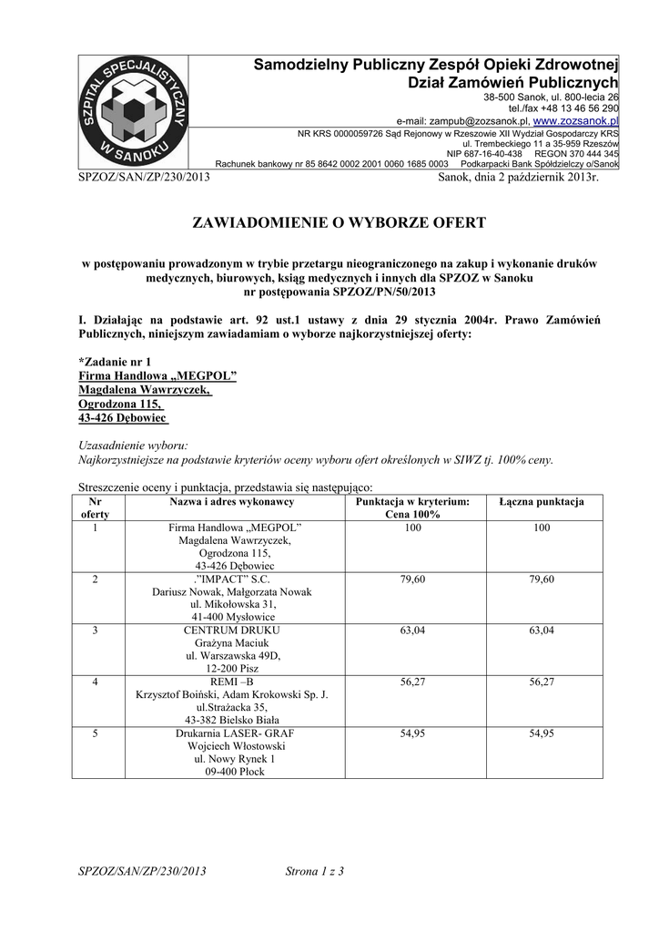 zawiadomienie o wyborze ofert - Samodzielny Publiczny Zespół