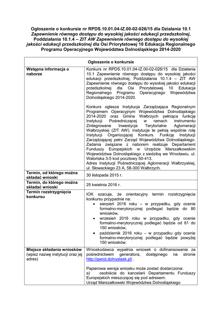 Ogłoszenie o konkursie nr RPDS.10.01.04-IZ.00-02-026/15 dla Działania 10.1 Zapewnienie równego dostępu do wysokiej jakości edukacji przedszkolnej, Poddziałania 10.1.4 – ZIT AW Zapewnienie równego dostępu do wysokiej jakości edukacji przedszkolnej dla Osi Priorytetowej 10 Edukacja Regionalnego Programu Operacyjnego Województwa Dolnośląskiego 2014-2020 Ogłoszenie o konkursie Wstępna informacja o naborze Konkurs nr RPDS.10.01.04-IZ.00-02-026/15 dla Działania 10.1 Zapewnienie równego dostępu do wysokiej jakości edukacji przedszkolnej, Poddziałania 10.1.4 – ZIT AW Zapewnienie równego dostępu do wysokiej jakości edukacji przedszkolnej dla Osi Priorytetowej 10 Edukacja Regionalnego Programu Operacyjnego Województwa Dolnośląskiego 2014-2020. Konkurs ogłasza Instytucja Zarządzająca Regionalnym Programem Operacyjnym Województwa Dolnośląskiego 2014-2020 oraz Gmina Wałbrzych pełniąca funkcję Instytucji Pośredniczącej w ramach instrumentu Zintegrowane Inwestycje Terytorialne Aglomeracji Wałbrzyskiej (ZIT AW). Instytucje te pełnią wspólnie rolę Instytucji Organizującej Konkurs. Funkcję Instytucji Zarządzającej pełni Zarząd Województwa Dolnośląskiego. Zadania związane z naborem realizuje Departament Funduszy Europejskich w Urzędzie Marszałkowskim Województwa Dolnośląskiego z siedzibą we Wrocławiu, ul. Walońska 3-5 kod pocztowy 50-413. Adres Instytucji Pośredniczącej Aglomeracji Wałbrzyskiej, ul. Słowackiego 23 A, 58-300 Wałbrzych. Termin, od którego można składać wnioski Termin, do którego można składać wnioski Termin rozstrzygnięcia konkursu 30 listopada 2015 r. 25 kwietnia 2016 r. IOK szacuje, że orientacyjny termin rozstrzygnięcia konkursu przypadnie na: sierpień 2016 roku – w przypadku, gdy ocenie formalno-merytorycznej podlegać będzie do 80 wniosków, wrzesień 2016 roku w przypadku, gdy ocenie formalno-merytorycznej podlegać będzie od 81 do 150 wniosków, październik 2016 roku – w przypadku gdy ocenie formalno-merytorycznej podlegać będzie powyżej 150 wniosków. Miejsce składania wniosków Wnioskodawca wypełnia wniosek o dofinansowanie za (wpisz nazwę instytucji oraz jej pośrednictwem generatora, dostępnego na stronie adres) http://gwnd.dolnyslask.pl/ . Papierowa wersja wniosku może zostać dostarczona: a) osobiście do kancelarii Departamentu Funduszy Europejskich mieszczącej się pod adresem: Urząd Marszałkowski Województwa Dolnośląskiego Departament Funduszy Europejskich ul. Mazowiecka 17 50-412 Wrocław II piętro, pokój nr 2020 b) kurierem lub pocztą na adres: Urząd Marszałkowski Województwa Dolnośląskiego Wydział Wdrażania EFS ul. Mazowiecka 17 50-412 Wrocław. Sposób składania wniosków o dofinansowanie Kto może składać wnioski? Na co można otrzymać dofinansowanie? Wnioski o dofinansowanie powinny być wypełnione w Systemie Naboru i Oceny Wniosków (SNOW) za pomocą tzw. generatora wniosków o dofinansowanie EFS. Jeden egzemplarz wydrukowanej z systemu SNOW papierowej wersji wniosku jest składany w siedzibie IOK. W ramach konkursu o dofinansowanie realizacji projektu mogą ubiegać się podmioty wyszczególnione w SzOOP RPO WD, tj.: jednostki samorządu terytorialnego, ich związki i stowarzyszenia; jednostki organizacyjne jst; organizacje pozarządowe; organy prowadzące publiczne i niepubliczne przedszkola i inne formy wychowania przedszkolnego; przedsiębiorcy. W ramach niniejszego konkursu ogłoszony jest nabór na następujące typy projektów: 10.1.A. Uruchamianie nowych miejsc w tym dostosowanych do potrzeb dzieci z niepełnosprawnościami w istniejących lub nowych ośrodkach edukacji przedszkolnej m.in. specjalnych i integracyjnych oraz uruchomienie nowych miejsc alternatywnych form opieki nad dziećmi w wieku przedszkolnym. 10.1.B. Dodatkowe zajęcia edukacyjne i specjalistyczne mające na celu rozwój dzieci na wczesnym etapie edukacji, poprzez rozszerzenie oferty ośrodka wychowania przedszkolnego o dodatkowe zajęcia zwiększające szanse edukacyjne dzieci oraz wyrównujące zdiagnozowane deficyty. Wykaz dodatkowych zajęć obejmuje: a) zajęcia specjalistyczne takie jak zajęcia: korekcyjnokompensacyjne, logopedyczne, socjoterapeutyczne, oraz inne zajęcia o charakterze terapeutycznym; b) zajęcia w ramach wczesnego wspomagania rozwoju w rozumieniu ustawy o systemie oświaty; c) zajęcia stymulujące rozwój psychoruchowy np. gimnastyka korekcyjna; d) zajęcia rozwijające kompetencje społeczno-emocjonalne; e) zajęcia rozwijające u dzieci w wieku przedszkolnym kompetencje kluczowe niezbędne na rynku pracy (tj. porozumiewanie się w językach obcych, kompetencje matematyczne i podstawowe kompetencje naukowo – techniczne, kompetencje informatyczne, umiejętność uczenia się, kompetencje społeczne, inicjatywność i przedsiębiorczość) oraz właściwe postawy/ umiejętności (kreatywność, innowacyjność, praca zespołowa oraz pobudzające ciekawość świata). 10.1.C. Doskonalenie umiejętności i kompetencji zawodowych nauczycieli ośrodków wychowania przedszkolnego, niezbędnych do pracy z dziećmi w wieku przedszkolnym, w tym z dziećmi ze specjalnymi potrzebami edukacyjnymi, w szczególności poprzez współpracę nauczycieli z rodzicami, w tym radzenia sobie w sytuacjach trudnych. Szczegółowy opis dofinansowanych typów operacji zawiera Regulamin konkursu. Kryteria wyboru projektów Maksymalny dopuszczalny poziom dofinansowania projektu lub maks. dopuszczalna kwota dofinansowania projektu Ogólna pula środków przeznaczona na dofinansowanie projektów Regulamin konkursu, w tym wzór/ zakres wniosku o dofinansowanie oraz wzór umowy o dofinansowanie Środki odwoławcze przysługujące składającemu wniosek Wybór projektów do dofinansowania odbywa się w oparciu o kryteria wyboru projektów w ramach Regionalnego Programu Operacyjnego Województwa Dolnośląskiego 2014-2020, zatwierdzone uchwałą nr 2/15 z dnia 6 maja 2015 r. Komitetu