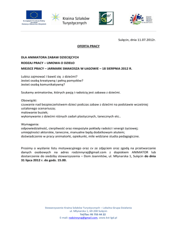 Sulęcin, dnia 11.07.2012r. OFERTA PRACY DLA ANIMATORA ZABAW DZIECIĘCYCH RODZAJ PRACY – UMOWA O DZIEŁO MIEJSCE PRACY – JARMARK SMAKOSZA W ŁAGOWIE – 18 SIERPNIA 2012 R. Lubisz zajmować i bawić się z dziećmi? Jesteś osobą kreatywną i pełną pomysłów? Jesteś osobą komunikatywną? Szukamy animatorów, których pasją i radością jest zabawa z dziećmi. Obowiązki: czuwanie nad bezpieczeństwem dzieci podczas zabaw z dziećmi na podstawie wcześniej ustalonego scenariusza; malowanie buziek; wykonywanie z dziećmi różnych zadań plastycznych, tanecznych etc.. Wymagania: odpowiedzialność, cierpliwość oraz niespożyte pokłady radości i energii życiowej; umiejętności aktorskie, taneczne, manualne będą dodatkowym atutem; doświadczenie w pracy animatorki, opiekunki, mile widziane studia pedagogiczne. Prosimy o wysłanie listu motywacyjnego oraz cv ze zdjęciem oraz zgodą na przetwarzanie danych osobowych na adres [email protected] z dopiskiem ANIMATOR lub dostarczenie do siedziby stowarzyszenia – Dom Joannitów, ul. Młynarska 1, Sulęcin do dnia 31 lipca 2012 r. do godz. 15.00. Stowarzyszenie Kraina Szlaków Turystycznych – Lokalna Grupa Działania ul. Młynarska 1, 69-200 Sulęcin Tel/fax: 95 755 44 22 E-mail: [email protected], www.kst-lgd.pl