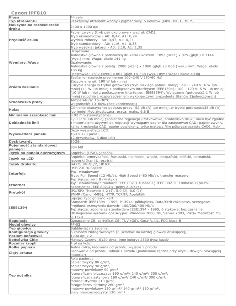 Canon iPF810 Klasa Typ atramentu Maksymalna rozdzielczość druku Prędkość druku Wymiary, Waga Źródło zasilania Środowisko pracy Hałas Minimalna szerokość linii Dokładność linii Wyświetlacz panelu Dysk twardy Pojemność standardowej pamięci: Język na panelu operacyjnym Język na LCD Język drukarki Interfejs Ethernet Protokół IEEE1394 Regulacje Model głowicy Typ głowicy Konfiguracja głowicy Poziom końcówki Końcówka Chip Rozmiar kropli Rolka papieru Cięty arkusz Typ nośnika 44 cale Reaktywny atrament wodny i pigmentowy, 5 kolorów (MBK, BK, C, M, Y) 2400 x 1200 dpi Papier zwykły (tryb pełnokolorowy - wydruk CAD): Tryb ekonomiczny - A0: 0,47, A1: 0,24 Wydruk roboczy - A0: 0,47, A1: 0,24 Tryb standardowy - A0: 1,16, A1: 0,38 Tryb wysokiej jakości - A0: 3,10, A1: 1,35 Urządzenie: Jednostka główna z podstawką drukarki i koszem: 1893 (szer.) x 975 (głęb.) x 1144 (wys.) mm; Waga: około 141 kg Opakowanie: Jednostka główna z paletą: 2080 (szer.) x 1060 (głęb.) x 865 (wys.) mm; Waga: około 165 kg Podstawka: 1782 (szer.) x 863 (głęb.) x 368 (wys.) mm; Waga: około 40 kg Zasilanie: napięcie przemienne 100–240 V (50/60 Hz) Zużycie energii: 190 W lub mniej Zużycie energii w trybie gotowości (tryb niskiego poboru mocy): 220 - 240 V: 6 W lub mniej (11 W lub mniej z podłączonym interfejsem IEEE1394); 100 - 120 V: 5 W lub mniej (10 W lub mniej z podłączonym interfejsem IEEE1394); Wyłączone (gotowość):1 W lub mniej (zgodnie z rozporządzeniem wykonawczym prezydenta Stanów Zjednoczonych) Temperatura: 15–30°C Wilgotność: 10–80% (bez kondensacji) Ciśnienie akustyczne: podczas pracy: 52 dB (A) lub mniej, w trybie gotowości:35 dB (A) lub mniej Moc akustyczna: praca: maks. 6,8 B 0,02 mm (teoretycznie) +/- 0,1% lub mniej (Konieczna regulacja użytkownika, środowisko druku musi być zgodne z materiałami użytymi do regulacji Wymagany papier dla zastosowań CAD: papier zwykły, kalka kreślarska CAD, papier powlekany, tylko matowy film półprzezroczysty CAD). /td> Duży wyświetlacz LCD: 160 x 128 pikseli, 12 przycisków, 5 diod LED 80GB 384 MB Angielski (USA), japoński Angielski amerykański, francuski, niemiecki, włoski, hiszpański, chiński, koreański, japoński (kanji), rosyjski GARO, HP-GL/2, HP RTL USB 2.0 Hi-Speed: Typ: wbudowany Tryb: Full Speed (12 Mb/s), High Speed (480 Mb/s), transfer masowy Typ złącza: serii B (4-styki) Typ: wbudowany Standard: IEEE 802.3 10base-T; IEEE 802.3u 100base-TX/autonegocjacja; IEEE 802.3 x (pełny dupleks) IPX/SPX (Netware 4.2 (J), 5.0 (J), 6.0 (J)) SNMP (Canon-MIB), HTTP, TCP/IP, AppleTalk (opcja) Typ: gniazdo kart Standard: IEEE1394 - 1995, P1394a, półdupleks, Data/Strb różnicowy, szeregowy Prędkość przesyłania danych: 100/200/400 Mb/s Typ złącza: zgodne ze standardem IEEE1394 - 1995, 6 stykowe, bez zasilania Obsługiwane systemy operacyjne: Windows 2000, XP, Server 2003, Vista/ Macintosh OS 9, OS X Oznaczenie CE, certyfikat CB, TUV (GS), Gost-R, UL, FCC klasa B PF-03 Bubble-jet na żądanie 6 kolorów zintegrowanych (6 układów na każdej głowicy drukującej) 1200 dpi x 2 Matowy Czarny: 5120 dysz, inne kolory: 2560 dysz każdy 4 pl na kolor Jedna rolka, ładowana od przodu, wyjście z przodu Ładowanie od przodu, odbiór z przodu (podawanie ręczne przy użyciu dźwigni blokującej materiał) Rola papieru: papier zwykły 80 g/m², papier zwykły 90 g/m², matowy powlekany 90 g/m², fotograficzny błyszczący 190 g/m²/ 240 g/m²/ 300 g/m², fotograficzny satynowy 190 g/m²/ 240 g/m²/ 300 g/m², fotorealistyczny 210 g/m², fotograficzny perłowy 260 g/m², matowy powlekany 120 g/m²/ 140 g/m²/ 180 g/m², biały nieprzezroczysty 120 g/m², Rozmiar nośnika Grubość nośnika Maksymalna średnica zewnętrzna rolki papieru Rozmiar rdzenia nośnika Szerokość nośnika samoprzylepny do wydruków o wysokiej rozdzielczości 140 g/m², do wydruków o wysokiej rozdzielczości 180 g/m², błyszczący do wydruków próbnych 195 g/m², półbłyszczący do wydruków próbnych 195 g/m², półbłyszczący do wydruków próbnych 195 g/m²/ 255 g/m² Papier z roli (szerokość): ISO: A3, A2, A1, A0 JIS: B2, B1, B0 ARCH: 24 cale, 30 cali, 36 cali Inne: 10 cali, 14 cali, 16 cali, 17 cali, 42 cale, 44 cale Cięte arkusze: ISO: A4, A3, A3+, A2, A2+, A1, A0, B4, B3, B2, B1, B0 DIN: C4, C3, C2, C1, C0 JIS: B4, B3, B2, B1, B0 ANSI: 8,5 x 11 cali, 8,5 x 14 cali, 11 x 17 cali, 13 x 19 cali, 17 x 22 cale, 22 x 34 cale, 28 x 40 cali, 34 x 44 cale ARCH: 9 x 12 cali, 12 x 18 cali, 18 x 24 cale, 24 x 36 cali, 26 x 38 cali, 27 x 39 cali, 30 x 42 cale, 36 x 48 cali Zdjęcie: 20 x 24 cale, 18 x 22 cale, 14 x 17 cali, 10 x 12 cali, 10 x 15 cali, 8 x 10 cali, 12 x 16 cali, 16 x 20 cali (amerykański format fotograficzny) Plakat: 20 x 30 cali, 30 x 40 cali, 42 x 60 cali, 44 x 62 cale, 300 x 900 mm Rola papieru i arkusze: 0,07–0,8 mm 150,0mm Średnica wewnętrzna roli: 2 cale/3 cale (opcja) Papier z roli: 254 - 1118 mm, cięte arkusze: 203 - 1118 mm, Minimalna drukowalna długość 203mm papieru Maksymalna drukowalna Rola papieru: 18 m (w zależności od systemu operacyjnego i aplikacji) długość papieru Arkusze: 1,6 m Zalecany obszar: Rola papieru: góra: 20 mm, dół: 5 mm, bok: 5 mm Cięte arkusze: góra: 20 mm, dół: 23 mm, po bokach: 5 mm Maksymalna drukowalna Obszar druku: długość papieru Rola papieru: góra: 3 mm, dół: 3 mm, bok: 3 mm Rola papieru (druk bezmarginesowy): góra: 0 mm, dół: 0 mm; bok: 0 mm Cięte arkusze: góra: 3 mm, dół: 23 mm, bok: 3 mm Szerokość nośnika dla druku 515 mm (JIS B2), 1030 mm (JIS B0), 594 mm (ISO A1), 841 mm (ISO A0), 10 cali, 14 bez obramowań cali, 17 cali, 24 cale, 36 cali, 42 cale