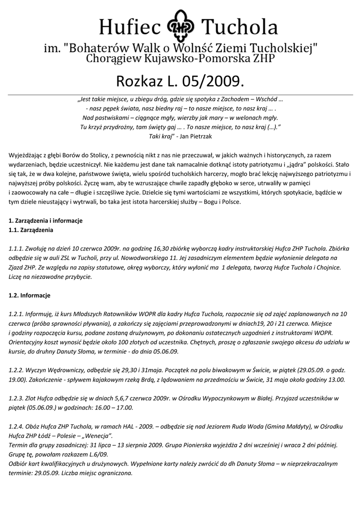 Rozkaz L. 05/2009. „Jest takie miejsce, u zbiegu dróg, gdzie się spotyka z Zachodem – Wschód … - nasz pępek świata, nasz biedny raj – to nasze miejsce, to nasz kraj … . Nad pastwiskami – ciągnące mgły, wierzby jak mary – w welonach mgły. Tu krzyż przydrożny, tam święty gaj … . To nasze miejsce, to nasz kraj (…).” Taki kraj” - Jan Pietrzak Wyjeżdżając z głębi Borów do Stolicy, z pewnością nikt z nas nie przeczuwał, w jakich ważnych i historycznych, za razem wydarzeniach, będzie uczestniczył. Nie każdemu jest dane tak namacalnie dotknąć istoty patriotyzmu i „jądra” polskości. Stało się tak, że w dwa kolejne, państwowe święta, wielu spośród tucholskich harcerzy, mogło brać lekcję najwyższego patriotyzmu i najwyższej próby polskości. Życzę wam, aby te wzruszające chwile zapadły głęboko w serce, utrwaliły w pamięci i zaowocowały na całe – długie i szczęśliwe życie. Dzielcie się tymi wartościami ze wszystkimi, których spotykacie, bądźcie w tym dziele nieustający i wytrwali, bo taka jest istota harcerskiej służby – Bogu i Polsce. 1. Zarządzenia i informacje 1.1. Zarządzenia 1.1.1. Zwołuję na dzień 10 czerwca 2009r. na godzinę 16,30 zbiórkę wyborczą kadry instruktorskiej Hufca ZHP Tuchola. Zbiórka odbędzie się w auli ZSL w Tucholi, przy ul. Nowodworskiego 11. Jej zasadniczym elementem będzie wyłonienie delegata na Zjazd ZHP. Ze względu na zapisy statutowe, okręg wyborczy, który wyłonić ma 1 delegata, tworzą Hufce Tuchola i Chojnice. Liczę na niezawodne przybycie. 1.2. Informacje 1.2.1. Informuję, iż kurs Młodszych Ratowników WOPR dla kadry Hufca Tuchola, rozpocznie się od zajęć zaplanowanych na 10 czerwca (próba sprawności pływania), a zakończy się zajęciami przeprowadzonymi w dniach19, 20 i 21 czerwca. Miejsce i godziny rozpoczęcia kursu, podane zostaną drużynowym, po dokonaniu ostatecznych uzgodnień z instruktorami WOPR. Orientacyjny koszt wynosić będzie około 100 złotych od uczestnika. Chętnych, proszę o zgłaszanie swojego akcesu do udziału w kursie, do druhny Danuty Słoma, w terminie - do dnia 05.06.09. 1.2.2. Wyczyn Wędrowniczy, odbędzie się 29,30 i 31maja. Początek na polu biwakowym w Świcie, w piątek (29.05.09. o godz. 19.00). Zakończenie - spływem kajakowym rzeką Brdą, z lądowaniem na przedmościu w Świcie, 31 maja około godziny 13.00. 1.2.3. Zlot Hufca odbędzie się w dniach 5,6,7 czerwca 2009r. w Ośrodku Wypoczynkowym w Białej. Przyjazd uczestników w piątek (05.06.09.) w godzinach: 16.00 – 17.00. 1.2.4. Obóz Hufca ZHP Tuchola, w ramach HAL - 2009. – odbędzie się nad Jeziorem Ruda Woda (Gmina Małdyty), w Ośrodku Hufca ZHP Łódź – Polesie – „Wenecja”. Termin dla grupy zasadniczej: 31 lipca – 13 sierpnia 2009. Grupa Pionierska wyjeżdża 2 dni wcześniej i wraca 2 dni później. Grupę tę, powołam rozkazem L.6/09. Odbiór kart kwalifikacyjnych u drużynowych. Wypełnione karty należy zwrócić do dh Danuty Słoma – w nieprzekraczalnym terminie: 29.05.09. Liczba miejsc ograniczona. 1.2.5. Podaję do wiadomości, iż kolejne posiedzenie Hufcowej Komisji Stopni Instruktorskich, odbędzie się 15 czerwca. Probantów proszę o dopilnowanie skompletowania dokumentacji, terminowe złożenie wniosków o zamknięcie prób i przygotowanie się na spotkanie z Komisją. Życzymy powodzenia! 2. Hufiec 2.1 Mianowania w komendzie hufca 2.1.1. W związku z ukończeniem szkolenia w zakresie promocji i PR, organizowanego przez Centralną Szkołę Instruktorską w Warszawie, powołuję druhnę pwd. Teresę Słoma do pełnienia funkcji Pełnomocnika Komendanta Hufca ds. wizerunku i promocji, z dniem 01 czerwca 2009r. Życzę niesłabnącego zapału oraz wielu pomysłów w kreowaniu wartościowego oblicza harcerstwa i Hufca Tuchola. 2.1.2. Na wniosek członków Komisji Stopni Instruktorskich, powołuję do jej składu, z dniem 01 czerwca 2009r. druhnę phm. Henrykę Markiewicz. Gratuluję jednocześnie podjęcia kolejnej, odpowiedzialnej funkcji w naszym Hufcu. 2.2 Powołanie i rozwiązanie sztabów, komisji, komend kursów 2.2.1. Powołuję z dniem 10.05.09.Komendę Wyczynu Wędrowniczego w składzie: Komendant – phm. Danuta Słoma Oboźny – Kwatermistrz – pwd Kamil Słoma Obsługę kadrowo – organizacyjną stanowią harcerze i wędrownicy 1DW „Gryf” 2.2.2. Powołuję z dniem 10.05.09.Komendę Zlotu Hufca: Komendant – phm. Danuta Słoma Zastępca – phm. Jacek Jeziorski Kwatermistrz – pwd. Kamil Słoma Oboźny – Jakub Sobczak/ Andrzej Zakrzewski 2.2.3. Powołuję Komendę Obozu „Wenecja – 2009”: Komendant – phm. Jarosław Słoma Zastępca Komendanta – phm. Danuta Słoma Drużynowy – phm. Jacek Jeziorski Drużynowy – pwd. Wioletta Górska Drużynowy – pwd. Ewelina Drzycimska Drużynowy – pwd. Teresa Słoma 3. Drużyny 3.1. Zmiany organizacyjne 3.1.1. Na wniosek drużynowego zamykam z wynikiem pozytywnym okres próbny 7 Próbnej Drużynie Harcerskiej, działającej przy Szkole Podstawowej im. Ziemi Krajeńskiej w Sypniewie i przyjmuję ją w poczet drużyn Hufca Tuchola. 3.1.2. Na wniosek drużynowej, zamykam z wynikiem pozytywnym okres próbny 3 Próbnej Gromadzie Zuchowej, działającej przy Szkole Podstawowej im. ks. E. Staniszewskiego w Śliwicach i przyjmuję ją w poczet drużyn Hufca Tuchola. 3.1.3. Na wniosek drużynowej, zamykam z wynikiem pozytywnym okres próbny 4 Próbnej Gromadzie Zuchowej, działającej przy Szkole Podstawowej im. ks. E. Staniszewskiego w Śliwicach i przyjmuję ją w poczet drużyn Hufca Tuchola. 3.1.4. Na wniosek drużynowej, zamykam z wynikiem pozytywnym okres próbny1 Próbnej Drużynie Harcerskiej, działającej przy Szkole Podstawowej w Żalnie i przyjmuję ją w poczet drużyn Hufca Tuchola. 3.2. Zwolnienia i mianowania drużynowych 3.2.1. Mianuję druha Marka Kiestrzyna, drużynowym Drużyny Harcerskiej w Sypniewie. 3.2.2. Mianuję druhnę Hannę Lips