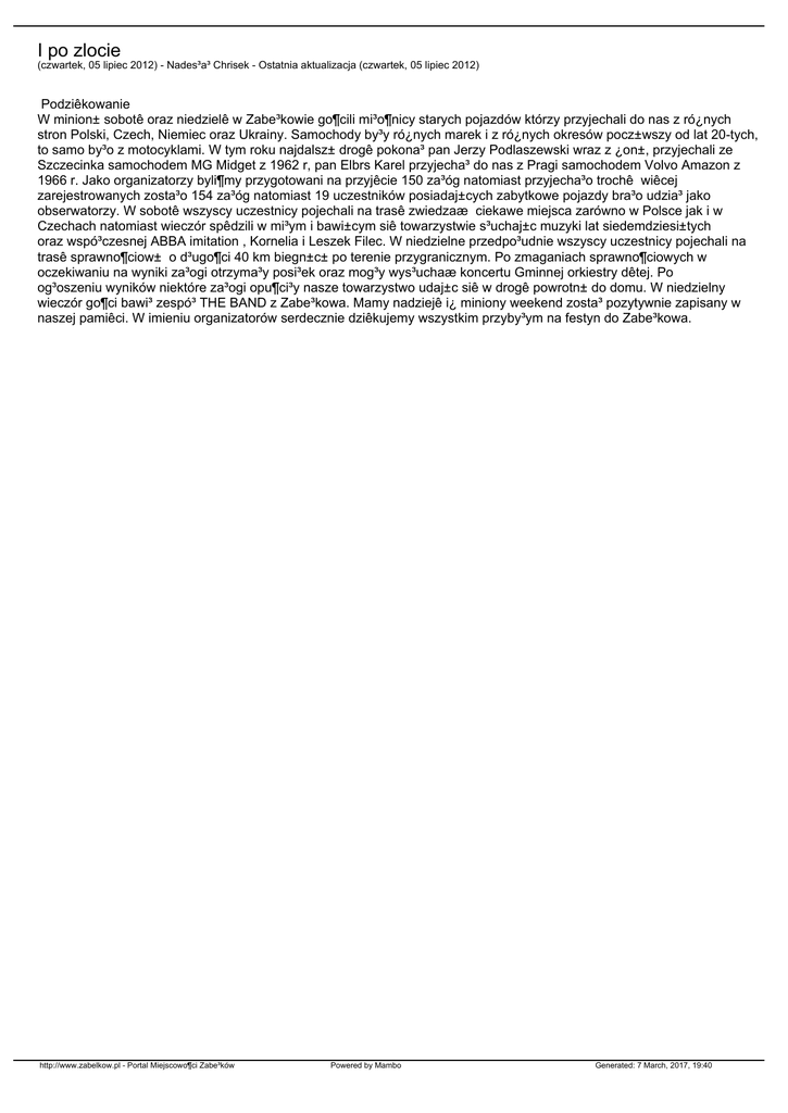 I po zlocie (czwartek, 05 lipiec 2012) - Nades³a³ Chrisek - Ostatnia aktualizacja (czwartek, 05 lipiec 2012) Podziêkowanie W minion± sobotê oraz niedzielê w Zabe³kowie go¶cili mi³o¶nicy starych pojazdów którzy przyjechali do nas z ró¿nych stron Polski, Czech, Niemiec oraz Ukrainy. Samochody by³y ró¿nych marek i z ró¿nych okresów pocz±wszy od lat 20-tych, to samo by³o z motocyklami. W tym roku najdalsz± drogê pokona³ pan Jerzy Podlaszewski wraz z ¿on±, przyjechali ze Szczecinka samochodem MG Midget z 1962 r, pan Elbrs Karel przyjecha³ do nas z Pragi samochodem Volvo Amazon z 1966 r. Jako organizatorzy byli¶my przygotowani na przyjêcie 150 za³óg natomiast przyjecha³o trochê wiêcej zarejestrowanych zosta³o 154 za³óg natomiast 19 uczestników posiadaj±cych zabytkowe pojazdy bra³o udzia³ jako obserwatorzy. W sobotê wszyscy uczestnicy pojechali na trasê zwiedzaæ ciekawe miejsca zarówno w Polsce jak i w Czechach natomiast wieczór spêdzili w mi³ym i bawi±cym siê towarzystwie s³uchaj±c muzyki lat siedemdziesi±tych oraz wspó³czesnej ABBA imitation , Kornelia i Leszek Filec. W niedzielne przedpo³udnie wszyscy uczestnicy pojechali na trasê sprawno¶ciow± o d³ugo¶ci 40 km biegn±c± po terenie przygranicznym. Po zmaganiach sprawno¶ciowych w oczekiwaniu na wyniki za³ogi otrzyma³y posi³ek oraz mog³y wys³uchaæ koncertu Gminnej orkiestry dêtej. Po og³oszeniu wyników niektóre za³ogi opu¶ci³y nasze towarzystwo udaj±c siê w drogê powrotn± do domu. W niedzielny wieczór go¶ci bawi³ zespó³ THE BAND z Zabe³kowa. Mamy nadziejê i¿ miniony weekend zosta³ pozytywnie zapisany w naszej pamiêci. W imieniu organizatorów serdecznie dziêkujemy wszystkim przyby³ym na festyn do Zabe³kowa. http://www.zabelkow.pl - Portal Miejscowo¶ci Zabe³ków Powered by Mambo Generated: 7 March, 2017, 19:40
