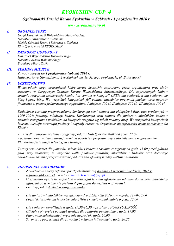KYOKUSHIN CUP 4 Ogólnopolski Turniej Karate Kyokushin w Ząbkach - 1 października 2016 r. www.kyokushincup.pl I. ORGANIZATORZY Urząd Marszałkowski Województwa Mazowieckiego Starostwo Powiatowe w Wołominie Miejski Ośrodek Sportu i Rekreacji w Ząbkach Klub Sportów Walki KYOKUSHIN II. PATRONAT HONOROWY Marszałek Województwa Mazowieckiego Starosta Powiatu Wołomińskiego Burmistrz Miasta Ząbki III. TERMIN i MIEJSCE Zawody odbędą się 1 października (sobota) 2016 r. Hala sportowa Gimnazjum nr 2 w Ząbkach im. ks. Jerzego Popiełuszki, ul. Batorego 37 IV. UCZESTNICTWO W zawodach mogą uczestniczyć kluby karate kyokushin zaproszone przez organizatora oraz kluby zrzeszone w Okręgowym Związku Karate Województwa Mazowieckiego. Dla zaproszonych klubów zostanie rozegrana konkurencja kumite full contact w kategorii OPEN dla seniorek, a dla seniorów do 80kg i pow. 80kg. We wszystkich kategoriach full contact zawodnicy otrzymują puchary oraz nagrody finansowe w postaci jednorazowego stypendium: I miejsce: 500 zł, II miejsce: 250 zł, III miejsce: 100 zł. Dodatkowo zostanie przeprowadzona konkurencja semi contact dla chłopców i dziewcząt urodzonych w 1999-2004: juniorzy, młodzicy, kadeci. Konkurencja semi contact dla juniorów, młodzików, kadetów zostanie rozegrana z podziałem na kategorie wagowe wg tabeli podanej niżej. We wszystkich kategoriach laureaci turnieju otrzymają puchary i nagrody rzeczowe. Organizator nie wprowadza limitu zawodników dla Klubów. Turniej dla seniorów zostanie rozegrany podczas Gali Sportów Walki od godz. 17.00 z pokazami oraz walkami turniejowymi na podeście z profesjonalnym oświetleniem i nagłośnieniem. Planowana jest relacja telewizyjna z turnieju. Turniej semi contact dla juniorów, młodzików i kadetów zostanie rozegrany od godz. 13.00 przed główna galą, przy założeniu, że wszystkie walki finałowe juniorów, młodzików i kadetów oraz dekoracje zawodników zostaną przeprowadzone podczas gali głównej między walkami seniorów. V. ZGŁOSZENIA ZAWODNIKÓW Zawodników należy zgłaszać pocztą elektroniczną do dnia 25 września (niedziela) 2016 r. w formie pliku Excel na adres [email protected] Organizator będzie bezwzględnie przestrzegał terminu zgłoszeń zawodników do turnieju. Zawodnicy zgłoszeni po terminie nie zostaną dopuszczeni do udziału w zawodach. Prosimy podać dokładna wagę zawodnika - Dla juniorów i młodzików weryfikacja – 1 października 2016 r. – w godz. 12.00-13.00 Początek turnieju dla juniorów, młodzików i kadetów punktualnie o godz. 13.00 - Dla seniorów weryfikacja w godz. 15.30-16.30 - prosimy o PUNKTUALNOŚĆ Oficjalne otwarcie i początek turnieju dla seniorów punktualnie o godz. 17.00 Planowane zakończenie i wręczenie nagród ok. godz. 20.00 Sayonara i poczęstunek dla zawodników kumite full contact o godz. 20.30 1 VI. KONKURENCJE i KATEGORIE WAGOWE Dla Mężczyzn - kumite full contact do 80kg i pow. 80kg Dla Kobiet - kumite full contact OPEN seniorzy: 1998 i starsi (ukończone 18 lat w dniu turnieju) Do udziału wymagany: 1. dokument ze zdjęciem 2. oświadczenie i pisemna zgoda uczestnika na udział w kumite full contact 3. aktualne badania lekarza sportowego 4. komplet ochraniaczy osobistych: mężczyźni: na kroczę, kobiety: na klatkę piersiową Dla dziewcząt i chłopców - kumite semi contact (w każdej kategorii wiekowej) juniorzy: 1999-2000 (oraz rocznik 1998, nie ukończone 18 lat w dniu turnieju) młodzicy: 2001-2002 kadeci: 2003-2004 Do udziału wymagany: 1. dokument ze zdjęciem 2. pisemna zgoda rodziców/opiekunów na udział w turnieju i kumite semi contact 3. aktualne badania lekarza sportowego 4. komplet ochraniaczy osobistych: piąstkówki, miękkie ochraniacze goleń stopa, chłopcy: ochraniacz na kroczę, dziewczęta: ochraniacz na klatkę piersiową W przypadku małej liczby zgłoszonych zawodników organizator zastrzega sobie prawo rezygnacji z rozegrania danej konkurencji lub połączenia kategorii wagowych. Minimalna liczba uczestników w jednej kategorii to 8 zawodników. KATEGORIE WAGOWE KUMITE SEMI CONTACT wiek / waga w kg / płeć Dziewczęta Chłopcy Juniorzy -55,+55 -55,-65,-75,+75 -50,+50 -50,-60,+60 -35, +35 -35, -45, +45 rok ur. 1999 – 2000 Młodzicy rok ur. 2001 - 2002 Kadeci rok ur. 2003 - 2004 VII. ZASADY ROZGRYWANIA KONKURENCJI FULL CONTACT Rywalizacja będzie prowadzona zgodnie z przepisami full contact IKO dla seniorów. Obowiązkowe ochraniacze osobiste dla każdego z zawodników. Nie wymagane ochraniacze goleń stopa. Zwycięzca zostanie wyłoniony podczas walk prowadzonych w systemie pucharowym. Zostaną przeprowadzone walki o III miejsce. W strefie medalowej w przypadku odniesienia kontuzji przez jednego z zawodników i braku możliwości uczestnictwa w dalszej rundzie turnieju do kolejnej walki o nagrody przystępuje zawodnik, który przegrał z zawodnikiem nie zdolnym do dalszych walk. Czas trwania walki dla seniorów na każdym etapie turnieju: Seniorzy - 3min.+2min.dogrywki, różnica wagi 5kg, tameshi -wari, 2min.dogrywki, decyzja sędziów SEMI CONTACT Rywalizacja w każdej kategorii wiekowej będzie prowadzona zgodnie z przepisami IKO. Juniorzy i młodzicy bez ochraniacza tułowia. Kadeci walczą w ochraniaczu tułowia (hogo). Wszystkie ochraniacze osobiste są obowiązkowe. Organizator zapewnia kaski. Nie będzie dyskwalifikacji za kopnięcia na strefę jodan. Czas trwania walki na każdym etapie turnieju: Juniorzy, Młodzicy, Kadeci - 2min.+2min.dogrywki, różnica wagi 5kg, 2min.dogrywki, decyzja sędziów 2 VIII. OPŁATA STARTOWA Seniorzy - uczestnicy turnieju full contact nie wnoszą opłaty startowej. Każdy z zawodników i sędziów zostanie zaproszony na Sayonarę i poczęstunek po zakończeniu turnieju. Dla juniorów, młodzików i kadetów organizator ustala opłatę startową w wysokości 30 zł. Dla osób chętnych do przyjazdu przed turniejem do Ząbek w piątek na dzień przed turniejem proponujemy bezpła