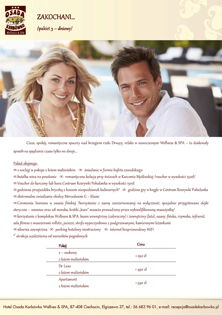 ZAKOCHANI… /pakiet 3 – dniowy/ Cisza, spokój, romantyczne spacery nad brzegiem rzeki Drwęcy, relaks w nowoczesnym Wellness & SPA – to doskonały sposób na spędzenie czasu tylko we dwoje... Pakiet obejmuje: • 2 noclegi w pokoju z łożem małżeńskim • śniadanie w formie bufetu szwedzkiego • butelka wina na powitanie • romantyczna kolacja przy świecach w Karczmie Myśliwskiej /voucher w wysokości 150zł/ • Voucher do karczmy lub baru Centrum Rozrywki Pohulanka w wysokości 150zł • godzinna przejażdżka bryczką z koszem niespodzianek kulinarnych* • godzina gry w kręgle w Centrum Rozrywki Pohulanka • ekstremalne zwiedzanie okolicy Mercedesem G – klasse • Ceremonia Sosnowa w saunie fińskiej /korzystanie z sauny zarezerwowanej na wyłączność, specjalnie przygotowane olejki eteryczne – sosnowe oraz sól morska, krótki „kurs” masażu prowadzony przez wykwalifikowaną masażystkę/ • korzystanie z kompleksu Wellness & SPA: basen wewnętrzny (całoroczny) i zewnętrzny (lato), sauny: fińska, rzymska, infrared, sala fitness z masażerami rolletic, jacuzzi, strefa wypoczynkowa z podgrzewanymi, kamiennymi leżankami • siłownia zewnętrzna • parking hotelowy niestrzeżony • internet bezprzewodowy WiFi *) atrakcja uzależniona od warunków pogodowych Pokój 2 – osobowy z łożem małżeńskim De Luxe z łożem małżeńskim Apartament z łożem małżeńskim Cena 1 290 zł 1 490 zł 1 590 zł