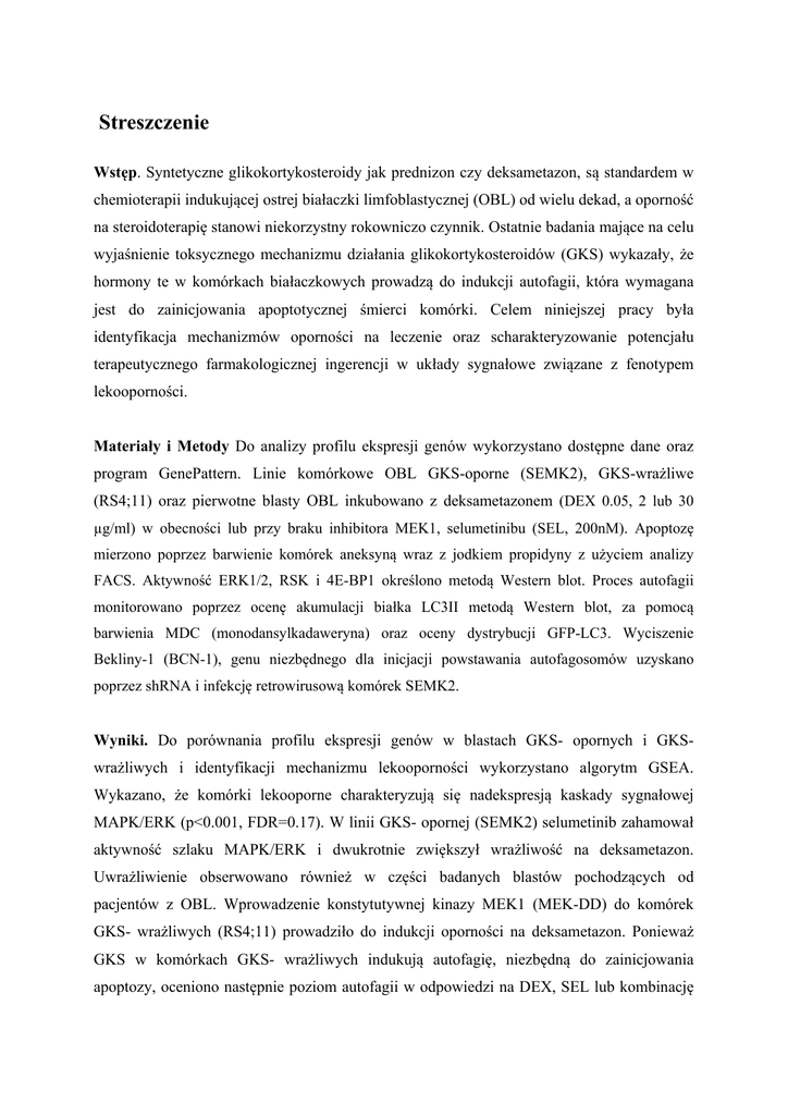 Streszczenie Wstęp. Syntetyczne glikokortykosteroidy jak prednizon czy deksametazon, są standardem w chemioterapii indukującej ostrej białaczki limfoblastycznej (OBL) od wielu dekad, a oporność na steroidoterapię stanowi niekorzystny rokowniczo czynnik. Ostatnie badania mające na celu wyjaśnienie toksycznego mechanizmu działania glikokortykosteroidów (GKS) wykazały, że hormony te w komórkach białaczkowych prowadzą do indukcji autofagii, która wymagana jest do zainicjowania apoptotycznej śmierci komórki. Celem niniejszej pracy była identyfikacja mechanizmów oporności na leczenie oraz scharakteryzowanie potencjału terapeutycznego farmakologicznej ingerencji w układy sygnałowe związane z fenotypem lekooporności. Materiały i Metody Do analizy profilu ekspresji genów wykorzystano dostępne dane oraz program GenePattern. Linie komórkowe OBL GKS-oporne (SEMK2), GKS-wrażliwe (RS4;11) oraz pierwotne blasty OBL inkubowano z deksametazonem (DEX 0.05, 2 lub 30 µg/ml) w obecności lub przy braku inhibitora MEK1, selumetinibu (SEL, 200nM). Apoptozę mierzono poprzez barwienie komórek aneksyną wraz z jodkiem propidyny z użyciem analizy FACS. Aktywność ERK1/2, RSK i 4E-BP1 określono metodą Western blot. Proces autofagii monitorowano poprzez ocenę akumulacji białka LC3II metodą Western blot, za pomocą barwienia MDC (monodansylkadaweryna) oraz oceny dystrybucji GFP-LC3. Wyciszenie Bekliny-1 (BCN-1), genu niezbędnego dla inicjacji powstawania autofagosomów uzyskano poprzez shRNA i infekcję retrowirusową komórek SEMK2. Wyniki. Do porównania profilu ekspresji genów w blastach GKS- opornych i GKSwrażliwych i identyfikacji mechanizmu lekooporności wykorzystano algorytm GSEA. Wykazano, że komórki lekooporne charakteryzują się nadekspresją kaskady sygnałowej MAPK/ERK (p<0.001, FDR=0.17). W linii GKS- opornej (SEMK2) selumetinib zahamował aktywność szlaku MAPK/ERK i dwukrotnie zwiększył wrażliwość na deksametazon. Uwrażliwienie obserwowano również w części badanych blastów pochodzących od pacjentów z OBL. Wprowadzenie konstytutywnej kinazy MEK1 (MEK-DD) do komórek GKS- wrażliwych (RS4;11) prowadziło do indukcji oporności na deksametazon. Ponieważ GKS w komórkach GKS- wrażliwych indukują autofagię, niezbędną do zainicjowania apoptozy, oceniono następnie poziom autofagii w odpowiedzi na DEX, SEL lub kombinację leków w komórkach GKS- wrażliwych i -opornych. W tym celu wykorzystano metodę western blot oceniającą poziom białka LC3II, a także barwienie MDC oraz ocenę dystrybucji GFP-LC3. Zgodnie z obserwowanym uwrażliwieniem, znaczącą indukcję autofagii w komórkach GKS- opornych obserwowano dopiero po połączeniu deksametazonu z inhibitorem szlaku MAPK/ERK. Po zastosowaniu kombinacji leków w komórkach tych obserwowano również spadek fosforylacji białka 4E-BP1, będącego substratem kinazy mTORC1, kontrolującej autofagię. Molekularny mechanizm odpowiadający za spadek aktywności mTORC1 wskutek działania selumetinibu obejmuje zahamowanie substratu ERK1/2, kinazy p90RSK, która reguluje działanie kompleksu TSC2/1. Następnie w komórkach GKS- opornych wyciszono gen BCN-1 i oceniono wrażliwość na połączenie DEX/SEL. Komórki z defektem autofagii charakteryzowała niższa odpowiedź apoptotyczna na zastosowanie kombinacji leków. Wnioski Inhibitor kinazy MEK1, selumetinib, uwrażliwia komórki OBL oporne na GKS. Uwrażliwienie to wynika z zahamowania aktywności kinazy mTORC1 i indukcji autofagii, niezbędnej do apoptotycznej śmierci komórki.