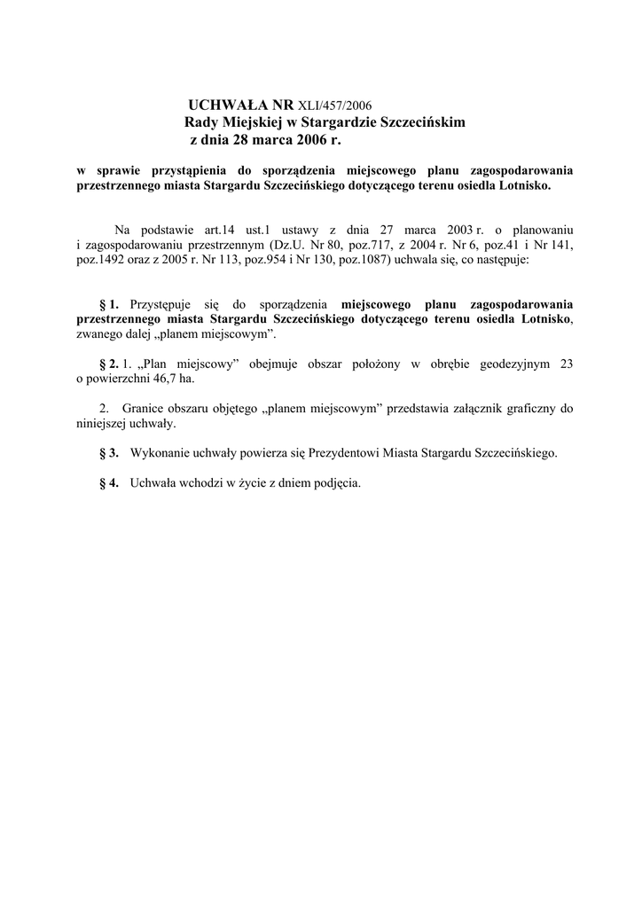 UCHWAŁA NR XLI/457/2006XIII/139/2003 Rady Miejskiej w Stargardzie Szczecińskim z dnia 28 marca 2006 r.7 listopada 2003 r. w sprawie przystąpienia do sporządzenia miejscowego planu zagospodarowania przestrzennego miasta Stargardu Szczecińskiego dotyczącego terenu osiedla Lotnisko. Na podstawie art.14 ust.1 ustawy z dnia 27 marca 2003 r. o planowaniu i zagospodarowaniu przestrzennym (Dz.U. Nr 80, poz.717, z 2004 r. Nr 6, poz.41 i Nr 141, poz.1492 oraz z 2005 r. Nr 113, poz.954 i Nr 130, poz.1087) uchwala się, co następuje: § 1. Przystępuje się do sporządzenia miejscowego planu zagospodarowania przestrzennego miasta Stargardu Szczecińskiego dotyczącego terenu osiedla Lotnisko, zwanego dalej „planem miejscowym”. § 2. 1. „Plan miejscowy” obejmuje obszar położony w obrębie geodezyjnym 23 o powierzchni 46,7 ha. 2. Granice obszaru objętego „planem miejscowym” przedstawia załącznik graficzny do niniejszej uchwały. § 3. Wykonanie uchwały powierza się Prezydentowi Miasta Stargardu Szczecińskiego. § 4. Uchwała wchodzi w życie z dniem podjęcia. Uzasadnienie Proponowany do opracowania plan miejscowy obejmuje tereny mieszkaniowe stanowiące osiedle Lotnisko, ograniczone: 1) od strony północnej i wschodniej granicą byłej jednostki wojskowej armii radzieckiej, 2) od strony zachodniej ulicą Żwirki i Wigury, 3) od strony południowej terenami kolejowymi, na których zlokalizowana jest linia Stargard Szczeciński – Pyrzyce oraz działką o numerze 194 w obrębie 23. Teren ten objęty był konkursem na opracowanie „Koncepcji programowo – przestrzennej docelowego zagospodarowania terenów osiedla Lotnisko w Stargardzie Szczecińskim” zorganizowanym przez Stargardzkie Towarzystwo Budownictwa Społecznego Sp. z o.o. oraz Gminę-Miasto Stargard Szczeciński. Wyniki konkursu wykazały potrzebę kompleksowego zagospodarowania całej jednostki mieszkaniowej stanowiącej teren tego osiedla. Dotychczas obowiązująca na części terenu „Zmiana planu ogólnego zagospodarowania przestrzennego kompleksu terenów związanych z byłym garnizonem wojsk radzieckich „Lotnisko Kluczewo” dotycząca terenu w rejonie ulic: Czesława Tańskiego, Żwirki i Wigury” (przyjęta uchwałą Nr XXXVI/379/2001 Rady Miejskiej w Stargardzie Szczecińskim z dnia 28 sierpnia 2001 r.) nie obejmowała swym zasięgiem całego osiedla, a ustalenia tego planu stały się już częściowo nieaktualne. Warunki konkursu przewidywały możliwość przystąpienia do zmiany tego planu, o ile w wyniku konkursu wskazana zostanie możliwość uzyskania wyższego standardu zagospodarowania osiedla. Pierwszą nagrodę, zgodnie z uzasadnieniem jury, przyznano m.in. za czytelne zdefiniowanie struktury programowo - przestrzennej jako organizmu przestrzeni miejskiej tworzonej z poszanowaniem zastanych, wartościowych elementów zagospodarowania i przyrody, propozycje przestrzeni o atrakcyjnej i różnorodnej strukturze kształtowania zabudowy i rozwiązań funkcjonalnych, umiejętne zrównoważenie obciążeń układu komunikacyjnego osiedla. W tej sytuacji przystąpienie do opracowania miejscowego planu zagospodarowania przestrzennego osiedla Lotnisko w oparciu o zwycięską pracę konkursową jest uzasadnione potrzebami społecznymi i będzie miało na celu zapewnienie warunków do podniesienia standardów zamieszkania na terenie tego osiedla. Plan miejscowy opracowany zostanie w oparciu o przepisy ustawy z dnia 27 marca 2003 r. o planowaniu i zagospodarowaniu przestrzennym (Dz.U. Nr 80, poz.717, z późniejszymi zmianami). W planie miejscowym określone zostaną ogólne oraz szczegółowe warunki zagospodarowania i kształtowania zabudowy, a także ustalone zasady obsługi w zakresie infrastruktury technicznej i komunikacyjnej. Zgodnie ze„Studium uwarunkowań i kierunków zagospodarowania przestrzennego miasta Stargardu Szczecińskiego”, przyjętym uchwałą Nr XXVII/263/2000 Rady Miejskiej w Stargardzie Szczecińskim z dnia 26 października 2000 r., teren ten został oznaczony symbolem M.1 (tereny mieszkalnictwa o średniej i niskiej intensywności) oraz w niewielkiej części symbolem G.3 (tereny drobnego biznesu z dopuszczeniem zabudowy mieszkaniowej). Przewidywane rozwiązania planistyczne zgodne są z ustaleniami Studium.