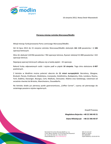 16 sierpnia 2012, Nowy Dwór Mazowiecki Pierwszy miesiąc Lotniska Warszawa/Modlin Minął miesiąc funkcjonowania Portu Lotniczego Warszawa/Modlin. Od 16 lipca 2012 do 15 sierpnia Lotnisko Warszawa/Modlin obsłużyło 161 119 pasażerów i 1 106 operacji lotniczych. Wizz Air obsłużył 118 956 pasażerów i 782 operacje lotnicze, Ryanair obsłużył 41 800 pasażerów i 322 operacje lotnicze. Najwięcej operacji lotniczych odbywa się w każdy piątek – 42 operacje. Rekord liczby odprawionych osób i rejsów padł w piątek 10 sierpnia. Tego dnia obsłużono 6 407 podróżnych. Z lotniska w Modlinie można polecieć obecnie do 21 miast europejskich: Barcelony, Glasgow, Brukseli, Paryża, Eindhoven, Mediolanu, Liverpoolu, Sztokholmu, Budapesztu, Oslo, Londynu, Rzymu, Forli, Dublina, Stavanger, Bourgas, Cork, Madrytu, Doncaster, Malmo oraz Goteborga, natomiast od września również do Bristolu, Manchesteru, Dusseldorfu. Na lotnisku działa już pierwszy punkt gastronomiczny „Coffee Corner”, czynny od pierwszego do ostatniego pasażera rejsów regularnych. Zespół Prasowy Magdalena Bojarska +48 22 346 40 21 Edyta Mikołajczyk +48 22 346 40 07
