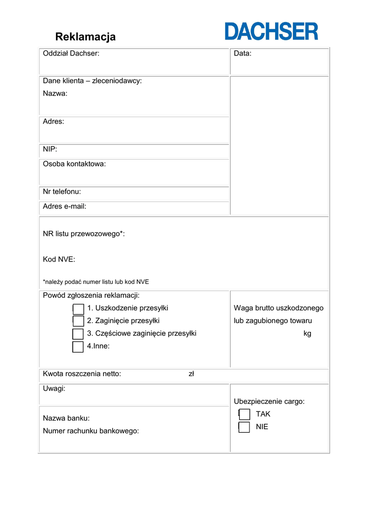Reklamacja Oddział Dachser: Data: Dane klienta – zleceniodawcy: Nazwa: Adres: NIP: Osoba kontaktowa: Nr telefonu: Adres e-mail: NR listu przewozowego*: Kod NVE: *należy podać numer listu lub kod NVE Powód zgłoszenia reklamacji: 1. Uszkodzenie przesyłki Waga brutto uszkodzonego 2. Zaginięcie przesyłki lub zagubionego towaru 3. Częściowe zaginięcie przesyłki kg 4.Inne: Kwota roszczenia netto: zł Uwagi: Ubezpieczenie cargo: Nazwa banku: Numer rachunku bankowego: TAK NIE Reklamacja Załączniki: