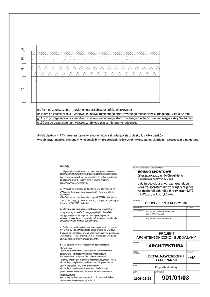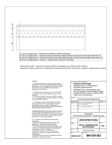 4 10 15 30 gr. 4cm po zagęszczeniu - nawierzchnia asfaltowa z asfaltu piaskowego gr.10cm po zagęszczeniu - warstwa kruszywa kamiennego stabilizowanego mechanicznie łamanego GRH-0/32 mm gr.15cm po zagęszczeniu - warstwa kruszywa kamiennego stabilizowanego mechanicznie łamanego frakcji 32-64 mm gr.30 cm po zagęszczeniu - warstwa z ubitego piasku, do gruntu rodzimego. Asfalt piaskowy (AP) - mieszanka mineralno-asfaltowa składająca się z piasku lub kilku piasków, wypełniacza, asfaltu, dobranych w odpowiednich proporcjach ilościowych, wytwarzana, układana i zagęszczana na gorąco. UWAGI: NAZWA I ADRES OBIEKTU BUDOWLANEGO BOISKO SPORTOWE 1. Rysunki architektoniczne należy używać razem z odpowiednimi rysunkami projektu konstrukcji i instalacji. Wykonawca przed przystąpieniem do robót powienien zapoznanać się ze wszystkimi dokumentacjami branżowymi i budowlanymi. 2. Wszystkie wymiary podawane są w centymetrach. - W opisach okien zawarto wielkość otworu w stanie surowym: - "hp" oznacza dół otworu liczony od "ZERA" budynku; "hn" oznacza górę otworu lub spód nadproża - podciągu liczony od "ZERA" budynku. 3. Ze względu na sposób zaokrąglania wymiarów w użytym programie CAD mogą wystąpić niewielkie niezgodności sumy wymiarów cząstkowych ze zbiorczym wymiarem elementu. W takich przypadkach decydujący jest wymiar sumaryczny. 4. Oblliczeń powierzchni dokonano w oparciu o normę PN-70/B-02365, zwiększając dokładność do 0,01m2. Podane powierzchnie mogą ulec nieznacznym zmianom w realizacji. Po zrealizowaniu obiektu należy wykonać pomiar przez uprawnionego geodetę. (skatepark przy ul. Królewskiej w Grodzisku Mazowieckim) składające się z utwardzonego placu wraz ze sprzętem umożliwiającym jazdę na deskorolkach rolkach, rowerach MTB i BMX, gry w koszykówkę INWESTOR Gmina Grodzisk Mazowiecki PODPIS PROJEKTANCI: ARCHITEKTURA mgr inż. arch. MARIUSZ CENDECKI upr. nr 6/R-31/ŁOIA/03 mgr inż. arch. MARCIN DOMITRZ PROJEKT ARCHITEKTONICZNO - BUDOWLANY BRANŻA 5 . W sprawach nie określonych dokumentacją obowiazują: - warunki techniczne wykonywania i odbioru robót budowlano - montażowych (wg Ministerstwa Budownictwa i Instytutu Techniki Budowlanej) - normy Polskiego Komitetu Normalizacyjnego (PKN) - instrukcje, wytyczne, świadectwa dopuszczenia, atesty Instytutu Techniki Budowlanej - instrukcje, wytyczne i warunki techniczne producentów i dostawców materiałów budowlanoinstalacyjnych - przepisy techniczne instytucji kontrolujacych jakości materiałów i wykonywanych robót. ARCHITEKTURA SKALA TREŚĆ RYSUNKU DETAL NAWIERZCHNI SKATEPARKU FAZA DATA 2009-02-28 1:10 Projekt budowlany NR RYSUNKU 901/01/03