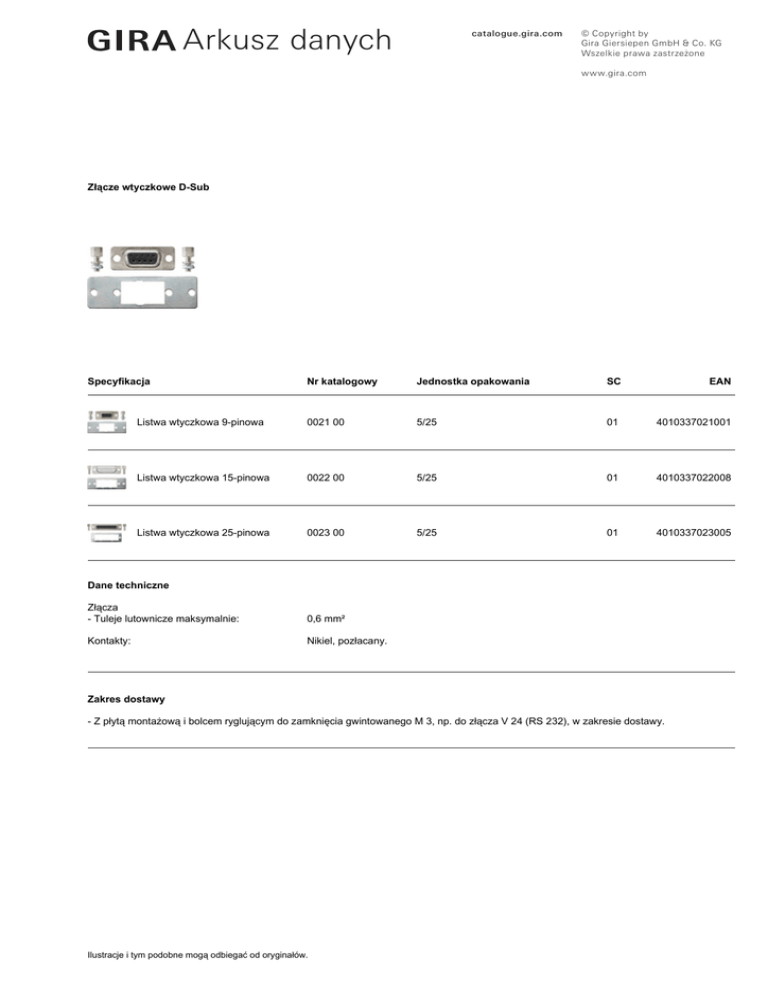 Arkusz danychń catalogue.gira.com © Copyright by Gira Giersiepen GmbH & Co. KG Wszelkie prawa zastrzeżone www.gira.com Złącze wtyczkowe D-Sub Specyfikacja Nr katalogowy Jednostka opakowania SC EAN Listwa wtyczkowa 9-pinowa 0021 00 5/25 01 4010337021001 Listwa wtyczkowa 15-pinowa 0022 00 5/25 01 4010337022008 Listwa wtyczkowa 25-pinowa 0023 00 5/25 01 4010337023005 Dane techniczne Złącza - Tuleje lutownicze maksymalnie: 0,6 mm² Kontakty: Nikiel, pozłacany. Zakres dostawy - Z płytą montażową i bolcem ryglującym do zamknięcia gwintowanego M 3, np. do złącza V 24 (RS 232), w zakresie dostawy. Ilustracje i tym podobne mogą odbiegać od oryginałów.