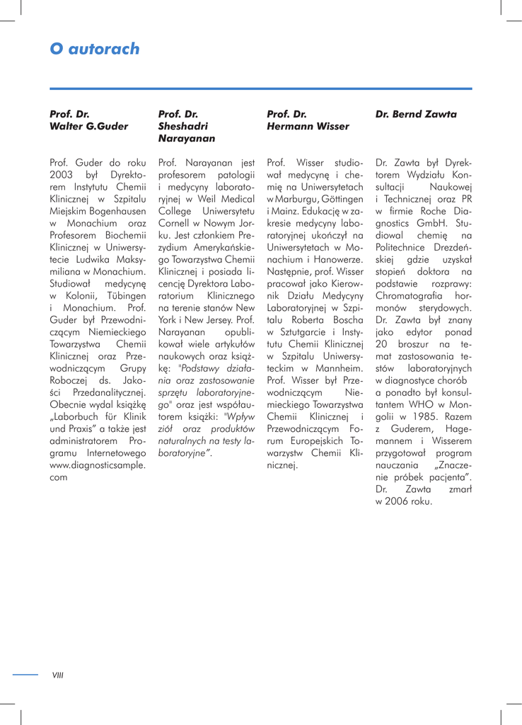 O autorach Prof. Dr. Walter G.Guder Prof. Dr. Sheshadri Narayanan Prof. Dr. Hermann Wisser Dr. Bernd Zawta Prof. Guder do roku 2003 był Dyrektorem Instytutu Chemii Klinicznej w Szpitalu Miejskim Bogenhausen w Monachium oraz Profesorem Biochemii Klinicznej w Uniwersytecie Ludwika Maksymiliana w Monachium. Studiował medycynę w Kolonii, Tübingen i Monachium. Prof. Guder był Przewodniczącym Niemieckiego Towarzystwa Chemii Klinicznej oraz Przewodniczącym Grupy Roboczej ds. Jakości Przedanalitycznej. Obecnie wydal książkę „Laborbuch für Klinik und Praxis” a także jest administratorem Programu Internetowego www.diagnosticsample. com Prof. Narayanan jest profesorem patologii i medycyny laboratoryjnej w Weil Medical College Uniwersytetu Cornell w Nowym Jorku. Jest członkiem Prezydium Amerykańskiego Towarzystwa Chemii Klinicznej i posiada licencję Dyrektora Laboratorium Klinicznego na terenie stanów New York i New Jersey. Prof. Narayanan opublikował wiele artykułów naukowych oraz książkę: "Podstawy działania oraz zastosowanie sprzętu laboratoryjnego" oraz jest współautorem książki: "Wpływ ziół oraz produktów naturalnych na testy laboratoryjne”. Prof. Wisser studiował medycynę i chemię na Uniwersytetach w Marburgu, Göttingen i Mainz. Edukację w zakresie medycyny laboratoryjnej ukończył na Uniwersytetach w Monachium i Hanowerze. Następnie, prof. Wisser pracował jako Kierownik Działu Medycyny Laboratoryjnej w Szpitalu Roberta Boscha w Sztutgarcie i Instytutu Chemii Klinicznej w Szpitalu Uniwersyteckim w Mannheim. Prof. Wisser był Przewodniczącym Niemieckiego Towarzystwa Chemii Klinicznej i Przewodniczącym Forum Europejskich Towarzystw Chemii Klinicznej. Dr. Zawta był Dyrektorem Wydziału Konsultacji Naukowej i Technicznej oraz PR w firmie Roche Diagnostics GmbH. Studiowal chemię na Politechnice Drezdeńskiej gdzie uzyskał stopień doktora na podstawie rozprawy: Chromatografia hormonów sterydowych. Dr. Zawta był znany jako edytor ponad 20 broszur na temat zastosowania testów laboratoryjnych w diagnostyce chorób a ponadto był konsultantem WHO w Mongolii w 1985. Razem z Guderem, Hagemannem i Wisserem przygotował program nauczania „Znaczenie próbek pacjenta”. Dr. Zawta zmarł w 2006 roku. VIII