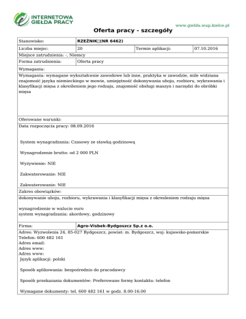 Oferta pracy - szczegóły Stanowisko: RZEŹNIK (NR 6462) Liczba miejsc: 20 Termin aplikacji: www.gielda.wup.kielce.pl 07.10.2016 Miejsce zatrudnienia: -, Niemcy Forma zatrudnienia: Oferta pracy Wymagania: Wymagania: wymagane wykształcenie zawodowe lub inne, praktyka w zawodzie, mile widziana znajomość języka niemieckiego w mowie, umiejętność dokonywania uboju, rozbioru, wykrawania i klasyfikacji mięsa z określeniem jego rodzaju, znajomość obsługi maszyn i narzędzi do obróbki mięsa Oferowane warunki: Data rozpoczęcia pracy: 08.09.2016 System wynagradzania: Czasowy ze stawką godzinową Wynagrodzenie brutto: od 2 000 PLN Wyżywienie: NIE Zakwaterowanie: NIE Zakwaterowanie: NIE Zakres obowiązków: dokonywanie uboju, rozbioru, wykrawania i klasyfikacji mięsa z okresleniem rodzaju mięsa wynagrodzenie w walucie euro system wynagradzania: akordowy, godzinowy Firma: Agro-Visbek-Bydgoszcz Sp.z o.o. Adres: Wyzwolenia 24, 85-027 Bydgoszcz, powiat: m. Bydgoszcz, woj: kujawsko-pomorskie Telefon: 600 482 161 Adres email: Adres www: Adres www: Język aplikacji: polski Sposób aplikowania: bezpośrednio do pracodawcy Sposób przekazania dokumentów: Preferowane formy kontaktu: telefon Wymagane dokumenty: tel. 600 482 161 w godz. 8.00-16.00 Uwagi: Identyfikator oferty: StPr/16/6462 Instytucja koordynująca ofertę: Powiatowy Urząd Pracy w Bydgoszczy Urząd Pracy dokłada wszelkich starań, aby oferty pracy będące w zasobach urzędu, były rzetelne i wiarygodne. Ponieważ wszystkie oferty pracy pochodzą od osób trzecich Urząd Pracy zastrzega, że odpowiedzialność za ewentualne rozbieżności pomiędzy warunkami pracy zaprezentowanymi w niniejszej ofercie a warunkami zaproponowanymi przez potencjalnego pracodawcę ponosi pracodawca.