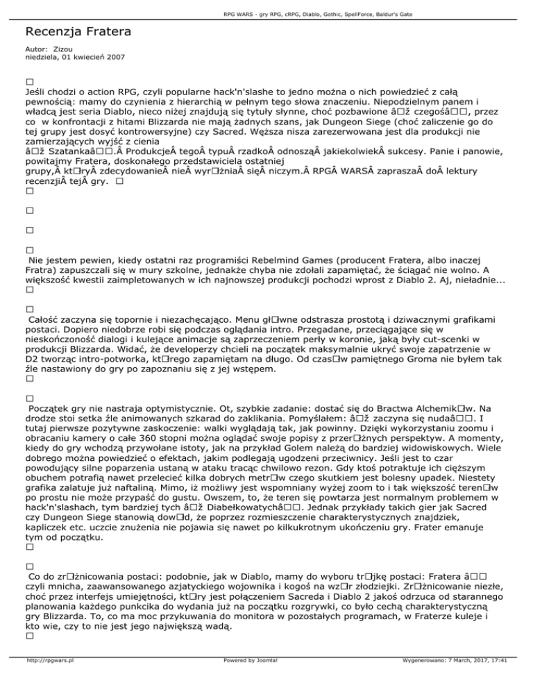 RPG WARS - gry RPG, cRPG, Diablo, Gothic, SpellForce, Baldur's Gate Recenzja Fratera Autor: Zizou niedziela, 01 kwiecień 2007 Jeśli chodzi o action RPG, czyli popularne hack'n'slashe to jedno można o nich powiedzieć z całą pewnością: mamy do czynienia z hierarchią w pełnym tego słowa znaczeniu. Niepodzielnym panem i władcą jest seria Diablo, nieco niżej znajdują się tytuły słynne, choć pozbawione „czegośâ€•, przez co w konfrontacji z hitami Blizzarda nie mają żadnych szans, jak Dungeon Siege (choć zaliczenie go do tej grupy jest dosyć kontrowersyjne) czy Sacred. Węższa nisza zarezerwowana jest dla produkcji nie zamierzających wyjść z cienia „Szatanka―. Produkcje tego typu rzadko odnosząÂ jakiekolwiek sukcesy. Panie i panowie, powitajmy Fratera, doskonałego przedstawiciela ostatniej grupy, ktÃłry zdecydowanie nie wyrÃłżnia się niczym. RPG WARS zaprasza do lektury recenzji tej gry. Nie jestem pewien, kiedy ostatni raz programiści Rebelmind Games (producent Fratera, albo inaczej Fratra) zapuszczali się w mury szkolne, jednakże chyba nie zdołali zapamiętać, że ściągać nie wolno. A większość kwestii zaimpletowanych w ich najnowszej produkcji pochodzi wprost z Diablo 2. Aj, nieładnie... Całość zaczyna się topornie i niezachęcająco. Menu głÃłwne odstrasza prostotą i dziwacznymi grafikami postaci. Dopiero niedobrze robi się podczas oglądania intro. Przegadane, przeciągające się w nieskończoność dialogi i kulejące animacje są zaprzeczeniem perły w koronie, jaką były cut-scenki w produkcji Blizzarda. Widać, że developerzy chcieli na początek maksymalnie ukryć swoje zapatrzenie w D2 tworząc intro-potworka, ktÃłrego zapamiętam na długo. Od czasÃłw pamiętnego Groma nie byłem tak źle nastawiony do gry po zapoznaniu się z jej wstępem. Początek gry nie nastraja optymistycznie. Ot, szybkie zadanie: dostać się do Bractwa AlchemikÃłw. Na drodze stoi setka źle animowanych szkarad do zaklikania. Pomyślałem: „zaczyna się nuda―. I tutaj pierwsze pozytywne zaskoczenie: walki wyglądają tak, jak powinny. Dzięki wykorzystaniu zoomu i obracaniu kamery o całe 360 stopni można oglądać swoje popisy z przerÃłżnych perspektyw. A momenty, kiedy do gry wchodzą przywołane istoty, jak na przykład Golem należą do bardziej widowiskowych. Wiele dobrego można powiedzieć o efektach, jakim podlegają ugodzeni przeciwnicy. Jeśli jest to czar powodujący silne poparzenia ustaną w ataku tracąc chwilowo rezon. Gdy ktoś potraktuje ich cięższym obuchem potrafią nawet przelecieć kilka dobrych metrÃłw czego skutkiem jest bolesny upadek. Niestety grafika zalatuje już naftaliną. Mimo, iż możliwy jest wspomniany wyżej zoom to i tak większość terenÃłw po prostu nie może przypaść do gustu. Owszem, to, że teren się powtarza jest normalnym problemem w hack'n'slashach, tym bardziej tych „Diabełkowatych―. Jednak przykłady takich gier jak Sacred czy Dungeon Siege stanowią dowÃłd, że poprzez rozmieszczenie charakterystycznych znajdziek, kapliczek etc. uczcie znużenia nie pojawia się nawet po kilkukrotnym ukończeniu gry. Frater emanuje tym od początku. Co do zrÃłżnicowania postaci: podobnie, jak w Diablo, mamy do wyboru trÃłjkę postaci: Fratera – czyli mnicha, zaawansowanego azjatyckiego wojownika i kogoś na wzÃłr złodziejki. ZrÃłżnicowanie niezłe, choć przez interfejs umiejętności, ktÃłry jest połączeniem Sacreda i Diablo 2 jakoś odrzuca od starannego planowania każdego punkcika do wydania już na początku rozgrywki, co było cechą charakterystyczną gry Blizzarda. To, co ma moc przykuwania do monitora w pozostałych programach, w Fraterze kuleje i kto wie, czy to nie jest jego największą wadą. http://rpgwars.pl Powered by Joomla! Wygenerowano: 7 March, 2017, 17:41 RPG WARS - gry RPG, cRPG, Diablo, Gothic, SpellForce, Baldur's Gate Kolekcjonowanie przedmiotÃłw, ktÃłre tak silnie oddziałuje na graczy w innych action RPGach tutaj jakoś nie wydaje się być pociągającym. „Ot, kolejny niezły item― - tyle można sobie pomyśleć po uzyskaniu kolejnej zbroi/broni. Kiedy przypomnę sobie momenty, gdy drżącymi rękoma sięgałem po zwÃłj identyfikacyjny na wspaniale zapowiadającą się, „złotąâ€• zbroję w... wiadomo, jakiej grze, śmiech pusty bierze. Muzyka nudzi się już po kilkunastu minutach, toteż wątpię, czy znajdą się masochiści, ktÃłrzy nie przerzucą się w końcu na odsłuchiwanie własnych zbiorÃłw mp3 w trakcie gry. Odgłosy postaci i ogÃłlnie tło audio wypada dobrze. Przynajmniej tyle na osłodę. Podsumowując, zupełnie, zupełnie przeciętna gierka, ktÃłra nie ma najmniejszych szans na zapisanie się złotymi zgłoskami w historii action RPG. Zbyt wiele elementÃłw gry jest niedopracowanych, szukanie przedmiotÃłw nie jest taką radością jak w Diablo, a sam rozwÃłj postaci, będący w pewien sposÃłb hybrydą Sacreda i Diablo 2 nie spisuje się tak, jak powinien. Jako gracz, ktÃłry zjadł zęby na przedstawicielach tego typu segmentu RPG nie mogę wprost dać wysokiej oceny, gdyż spoliczkowałbym tym pamięć „ojcÃłw gatunku―. Tylko i aż 5/10. zrecenzował: Zizou All rights reserved by RPG WARS Company http://rpgwars.pl Powered by Joomla! Wygenerowano: 7 March, 2017, 17:41
