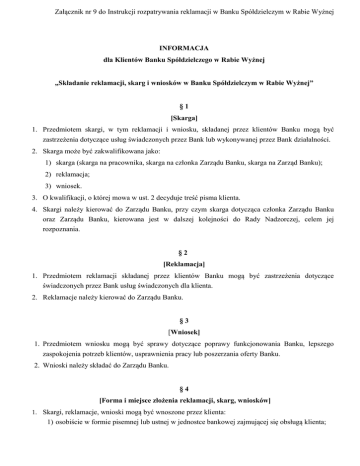Załącznik nr 9 do Instrukcji rozpatrywania reklamacji w Banku Spółdzielczym w Rabie Wyżnej INFORMACJA dla Klientów Banku Spółdzielczego w Rabie Wyżnej „Składanie reklamacji, skarg i wniosków w Banku Spółdzielczym w Rabie Wyżnej” §1 [Skarga] 1. Przedmiotem skargi, w tym reklamacji i wniosku, składanej przez klientów Banku mogą być zastrzeżenia dotyczące usług świadczonych przez Bank lub wykonywanej przez Bank działalności. 2. Skarga może być zakwalifikowana jako: 1) skarga (skarga na pracownika, skarga na członka Zarządu Banku, skarga na Zarząd Banku); 2) reklamacja; 3) wniosek. 3. O kwalifikacji, o której mowa w ust. 2 decyduje treść pisma klienta. 4. Skargi należy kierować do Zarządu Banku, przy czym skarga dotycząca członka Zarządu Banku oraz Zarządu Banku, kierowana jest w dalszej kolejności do Rady Nadzorczej, celem jej rozpoznania. §2 [Reklamacja] 1. Przedmiotem reklamacji składanej przez klientów Banku mogą być zastrzeżenia dotyczące świadczonych przez Bank usług świadczonych dla klienta. 2. Reklamacje należy kierować do Zarządu Banku. §3 [Wniosek] 1. Przedmiotem wniosku mogą być sprawy dotyczące poprawy funkcjonowania Banku, lepszego zaspokojenia potrzeb klientów, usprawnienia pracy lub poszerzania oferty Banku. 2. Wnioski należy składać do Zarządu Banku. §4 [Forma i miejsce złożenia reklamacji, skarg, wniosków] 1. Skargi, reklamacje, wnioski mogą być wnoszone przez klienta: 1) osobiście w formie pisemnej lub ustnej w jednostce bankowej zajmującej się obsługą klienta; Załącznik nr 9 do Instrukcji rozpatrywania reklamacji w Banku Spółdzielczym w Rabie Wyżnej 2) listownie w formie pisemnej na adres jednostki bankowej zajmującej się obsługą klienta; 3) z wykorzystaniem środków komunikacji elektronicznej w formie elektronicznej wysyłając e – mail na adres podany na stronie internetowej Banku, tj. [email protected] ; 4) telefonicznie w formie ustnej poprzez kontakt z Call Center, którego numery telefonu podane są na stronie internetowej Banku, tj. […], 5) telefonicznie w formie ustnej na numer telefonu wskazany na stronie internetowej Banku, tj. 18-26-91-200. 2. Skargi, reklamacje, wnioski, o których mowa w ust. 1 pkt 1 – 2 mogą być wnoszone przez klienta w następujących jednostkach bankowych zajmujących się obsługą klienta: 1) Centrala – Raba Wyżna 30; 2) Filia w Rabce-Zdrój ul. Orkana 3a ; 3) Filia w Rabce-Zdrój ul. Nowy Świat 17a; 4) Filia w Rabce-Zdrój ul. Chopina 16; 5) Filia w Spytkowicach – Spytkowice 1c; 6) Filia w Skawie – Skawa 583a; 7) Filia w Nowym Targu – ul. Szaflarska 144; 8) Filia w Podsarniu – Budynek OSP; 9) Filia w Pieniążkowicach – Pieniążkowice 140a; 10) Filia w Wieliczce – Wieliczka ul. Dobczycka 27. §5 [Zakres danych zawartych w skardze, reklamacji, wniosku] 1. Treść skargi, reklamacji, wniosku złożonej w formie pisemnej powinna zawierać: 1) imię i nazwisko lub nazwę klienta; 2) adres korespondencyjny; 3) dokładny opis zdarzenia lub przedmiotu zastrzeżeń klienta; 4) oczekiwany przez klienta stan po rozpatrzeniu zastrzeżeń; 5) własnoręczny podpis klienta. 2. Dodatkowo, w celu ułatwienia identyfikacji klienta, formularz skargi, reklamacji, wniosku może zawierać następujące dane: PESEL, NIP lub numer w rejestrze przedsiębiorców Krajowego Rejestru Sądowego. 3. Formularz skargi, reklamacji, wniosku dostępny jest na stronie internetowej Banku. 4. W przypadku stwierdzenia przez pracownika jednostki bankowej braku informacji wymaganych do rozpatrzenia skargi, reklamacji, wniosku, o których mowa w ust. 1 pracownik jednostki bankowej zobowiązuje klienta do ich uzupełnienie w formie w jakiej klient złożył skargę, reklamację, wniosek. 5. W sytuacji odmowy podania przez klienta wszystkich danych niezbędnych do rozpoczęcia procesu dotyczącego rozpatrzenia skargi, reklamacji, wniosku, pracownik jednostki bankowej informuje klienta, że rozpatrzenie skargi, reklamacji, wniosku nie będzie możliwe, ze względu na Załącznik nr 9 do Instrukcji rozpatrywania reklamacji w Banku Spółdzielczym w Rabie Wyżnej niekompletność oświadczenia klienta. W takim przypadku klient jest informowany o negatywnym rozpatrzeniu skargi w terminie wskazanym w § 7 ust. 1 lub 2. 6. Przepisu § 5 ust. 5 zd. 2 nie stosuje się do klientów instytucjonalnych za wyjątkiem osób fizycznych prowadzących działalność gospodarczą i rolników. §6 [Sposób potwierdzenia wpływu skargi, reklamacji, wniosku] 1. Pracownik jednostki bankowej przyjmujący skargę, reklamację, wniosek złożoną: 1) osobiście w formie pisemnej w jednostce bankowej zajmującej się obsługą klienta; 2) osobiście w formie ustnej w jednostce bankowej zajmującej się obsługą klienta, z której następnie pracownik jednostki bankowej sporządził na formularzu skargę, reklamację, wniosek potwierdza jej złożenie poprzez sporządzenie kopii dla klienta i opatruje ją pieczątką imienną, podpisem pracownika przyjmującego skargę, reklamację, wniosek oraz opatruje datę jej przyjęcia. 2. W przypadku złożenia skargi, reklamacji, wniosku w sposób opisany w § 4 ust. 1 pkt 2 - 5 pracownik jednostki bankowej przyjmujący skargę, reklamację, wniosek potwierdza jej złożenie w formie pisemnej poprzez poinformowanie klienta o przyjęciu skargi, reklamacji, wniosku wraz ze wskazaniem terminu jej rozpatrzenia. 3. W odniesieniu do klientów, którzy nie zawarli umowy z Bankiem pracownik jednostki bankowej wraz z potwierdzeniem złożenia skargi, o którym mowa w ust. 1 i 2 przekazuje klientowi w formie pisemnej następujące informacje: 1) miejsce składania skarg, reklamacji, wniosków; 2) przyjętą przez Bank formę składania skarg, reklamacji, wniosków; 3) termin rozpatrzenia skargi, reklamacji, wniosku; 4) sposób powiadomienia o rozpatrzeniu skargi, reklamacji, wniosku. 4. Przepisu § 6 ust. 3 nie stosuje się do klientów instytucjonalnych za wyją