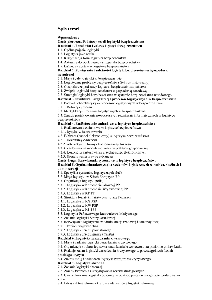 Spis treści Wprowadzenie Część pierwsza. Podstawy teorii logistyki bezpieczeństwa Rozdział 1. Przedmiot i zakres logistyki bezpieczeństwa 1.1. Ogólne pojęcie logistyki 1.2. Logistyka jako nauka 1.3. Klasyfikacja form logistyki bezpieczeństwa 1.4. Aktualny dorobek naukowy logistyki bezpieczeństwa 1.5. Łańcuchy dostaw w logistyce bezpieczeństwa Rozdział 2. Powiązania i zależności logistyki bezpieczeństwa i gospodarki narodowej 2.1. Misja i cele logistyki w bezpieczeństwie 2.2. Logistyczne problemy bezpieczeństwa (ich rys historyczny) 2.3. Gospodarcze podstawy logistyki bezpieczeństwa państwa 2.4. Związki logistyki bezpieczeństwa z gospodarką narodową 2.5. Strategie logistyki bezpieczeństwa w systemie bezpieczeństwa narodowego Rozdział 3. Struktura i organizacja procesów logistycznych w bezpieczeństwie 3.1. Podział i charakterystyka procesów logistycznych w bezpieczeństwie 3.1.1. Definicja procesu 3.2. Identyfikacja procesów logistycznych w bezpieczeństwie 3.3. Zasady projektowania nowoczesnych rozwiązań informatycznych w logistyce bezpieczeństwa Rozdział 4. Budżetowanie zadaniowe w logistyce bezpieczeństwa 4.1. Budżetowanie zadaniowe w logistyce bezpieczeństwa 4.1.1. Ryzyko w budżetowaniu 4.2. E-biznes (handel elektroniczny) a logistyka bezpieczeństwa 4.2.1. Uczestnicy e-biznesu 4.2.2. Alternatywne formy elektronicznego biznesu 4.2.3. Zastosowanie modeli e-biznesu w praktyce gospodarczej 4.2.4. Korzyści z zastosowania przedsięwzięć elektronicznych 4.2.5. Uregulowania prawne e-biznesu Część druga. Rozwiązania systemowe w logistyce bezpieczeństwa Rozdział 5. Ogólna charakterystyka systemów logistycznych w wojsku, służbach i administracji 5.1. Specyfika systemów logistycznych służb 5.2. Misja logistyki w Siłach Zbrojnych RP 5.3. Organizacja logistyki policji 5.3.1. Logistyka w Komendzie Głównej PP 5.3.2. Logistyka w Komendzie Wojewódzkiej PP 5.3.3. Logistyka w KP PP 5.4. Struktura logistyki Państwowej Staży Pożarnej 5.4.1. Logistyka w KG PSP 5.4.2. Logistyka w KW PSP 5.4.3. Logistyka w KP PSP 5.5. Logistyka Państwowego Ratownictwa Medycznego 5.6. Zadania logistyki Straży Granicznej 5.7. Rozwiązania logistyczne w administracji rządowej i samorządowej 5.7.1. Poziom województwa 5.7.2. Logistyka urzędu powiatowego 5.7.3. Logistyka urzędu gminy (miasta) Rozdział 6. Logistyka zarządzania kryzysowego 6.1. Misja i zadania logistyki zarządzania kryzysowego 6.2. Organizacja struktur logistyka zarządzania kryzysowego na poziomie gminy-kraju 6.3. Rodzaje zadań logistyki zarządzania kryzysowego w poszczególnych fazach przebiegu kryzysu 6.4. Zakres usług i świadczeń logistyki zarządzania kryzysowego Rozdział 7. Logistyka obronna 7.1. Zadania logistyki obronnej 7.2. Zasady tworzenia i utrzymywania rezerw strategicznych 7.3. Uwarunkowania logistyki obronnej w polityce przestrzennego zagospodarowania kraju 7.4. Infrastruktura obronna kraju – zadania i cele logistyki obronnej Rozdział 8. Logistyka bezpieczeństwa biznesu 8.1. Przepływy biznesowe – misja i zadania logistyki bezpieczeństwa biznesu 8.2. Rola logistyki w ocenie ryzyka zamierzeń biznesowych 8.3. Wymagania logistyczne w procesach realizacji zadań związanych z BHP 8.4. Logistyka w procesach badań naukowych i nowych technologii Zakończenie Bibliografia Wykaz rysunków i tabel