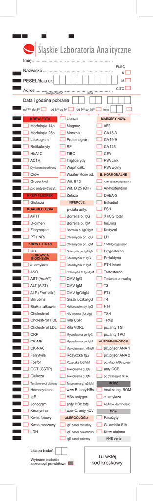 Śląskie Laboratoria Analityczne Imię ................................................................... Nazwisko .......................................................... PŁEĆ K PESEL/data ur. M Adres ................................................................ miejscowość CITO ulica Data i godzina pobrania od 700 do 800 1 2 od 800 do 900 3 4 5 od 900 do 1000 6 7 8 inna 9 10 11 KREW EDTA Lipaza Morfologia 14p Magnez AFP Morfologia 25p Mocznik CA 15-3 Leukogram Proteinogram CA 19-9 Retikulocyty RF CA 125 HbA1C TIBC CEA 12 MARKERY NOW. ACTH Triglicerydy PSA całk. Cynkoprotoporfiryny Wapń całk. PSA wolny Ołów Waaler-Rose od. Grupa krwi Wit. B12 AMH (antyMüllerian h.) p/c antyerytrocyt. Wit. D 25 (OH) Androstendion Żelazo DHEA-S KREW FLUOREK Glukoza B. HORMONALNE Estradiol INFEKCJE p-ciała anty: FSH APTT Borrelia b. IgG b HCG total D-dimery Borrelia b. IgM Insulina Fibrynogen Borrelia b. IgG/IgM Kortyzol PT (INR) Chlamydia pn. IgG LH Chlamydia pn. IgM 17-OHprogesteron Chlamydia pn. IgG/IgM Progesteron Chlamydia tr. IgG Prolaktyna KOAGULOLOGIA KREW CYTRYN OB SUROWICA BIOCHEMIA a amylaza Chlamydia tr. IgM PTH intact ASO Chlamydia tr. IgG/IgM Testosteron AST (AspAT) CMV IgG Testosteron wolny ALT (AIAT) CMV IgM T3 ALP (Fosf. alk.) CMV IgG/IgM FT3 Bilirubina Glista ludzka IgG T4 Białko całkowite Helicobacter pyl. IgG FT4 Cholesterol HIV combo (Ab, Ag) TSH Cholesterol HDL Kiła USR TRAB Cholesterol LDL Kiła VDRL pc. anty TG CRP Mycoplasma pn. IgG pc. anty TPO CK-MB Mycoplasma pn. IgM AUTOIMMUNODGN CK-NAC Mycoplasma pn. IgG/IgM pc. p/jądr ANA 1 Ferrytyna Różyczka IgG pc. p/jądr ANA 2 Fosfor Różyczka IgG/IgM pc. p/jądr ANA screen GGT (GGTP) Toxoplasma g. IgG anty CCP Glukoza Toxoplasma g. IgM pc.p/transglut. tk. A Test tolerancji glukozy Toxoplasma g. IgG/IgM Homocysteina wzw B: anty HBs Analiza og. BOM IgE HBs antygen a amylaza Jonogram anty HBc total ALA (kw. daminolew) Kreatynina wzw C: anty HCV Kwas foliowy MOCZ KAŁ Pasożyty ALERGOLOGIA Kwas moczowy IgE panel mieszany G. lamblia EIA LDH IgE panel pokarmowy Krew utajona IgE panel wziewny INNE verte Liczba badań Wybrane badania zaznaczyć prawidłowo Tu wklej kod kreskowy INNE onania przetwarzanie DATA/GODZINA Zgodnie z zapisem w systemie LIS Śląskie Laboratoria Analityczne Sp. z o.o. Centralne Laboratorium ul. Żelazna 1, Katowice tel. 32 35 90 922, fax 32 35 90 928 www.sla.pl Czynne: od poniedziałku do piątku w godz. 6.00 – 21.00 w soboty: 7.00 – 11.00 [email protected]