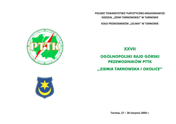 POLSKIE TOWARZYSTWO TURYSTYCZNO‐KRAJOZNAWCZE ODDZIAŁ „ZIEMI TARNOWSKIEJ” W TARNOWIE KOŁO PRZWODNIKÓW „LELIWA” W TARNOWIE XXVII OGÓLNOPOLSKI RAJD GÓRSKI PRZEWODNIKÓW PTTK „ZIEMIA TARNOWSKA I OKOLICE” Tarnów, 27 – 30 sierpnia 2009 r. REGULAMIN XXVII OGÓLNOPOLSKIEGO GÓRSKIEGO RAJDU PRZEWODNIKÓW PTTK I. ORGANIZATORZY Zarząd Oddziału „Ziemi Tarnowskiej” w Tarnowie Koło Przewodników „Leliwa” w Tarnowie Komisja Przewodnicka ZG PTTK Patronat Honorowy Rajdu: Marszałek Województwa Małopolskiego Prezydent Miasta Tarnowa Starosta Powiatowy w Tarnowie Prezes ZG PTTK II. KIEROWNICTWO RAJDU Barbara Jarocka – Komandor Rajdu Jan Knapik – Vice-komandor Rajdu Dariusz Kuta – kwatermistrz Tomasz Przygoda – zastępca kwatermistrza Stanisław Kornaś – szef biura i oprawa medialna Marzena Misaczek – skarbnik Beata Dziduszko – zastępca skarbnika Adres kierownictwa Rajdu: Oddział „Ziemi Tarnowskiej” PTTK w Tarnowie ul. Żydowska 20 33 – 100 Tarnów Tel/fax (0-14) 622 22 00, (0-14) 655 43 53 e-mail: [email protected] www.tarnow.pttk.pl IV. CELE RAJDU poznanie i popularyzacja walorów turystyczno-krajoznawczych Pogórza Ciężkowicko – Rożnowskiego propagowanie zasobów przyrodniczych na trasach turystycznych uczczenie 55-lecia Koła Przewodników „Leliwa” w Tarnowie obchody roku Bema w Tarnowie integracja braci przewodnickiej V. TERMIN RAJDU Rajd odbędzie się w dniach 27 – 30 sierpnia 2009r. (czwartek – niedziela). Rozpoczęcie Rajdu nastąpi w momencie wyjścia na trasy (czwartek – godziny 8.00; 8.30). Uroczyste otwarcie Rajdu nastąpi 27.08.2009r. (czwartek) o godz. 18.00 w Sali Lustrzanej na ul. Wałowej 10 w Tarnowie. Oficjalne zakończenie Rajdu nastąpi w sobotę, 29.08.2009r. o godz. 19. 00 na Campingu 202 przy ul. Piłsudskiego 28A w Tarnowie. VI. UCZESTNICTWO W RAJDZIE W Rajdzie mogą brać udział zespoły kilkuosobowe zgłoszone przez Koła (kluby) Przewodnickie i Oddziały PTTK, a także przewodnicy indywidualni Należy zabrać ze sobą odpowiednie obuwie i odzież uwzględniając zmienne warunki atmosferyczne. Na czas wędrówki zalecane jest posiadanie zapasowej odzieży oraz wyżywienia, a także apteczki i dodatkowych lekarstw oraz latarki. Każdy uczestnik powinien posiadać: dowód osobisty, legitymację przewodnicką oraz legitymację PTTK – z aktualnie opłaconymi składkami. VII. ZGŁOSZENIA UCZESTNICTWA W RAJDZIE Zgłoszenia uczestnictwa w Rajdzie wraz z kopią wpłaty należy dokonać poprzez wysłanie „KART ZGŁOSZENIA” (w załączeniu) w terminie do 12 lipca 2009 r. na adres: Oddział „Ziemi Tarnowskiej” PTTK w Tarnowie ul. Żydowska 20 33 – 100 Tarnów z dopiskiem XXVII Rajd Górski wpłata na konto: III. OBSŁUGA PRZEWODNICKA TRAS Trasa A: Barbara Jagiencarz, Jan Knapik, Andrzej Mleczko Trasa B: Janusz Foszcz, Bogusław Furtek, Renata Gruca, Bernadeta Kwaśna Trasa C: Barbara Gniadek, Zdzisław Łączak, Rafał Magiera, Jerzy Zieliński Trasa D: Krystyna Bryl, Urszula Kocik, Lidia Słowik Trasa autokarowa: Stanisław Ligęza, Janina Waszkiewicz, Lidia Ząbczyńska LUKAS Bank 62 1940 1076 3028 5525 0000 0000 UWAGA: Liczba uczestników jest ograniczona i o przyjęciu do udziału w Rajdzie będzie decydować kolejność zgłoszeń VIII. ZAKWATEROWANIE UCZESTNIKÓW 1. Internat w Specjalnym Ośrodku Szkolno-Wychowawczym ul. Romanowicza 9 33-100 Tarnów 2. Camping 202 Pod Jabłoniami ul. Piłsudskiego 28A 33-100 Tarnów Biuro i sekretariat kwatermistrza Rajdu (czynne w dniach 26-31.08.2009r.): Camping 202 Pod Jabłoniami ul. Piłsudskiego 28A 33-100 Tarnów Dojazd do miejsca zakwaterowania: do internatu: Z dworca PKP i PKS udać się na przystanek autobusu ZKM nr 30 i 35 na camping: Z dworca PKP i PKS udać się na przystanek autobusu ZKM nr 30 Czas przejazdu: 15 – 20 min Cena biletu normalnego: 2,30 PLN Cena biletu ulgowego lokalnego: 1,30 PLN IX. KOSZTY UCZESTNICTWA Opłata za udział w Rajdzie wynosi 300 zł (słownie – trzysta złotych) dla przewodników oraz 330 zł (słownie - trzysta trzydzieści) dla pozostałych. Cena ta obejmuje: 3 noclegi, 3 śniadania, 3 obiadokolacje, 2 wieczory przewodnickie, odznakę rajdową oraz materiały przewodnickie. Koszt wycieczki niedzielnej autokarowej wynosi dodatkowo 30 zł (słownie – trzydzieści złotych) X. POTWIERDZENIE UCZESTNICTWA Potwierdzenie przyjęcia do udziału w Rajdzie zostanie przesłane na wskazany w karcie zgłoszenia adres w terminie do 08 sierpnia 2009 r. XI. PRZEBIEG RAJDU Deklarując udział w Rajdzie należy wybrać jedną z czterech tras pieszych lub trasę autokarową oraz jedną z tras niedzielnych. W przypadku zgłoszenia mniej niż 16 osób na daną trasę, organizatorzy zastrzegają sobie prawo przeniesienia tych osób na inną z tras. W karcie zgłoszeń prosimy o podanie trasy zastępczej. W niedzielnej wycieczce autokarowej grupa musi liczyć co najmniej 40 osób. XII. TRASY RAJDU (wyjścia o godz. 8.00 i 8.30 w zależności od tras) Trasa A: 1. czwartek - przejazd z Tarnowa do Skrzyszowa, kościół p.w. św. Stanisława , przejście piesze na trasie: Skrzyszów (szlak zielony) - Las Kruk - Góra św. Marcina , kościół p.w. św. Marcina, ruiny zamku Tarnowskich, grodzisko-Tarnów, kościół p.w. Trójcy Świętej i Stary Cmentarz. Przejście piesze - 3.00 h. pkt GOT - 11 2. piątek - przejazd z Tarnowa do Siekierczyny; przejście piesze na trasie: Siekierczyna Bukowiec (szlak niebieski) - Jamna (szlak zielony) - Soliska (szlak niebieski) Skały Wieprzek – Jastrzębia, kościół p.w. św. Bartłomieja, Muzeum Regionalne „Grociarnia” (szlak czerwony). Przejazd z Jastrzębi do Kąśnej Dolnej, dworek. Przejście do wylotu „Skamieniałego Miasta” zwiedzanie rezerwatu. Powrót do Tarnowa. Przejście piesze 5.0 h pkt GOT - 25 3. sobota - przejazd z Tarnowa do Siemiechowa, kościół p.w. M.B. Gromnicznej; przejście piesze na trasie: Siemiechów - Wielkie Góry - Wał (szlak żółty), cmentarz nr 186 i kamienioł