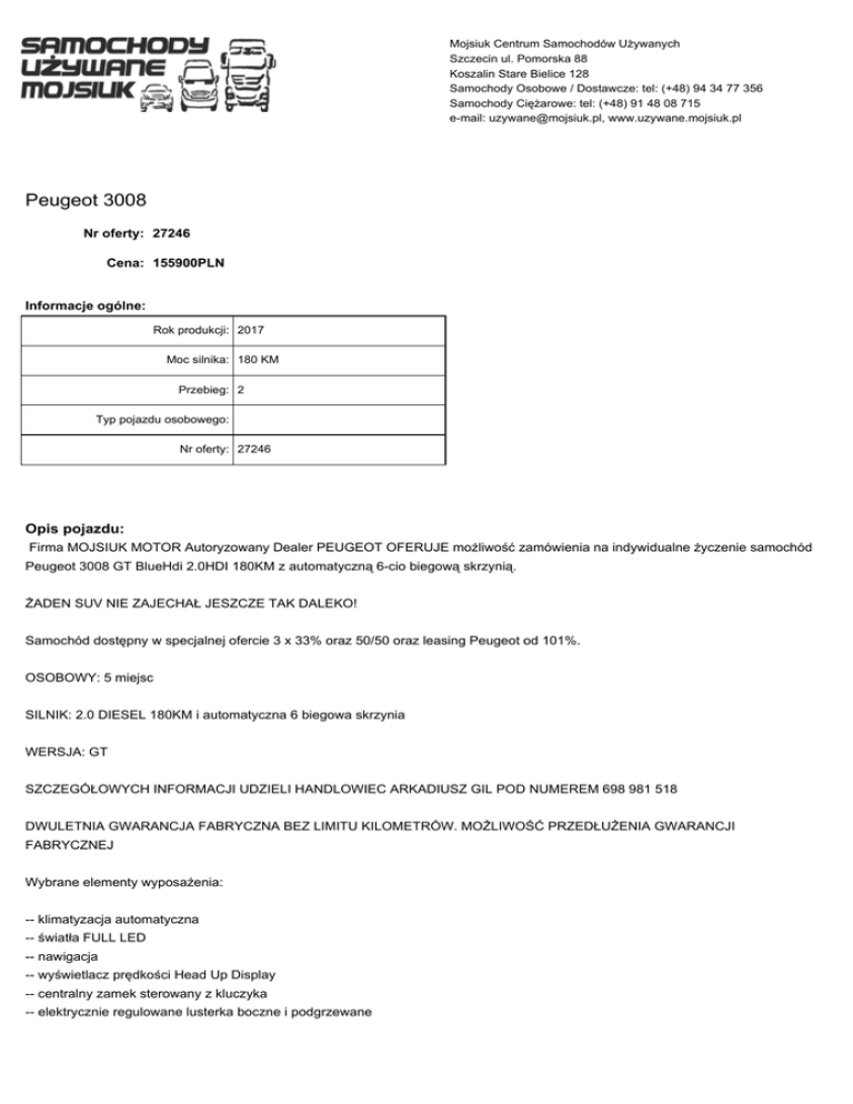 Mojsiuk Centrum Samochodów Używanych Szczecin ul. Pomorska 88 Koszalin Stare Bielice 128 Samochody Osobowe / Dostawcze: tel: (+48) 94 34 77 356 Samochody Ciężarowe: tel: (+48) 91 48 08 715 e-mail: [email protected], www.uzywane.mojsiuk.pl Peugeot 3008 Nr oferty: 27246 Cena: 155900PLN Informacje ogólne: Rok produkcji: 2017 Moc silnika: 180 KM Przebieg: 2 Typ pojazdu osobowego: Nr oferty: 27246 Opis pojazdu: Firma MOJSIUK MOTOR Autoryzowany Dealer PEUGEOT OFERUJE możliwość zamówienia na indywidualne życzenie samochód Peugeot 3008 GT BlueHdi 2.0HDI 180KM z automatyczną 6-cio biegową skrzynią. ŻADEN SUV NIE ZAJECHAŁ JESZCZE TAK DALEKO! Samochód dostępny w specjalnej ofercie 3 x 33% oraz 50/50 oraz leasing Peugeot od 101%. OSOBOWY: 5 miejsc SILNIK: 2.0 DIESEL 180KM i automatyczna 6 biegowa skrzynia WERSJA: GT SZCZEGÓŁOWYCH INFORMACJI UDZIELI HANDLOWIEC ARKADIUSZ GIL POD NUMEREM 698 981 518 DWULETNIA GWARANCJA FABRYCZNA BEZ LIMITU KILOMETRÓW. MOŻLIWOŚĆ PRZEDŁUŻENIA GWARANCJI FABRYCZNEJ Wybrane elementy wyposażenia: -- klimatyzacja automatyczna -- światła FULL LED -- nawigacja -- wyświetlacz prędkości Head Up Display -- centralny zamek sterowany z kluczyka -- elektrycznie regulowane lusterka boczne i podgrzewane -- elektrycznie opuszczane szyby -- poduszka powietrzna kierowcy, pasażera; poduszki boczne -- ABS -- ESP -- pakiet Safety Plus (system ostrzegania przed kolizją, monitorowania martwego pola i zmęczenia kierowcy) -- wspomaganie kierownicy -- elektrycznie sterowana pokrywa bagażnika -- ISOFIX x2w drugim rzędzie siedzeń -- światła przeciwmgielne przednie -- immobiliser -- komputer pokładowy -- tapicerka półskórzana łączona z alcantarą -- kamera cofania. Pełna faktura VAT. Samochód przedstawiony na zdjęciu może różnić się od oferowanego, posiada dodatkowe, opcjonalne wyposażenie za dopłatą. Jeżeli potrzebujesz więcej informacji na temat konkretnego egzemplarza napisz: arkadiusz.gil(małpa)mojsiuk.pl OFERUJEMY: - KREDYT, PROCEDURY UPROSZCZONE, I INNE PROMOCJE; - LEASING, Z NISKĄ WPŁATĄ POCZĄTKOWĄ, MOŻLIWY WYSOKI WYKUP PO ZAKOŃCZENIU LEASINGU - NISKA RATA; - USŁUGA DŁUGOTERMINOWA; - SPECJALNE PAKIETY UBEZPIECZEŃ JUŻ OD 2,99% WARTOŚCI POJAZDU. WYBÓR FIRM UBEZPIECZENIOWYCH; - OFERTA UMÓW SERWISOWYCH: PRZEDŁUŻENIA GWARANCJI I ZRYCZAŁTOWANEJ OBSŁUGI SAMOCHODU; - PRZYJMUJEMY W ROZLICZENIU SAMOCHODY WSZYSTKICH MAREK, SAMOCHODY SALONOWE I SPROWADZANE. ZOSTAW SWÓJ POPRZEDNI SAMOCHÓD - NA POCZET PIERWSZEJ WPŁATY NA NOWE AUTO I WYJEDŹ NOWYM PEUGEOT! OBSŁUGA FIRM W CAŁEJ POLSCE, MOŻLIWOŚĆ TRANSPORTU GOTOWEGO SAMOCHODU, FORMALNOŚCI PRZYGOTUJEMY DROGĄ ELEKTRONICZNĄ. ZAMÓW SAMOCHÓD NIE WYCHODZĄC Z BIURA! Niniejsze ogłoszenie jest wyłącznie informacją handlową i nie stanowi oferty w myśl art.66§1 Kodeksu Cywilnego. Sprzedający nie odpowiada za ewentualne błędy lub nieaktualność ogłoszenia. SZCZEGÓŁOWYCH INFORMACJI UDZIELI HANDLOWIEC ARKADIUSZ GIL: MOBILE: 698 981 518 Dla wyszukiwarek: Evoque, x1, x3, x5, suv, GLK, GLA, GLC, q3, q5, 4 matic, RAV4, CRV, Tucson, Sportage, Aircross, crossover Jest to informacja handlowa nie stanowiąca oferty w rozumieniu prawa cywilnego, kolory na zdjęciach mogą być inne niż w rzeczywistości. Oferta nie przedstawia rzeczywistych stanów magazynowych