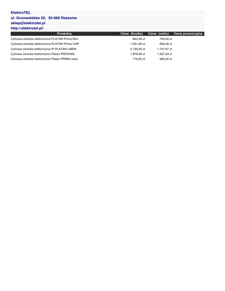 ElektroTEL ul. Grunwaldzka 20, 35-068 Rzeszów [email protected] http://elektrotel.pl/ Produkty Cyfrowa centrala telefoniczna PLATAN Prima Mini Cena (brutto) Cena (netto) 863,46 zł 702,00 zł Cyfrowa centrala telefoniczna PLATAN Prima VoIP 1.051,65 zł 855,00 zł Cyfrowa centrala telefoniczna IP PLATAN LIBRA 2.150,00 zł 1.747,97 zł Cyfrowa centrala telefoniczna Platan PROXIMA 1.879,00 zł 1.527,64 zł 719,55 zł 585,00 zł Cyfrowa centrala telefoniczna Platan PRIMA nano Cena promocyjna