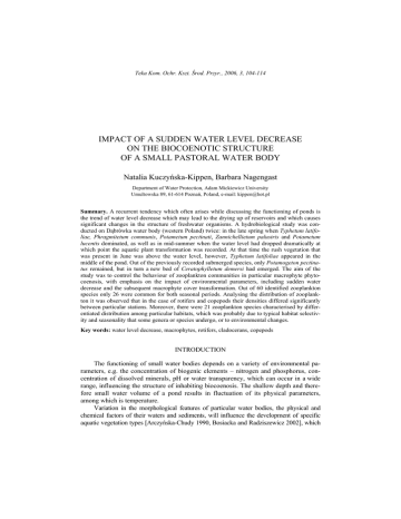 Teka Kom. Ochr. Kszt. Środ. Przyr., 2006, 3, 104-114 IMPACT OF A SUDDEN WATER LEVEL DECREASE ON THE BIOCOENOTIC STRUCTURE OF A SMALL PASTORAL WATER BODY Natalia Kuczyńska-Kippen, Barbara Nagengast Department of Water Protection, Adam Mickiewicz University Umultowska 89, 61-614 Poznań, Poland, e-mail: [email protected] Summary. A recurrent tendency which often arises while discussing the functioning of ponds is the trend of water level decrease which may lead to the drying up of reservoirs and which causes significant changes in the structure of freshwater organisms. A hydrobiological study was conducted on Dąbrówka water body (western Poland) twice: in the late spring when Typhetum latifoliae, Phragmitetum communis, Potametum pectinati, Zannichellietum palustris and Potametum lucentis dominated, as well as in mid-summer when the water level had dropped dramatically at which point the aquatic plant transformation was recorded. At that time the rush vegetation that was present in June was above the water level, however, Typhetum latifoliae appeared in the middle of the pond. Out of the previously recorded submerged species, only Potamogeton pectinatus remained, but in turn a new bed of Ceratophylletum demersi had emerged. The aim of the study was to control the behaviour of zooplankton communities in particular macrophyte phytocoenosis, with emphasis on the impact of environmental parameters, including sudden water decrease and the subsequent macrophyte cover transformation. Out of 60 identified zooplankton species only 26 were common for both seasonal periods. Analysing the distribution of zooplankton it was observed that in the case of rotifers and copepods their densities differed significantly between particular stations. Moreover, there were 21 zooplankton species characterised by differentiated distribution among particular habitats, which was probably due to typical habitat selectivity and seasonality that some genera or species undergo, or to environmental changes. Key words: water level decrease, macrophytes, rotifers, cladocerans, copepods INTRODUCTION The functioning of small water bodies depends on a variety of environmental parameters, e.g. the concentration of biogenic elements – nitrogen and phosphorus, concentration of dissolved minerals, pH or water transparency, which can occur in a wide range, influencing the structure of inhabiting biocoenosis. The shallow depth and therefore small water volume of a pond results in fluctuation of its physical parameters, among which is temperature. Variation in the morphological features of particular water bodies, the physical and chemical factors of their waters and sediments, will influence the development of specific aquatic vegetation types [Arczyńska-Chudy 1990, Bosiacka and Radziszewicz 2002], which IMPACT OF A SUDDEN WATER LEVEL DECREASE ... 105 in turn will have an impact on the creation of specific communities of plankton organisms [Chmielewski 1990]. In vegetated stands zooplankton actively searches for concealment against predators, both invertebrate and young stages of fish [Williamson 1983a, b, Telesh 1993]. Furthermore, in the macrophyte bed, apart from phytoplankton which can create a nutritional food source, it can also find great amounts of detritus, protozoans and bacteria [Moore et al. 1994, Jürgens et al. 1994, Theil-Nielsen and Søndergaard 1999]. In small water bodies the following types of macrophytes can be present – rush vegetation, submerged, floating leaved or pleustophytes. However, macrophytes create here a mosaic structure [Ozimek and Rybak 1994], where the life conditions remain littoral as in lakes. Frequent tendency which often arises while discussing the functioning of ponds is the trend of the water level decrease which may lead to the drying up of water reservoirs and which causes significant changes in the structure of freshwater organisms. At the same time ponds play an important role in increasing local water retention, which is vital in areas with sparse water reserves [Ludden et al. 1983, Hubbard and Linder 1986]. Small water bodies contribute to the maintenance and enrichment of biodiversity, creating optimal living habitats for numerous groups of organisms [Hawksworth 1996]. They are also a link connecting the remaining types of water reservoirs, such as rivers and lakes, enabling the migration of species, both of flora and fauna. In literature there is a lot of data considering the zooplankton of ponds, however, the results of those analyses treat a water reservoir as a whole, unifying the differentiated areas into one point, which is usually the unvegetated part of the pond bed [Klimowicz 1970, EjsmontKarabin and Kuczyńska-Kippen 2001, Kuczyńska-Kippen 2001]. However, the functioning of small water bodies is not so simple and thus requires more attention, to be concentrated on variation in the physical-chemical changeability and development of differentiated types of aquatic vegetation. Hence, the aim of the study was to control the behaviour of zooplankton communities in particular macrophyte phytocoenosis, with emphasis on the impact of environmental parameters connected with sudden water decrease. Additionally, it was planned to describe the habitat preferences of particular species. STUDY AREA, MATERIALS AND METHODS The Dąbrówka water body, situated in central part of the Wielkopolska region, western Poland, about 10 km west from the border of the city of Poznań, is a shallow, macrophyte-dominated pond (surface area – 0.5 ha, maximum depth – 1.5 m). It is located at the edge of the village of Dąbrówka, partly surrounded by fields. It has a treelined circumference with dominating Alnus glutinosa (L.) Gaertn. The research was carried out twice: in late spring time (22nd June) and in the middle stage of the summer period (25th August). Zooplankton material was taken in triplicate at each site using a plexiglass core sampler (∅ 50 mm), which is the method advised for 